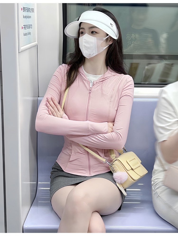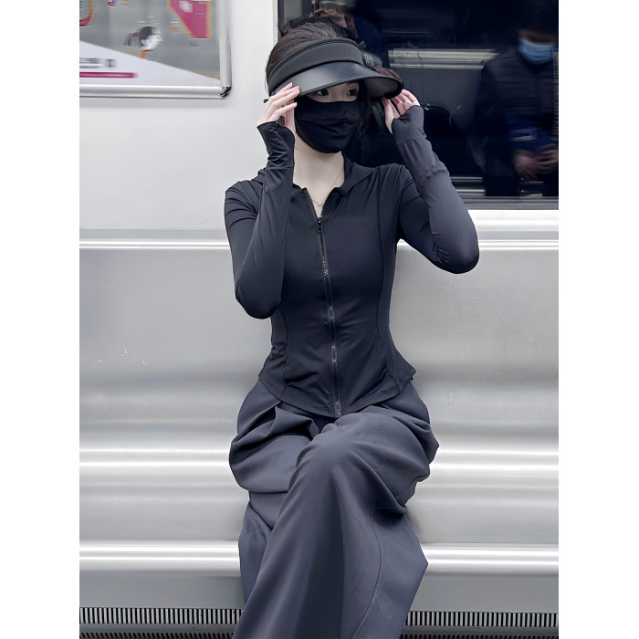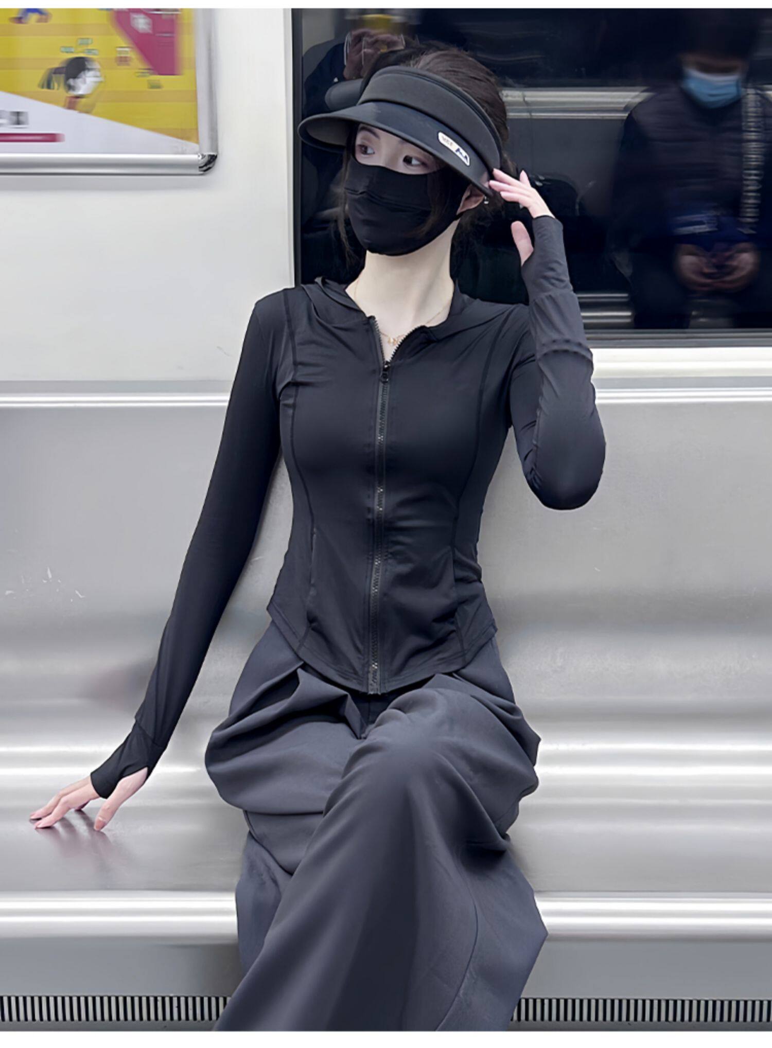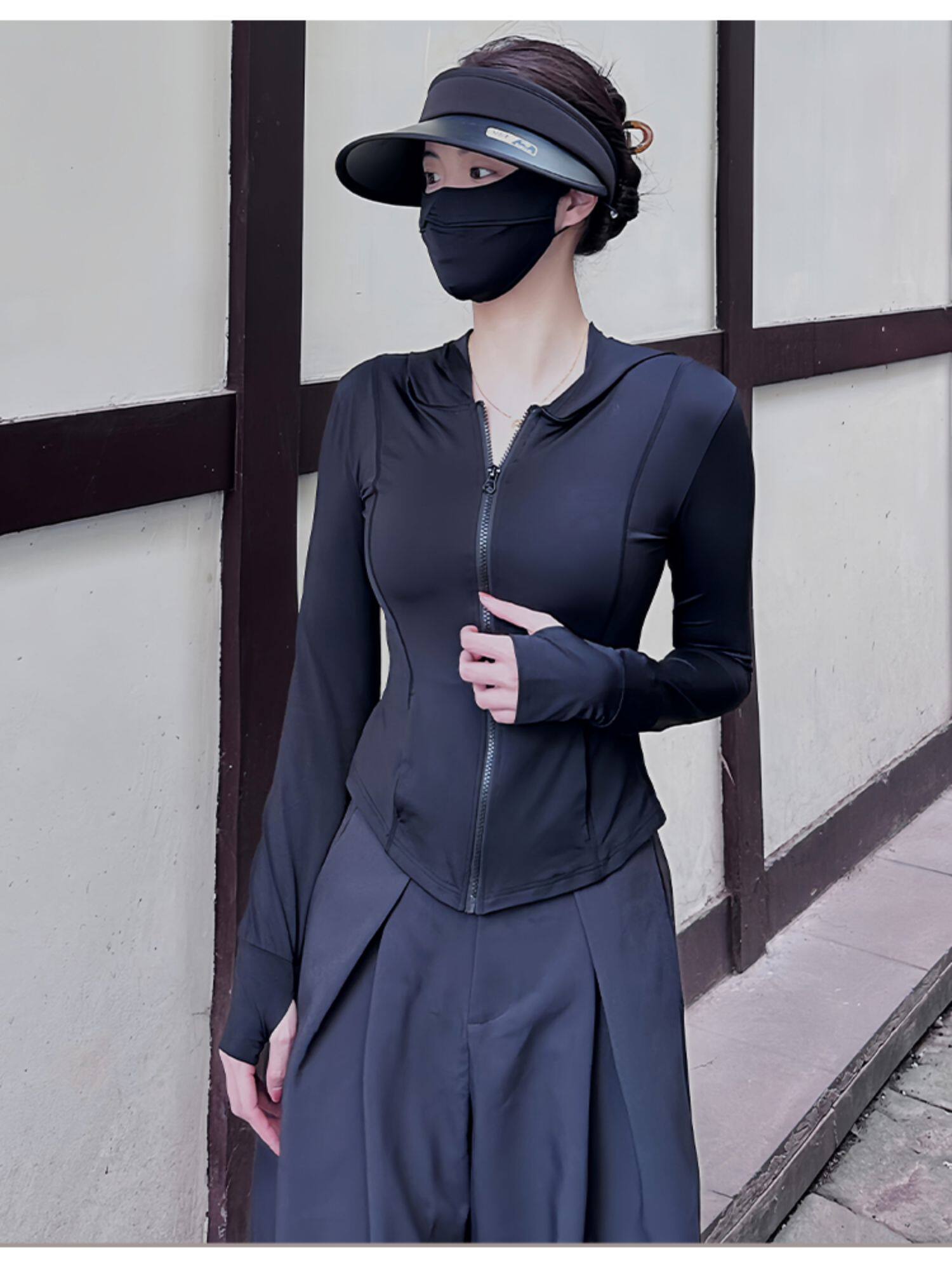 黑色連帽冰絲防曬衣女款夏薄款戶外防紫外線防曬服修身短外套上衣