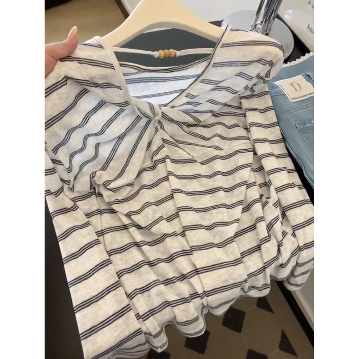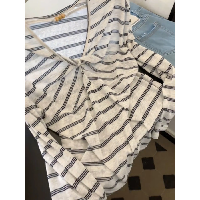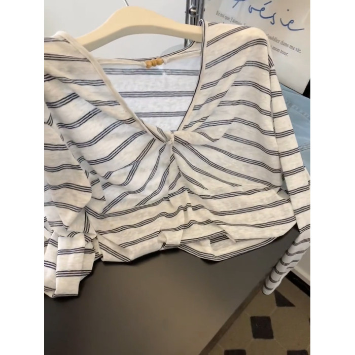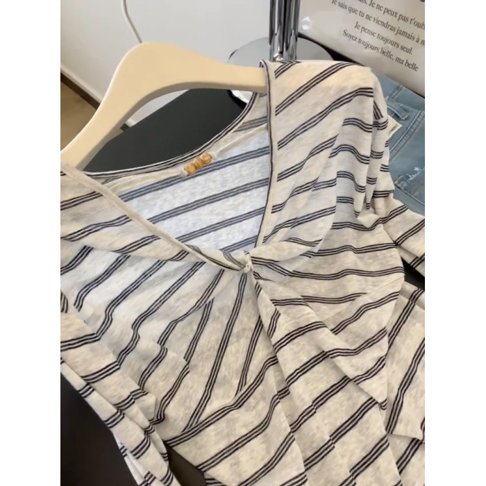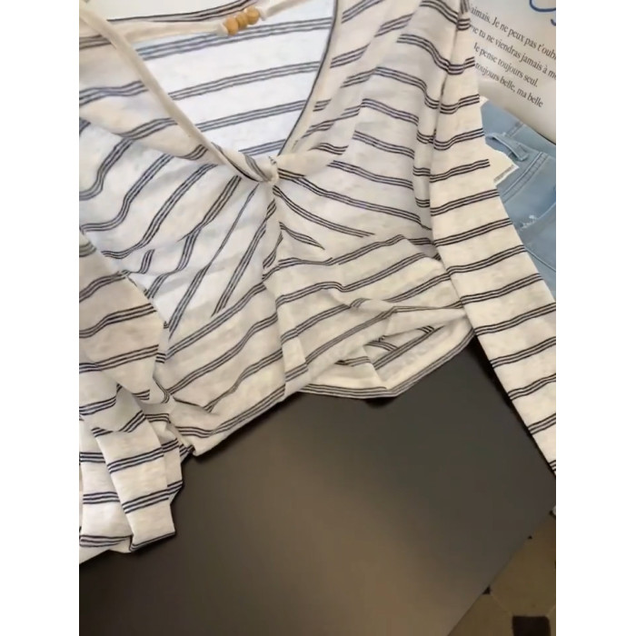 韓系條紋早秋罩衫女夏季2025新款設計感扭結露背寬鬆顯瘦長袖上衣