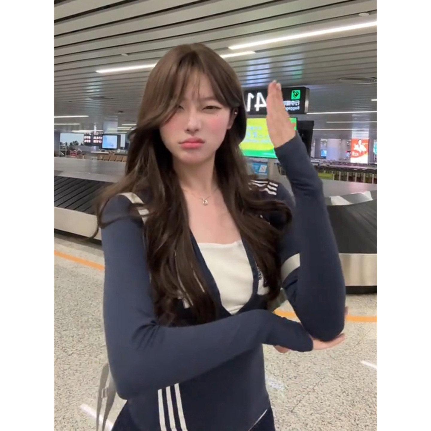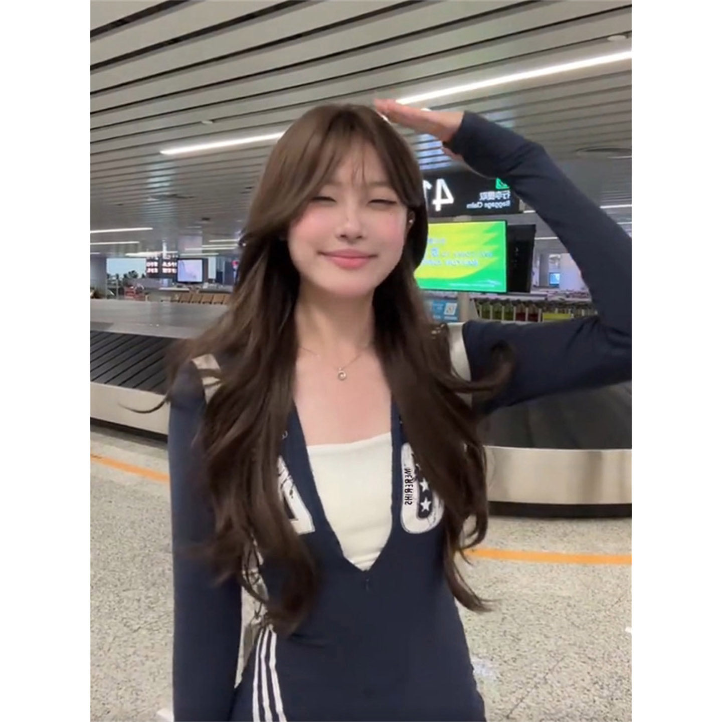 美式藏青色字母印花氣質v領長袖防曬罩衫女夏季修身辣妹t恤上衣潮