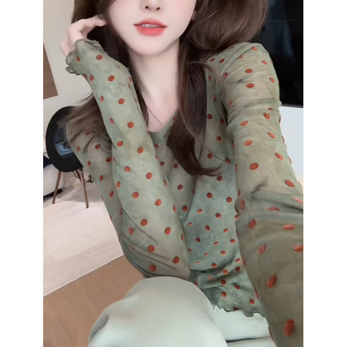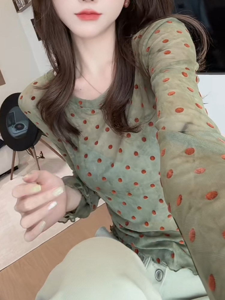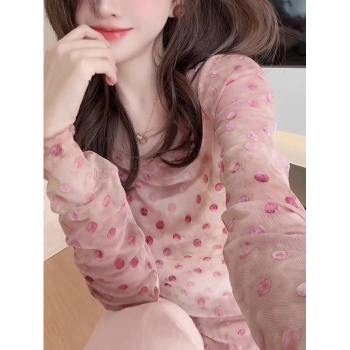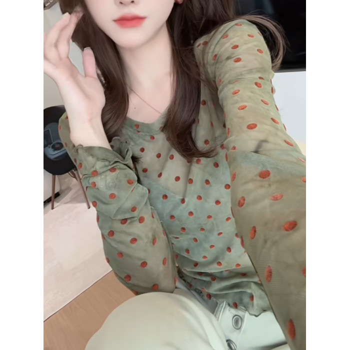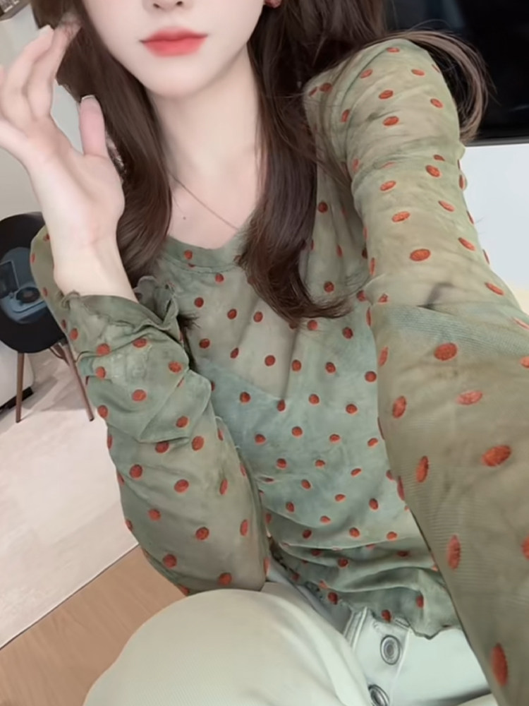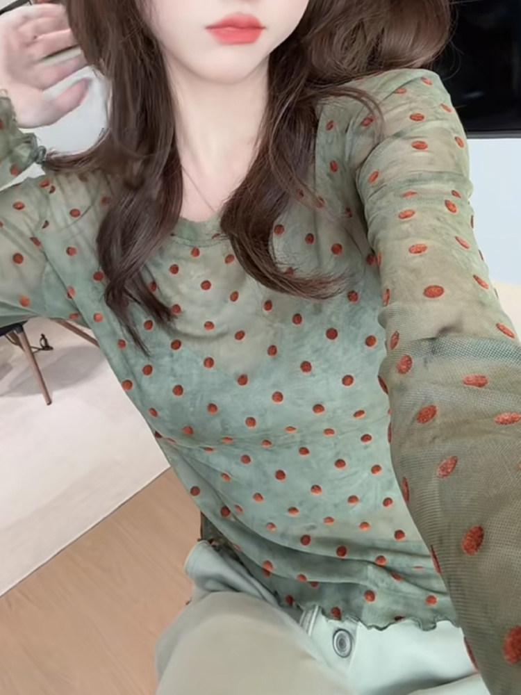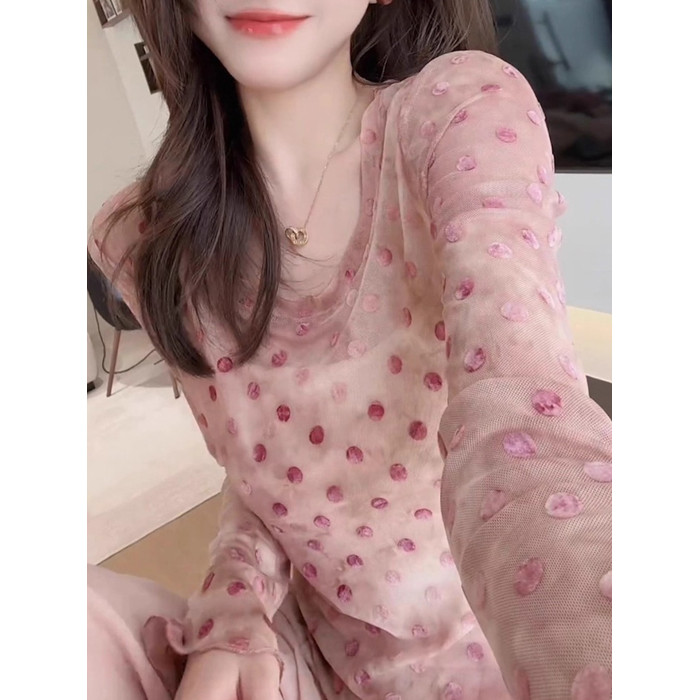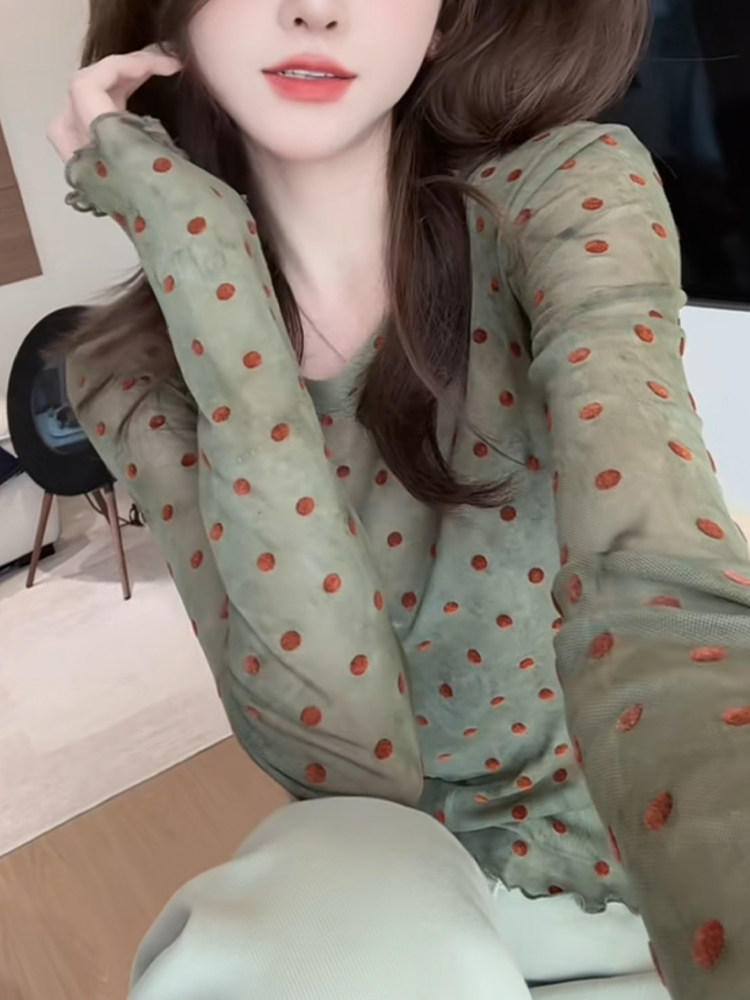 輕薄波點微透防曬上衣2025夏季顯白減齡長袖圓領t恤別致優雅小衫