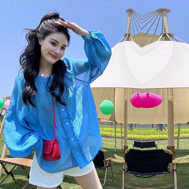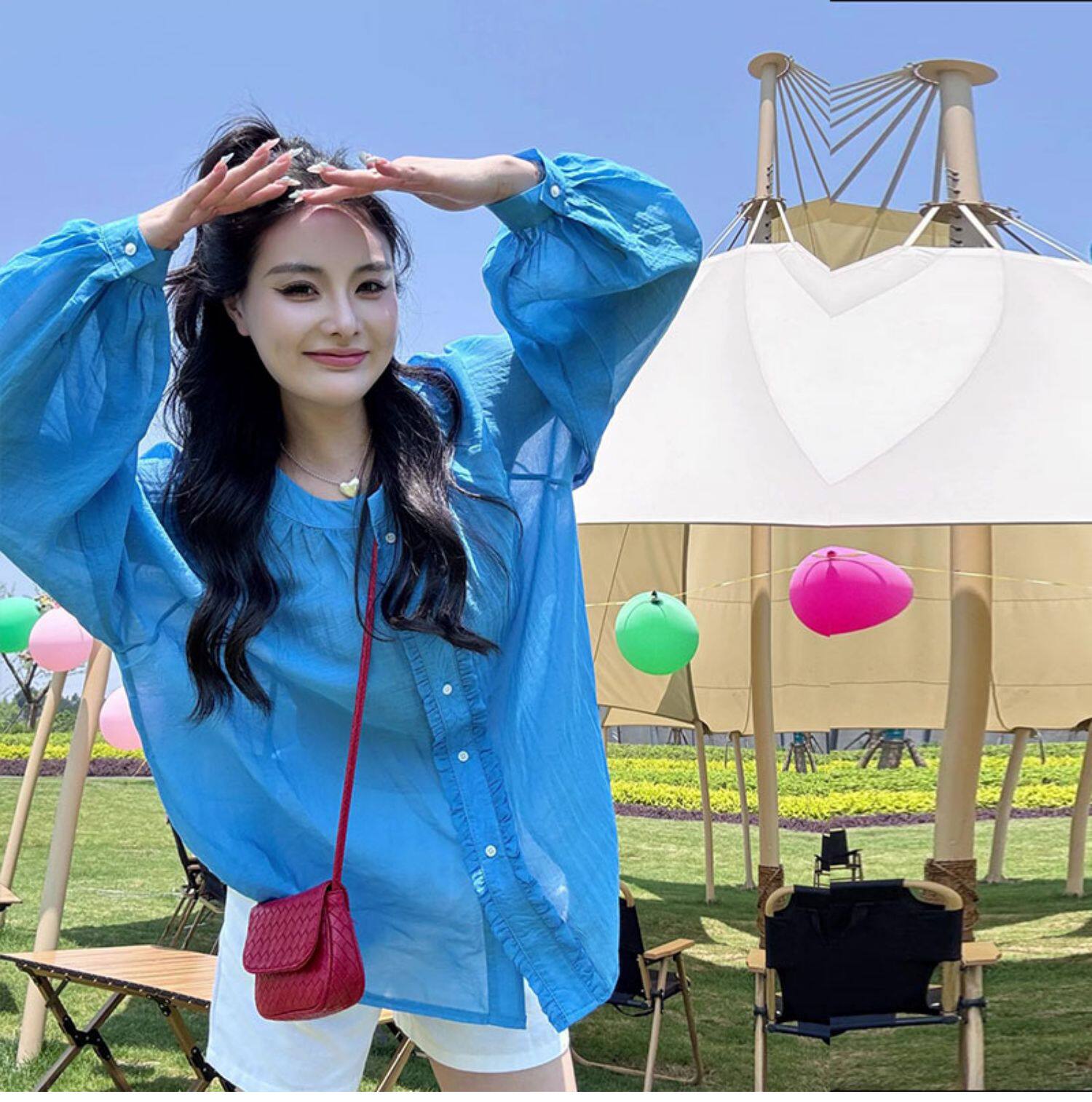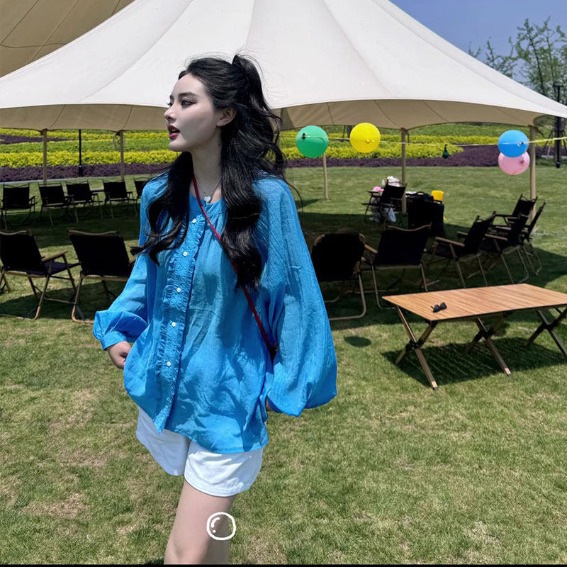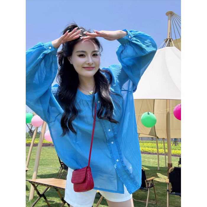 法式氣質藍色防曬衣女夏季2025新款高級感時尚百搭薄款罩衫上衣女