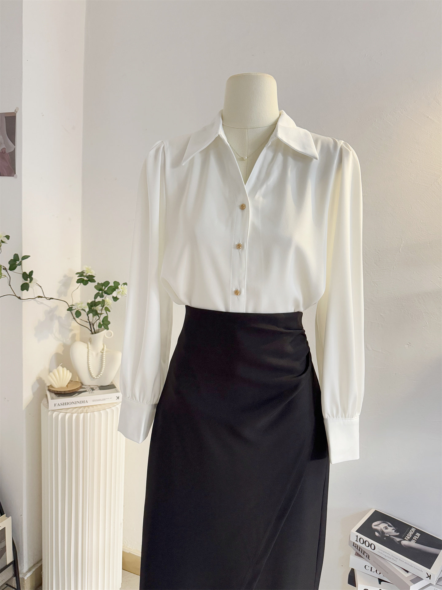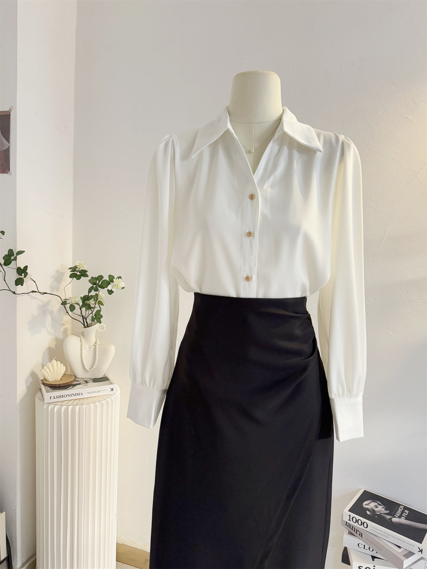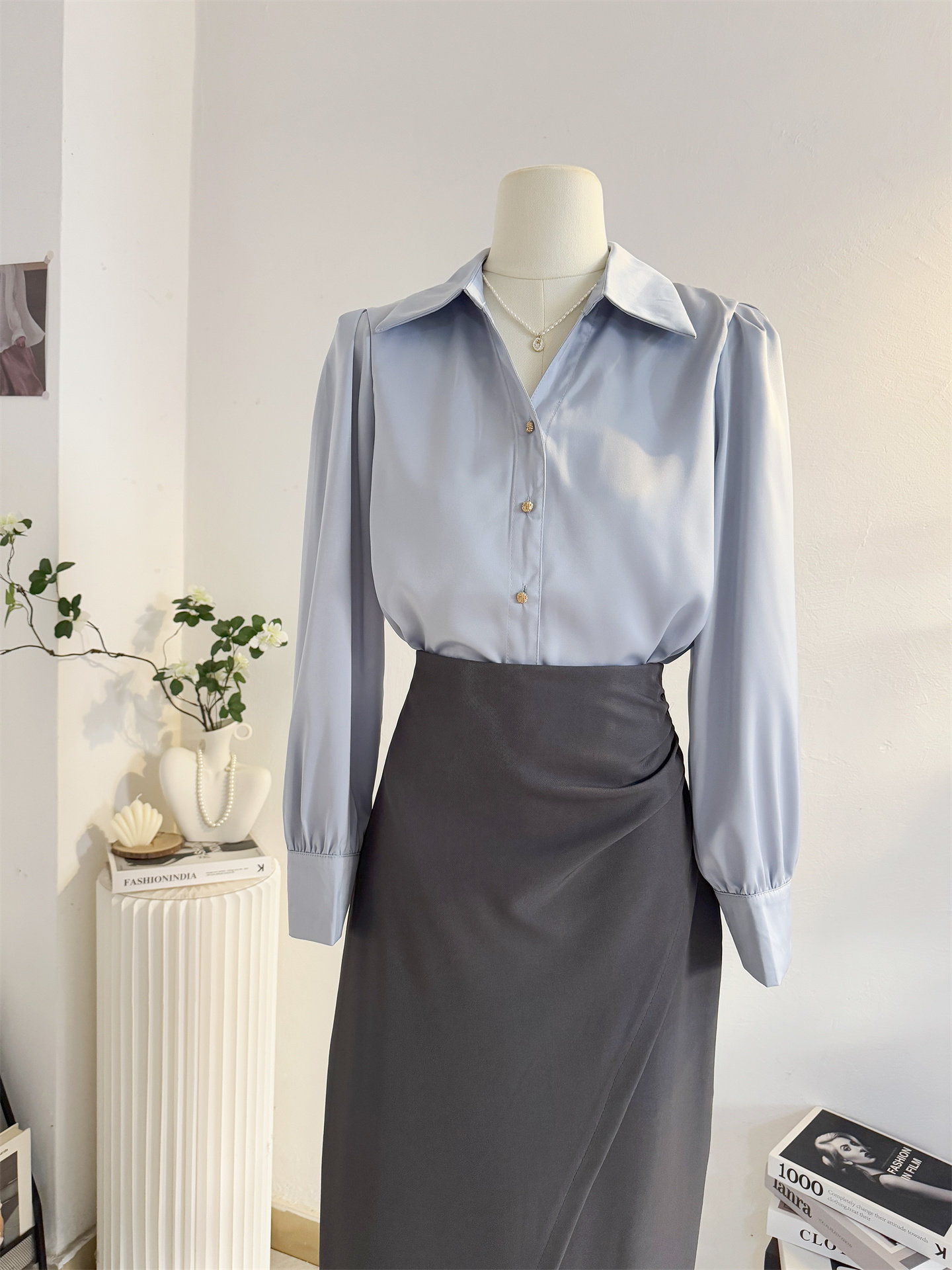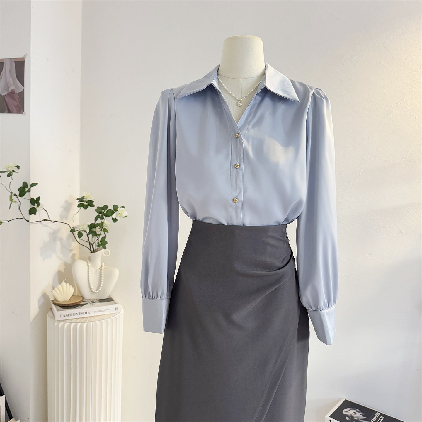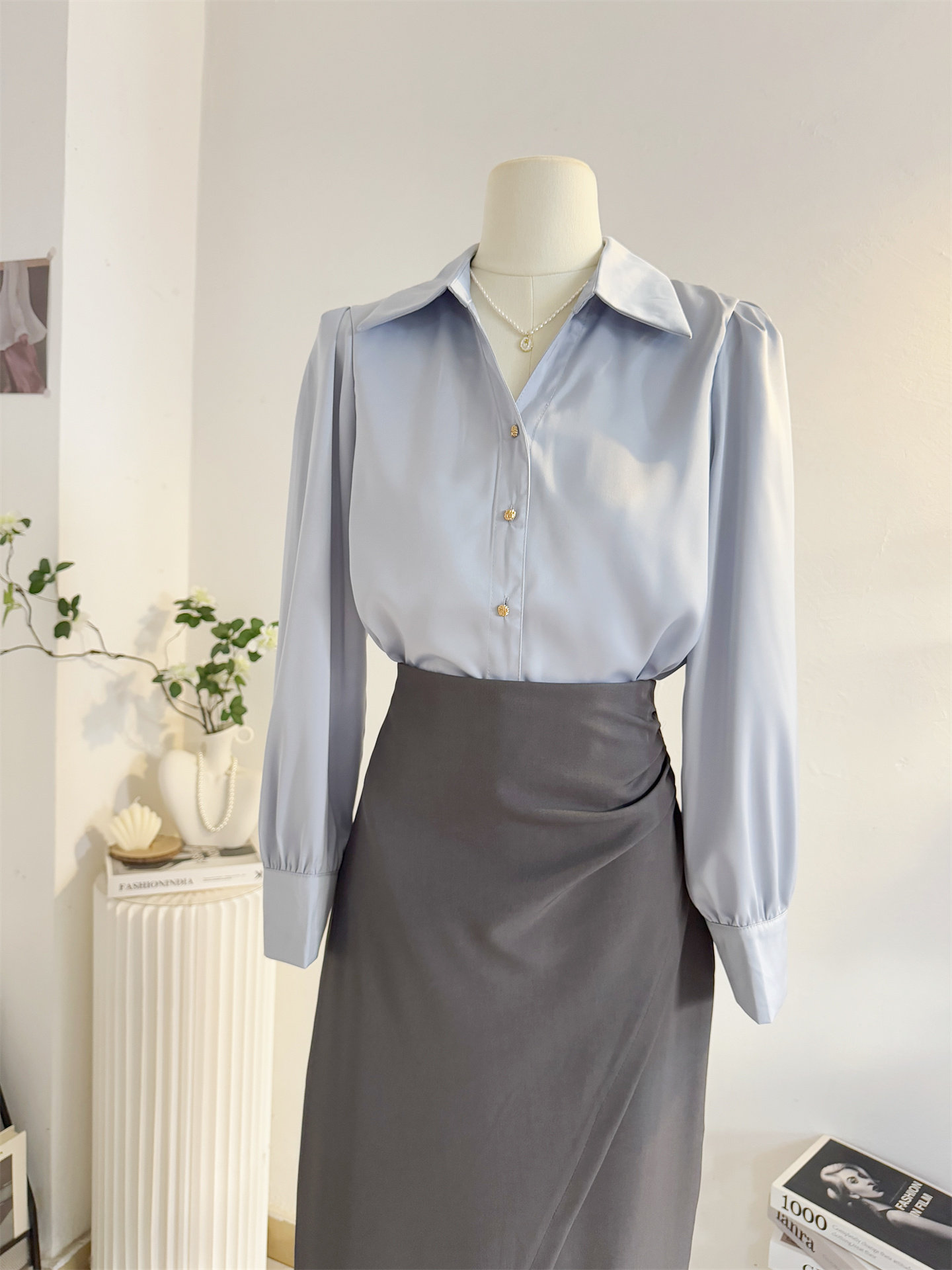 法式V領緞面長袖襯衫女2025秋季設計感氣質通勤襯衣職業正裝面試