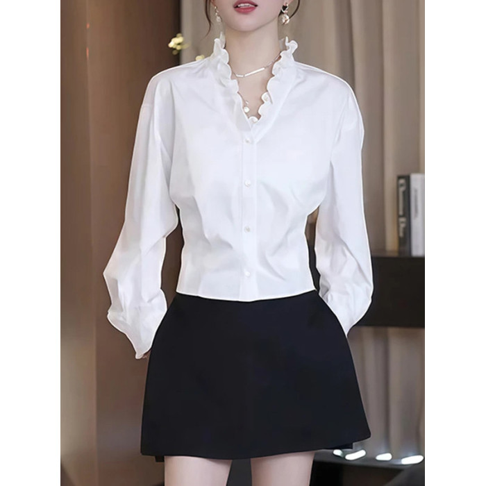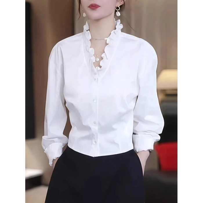 大碼白色荷葉邊v領長袖小衫襯衣女2026早春胖mm顯瘦遮肉漂亮襯衫