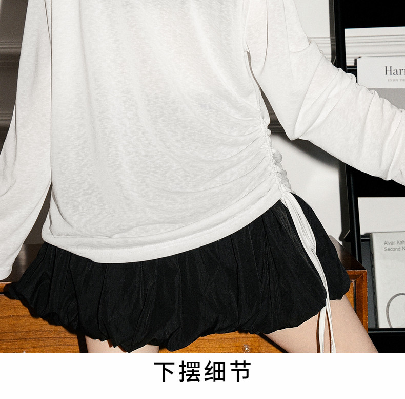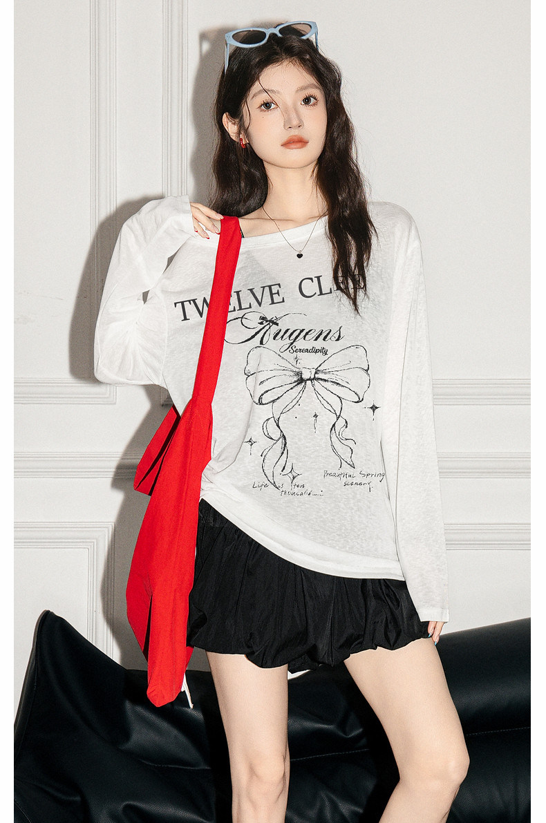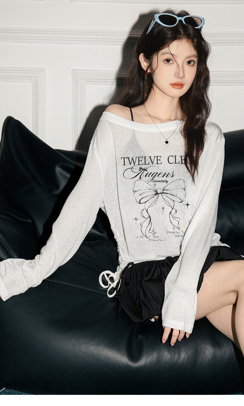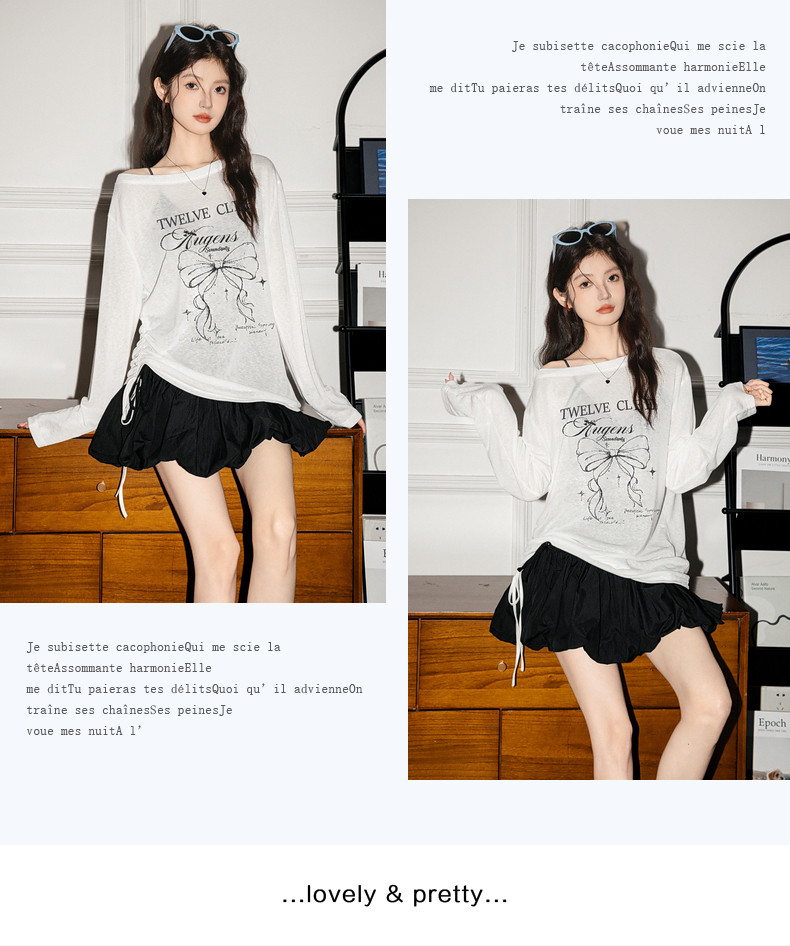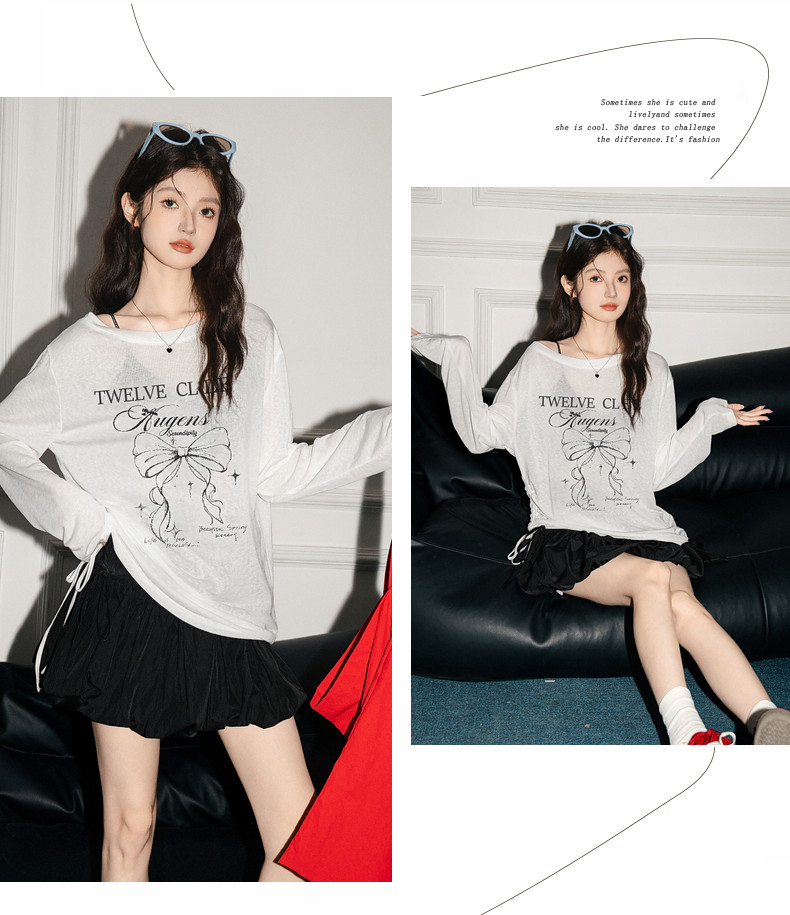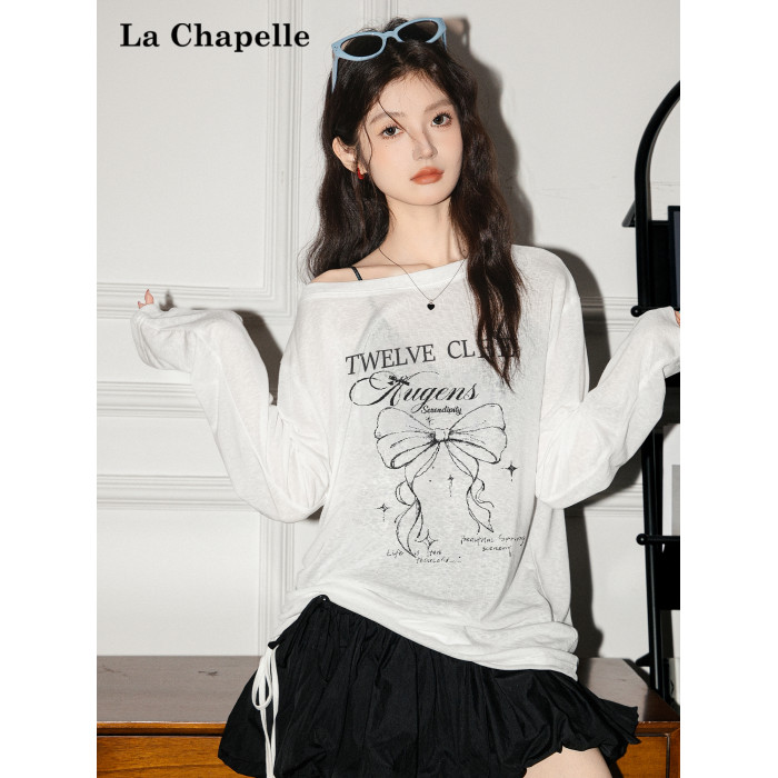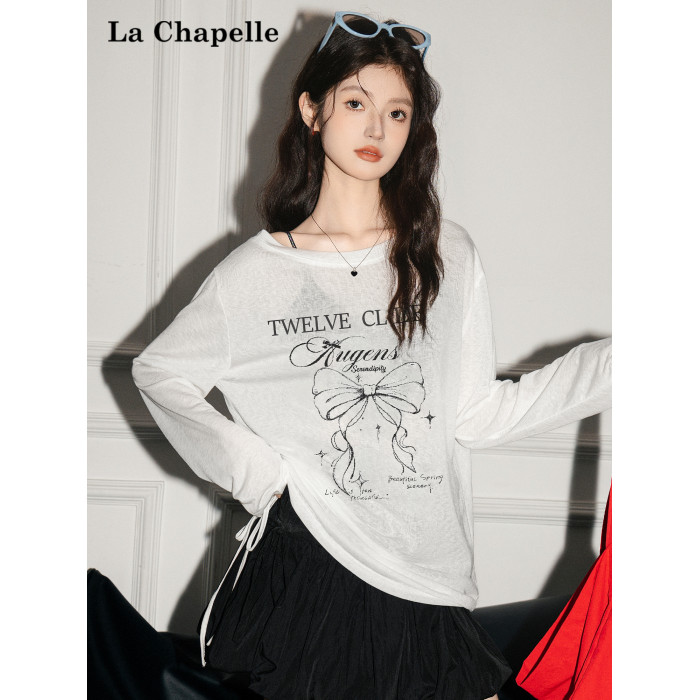 拉夏貝爾韓系印花寬鬆設計感罩衫抽褶微透顯瘦t恤女防曬長袖上衣
