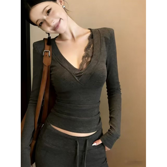 韓系性感V領蕾絲邊長袖t恤女秋冬高級感收腰辣妹內搭打底衫上衣甜