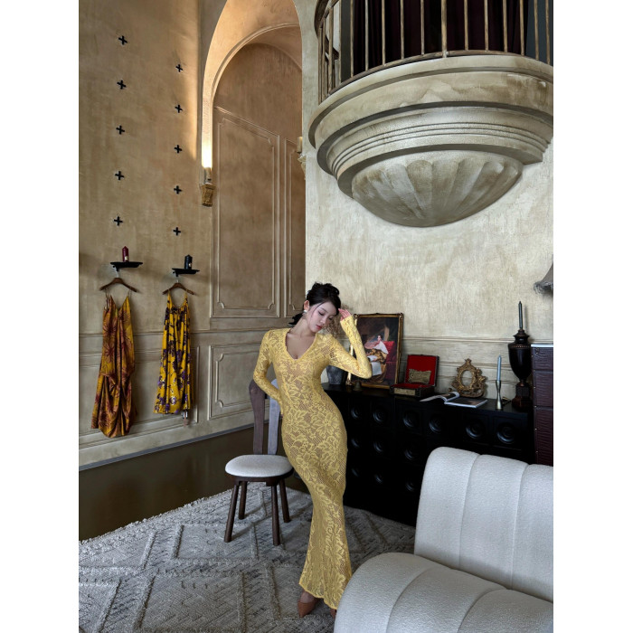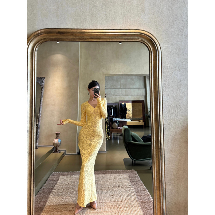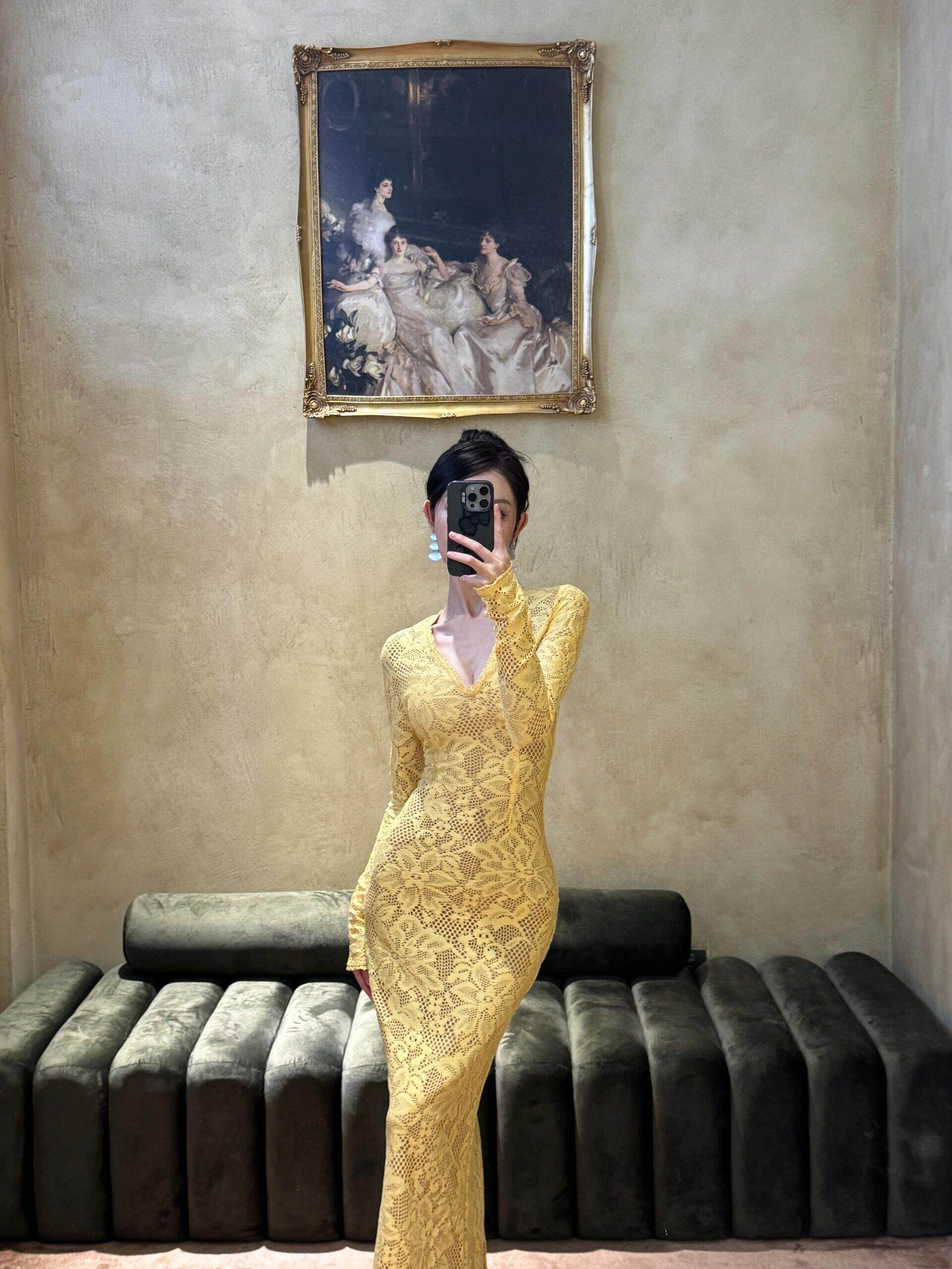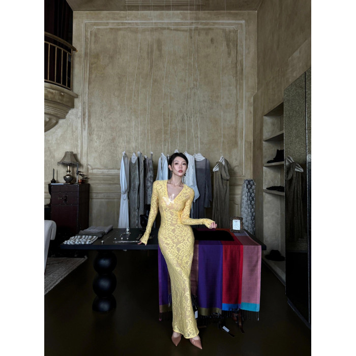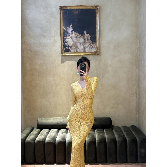 歐美辣妹風蕾絲花邊長袖V領連衣裙女秋季性感鏤空包臀長裙