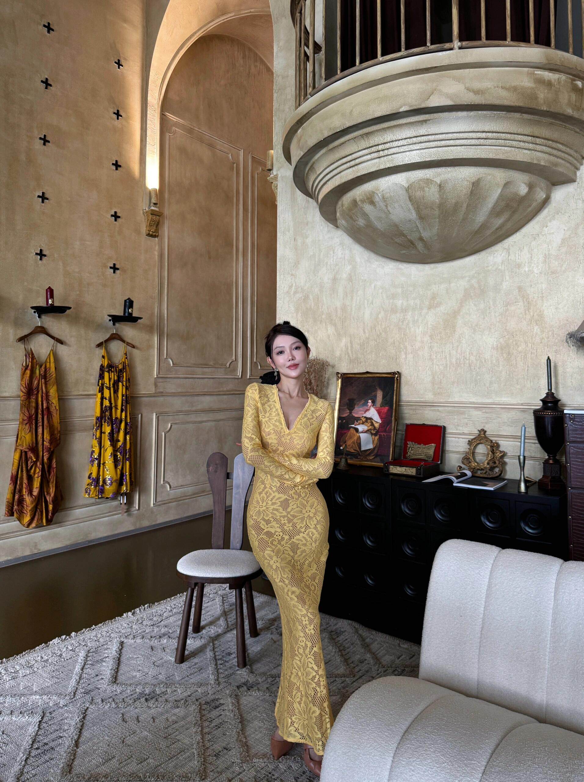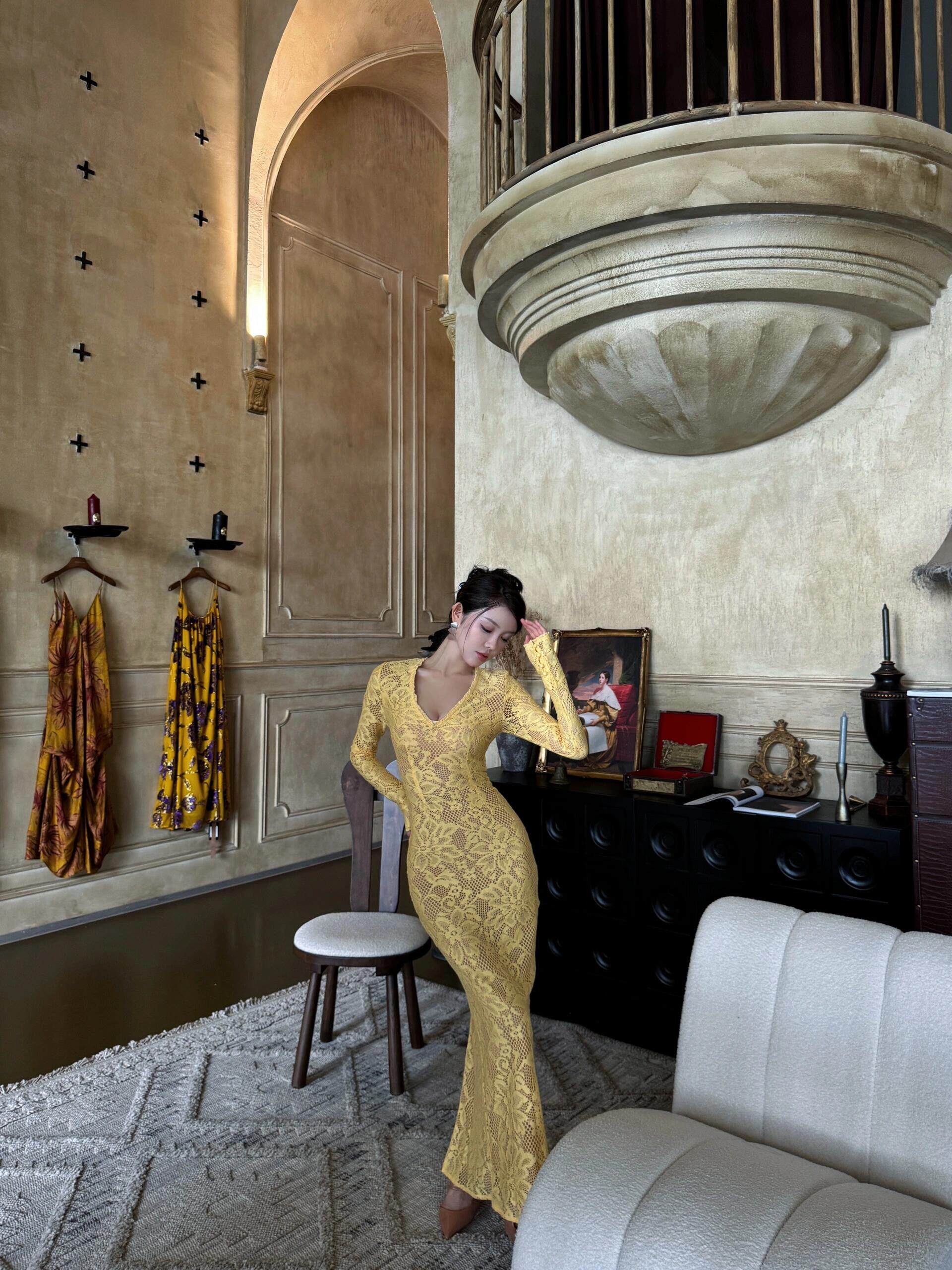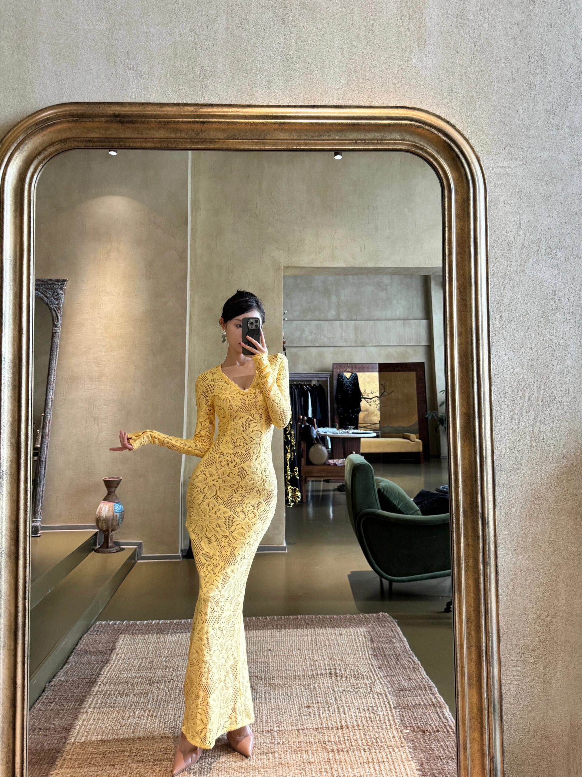 歐美辣妹風蕾絲花邊長袖V領連衣裙女秋季性感鏤空包臀長裙