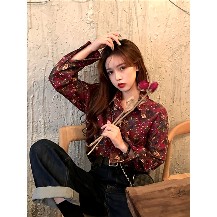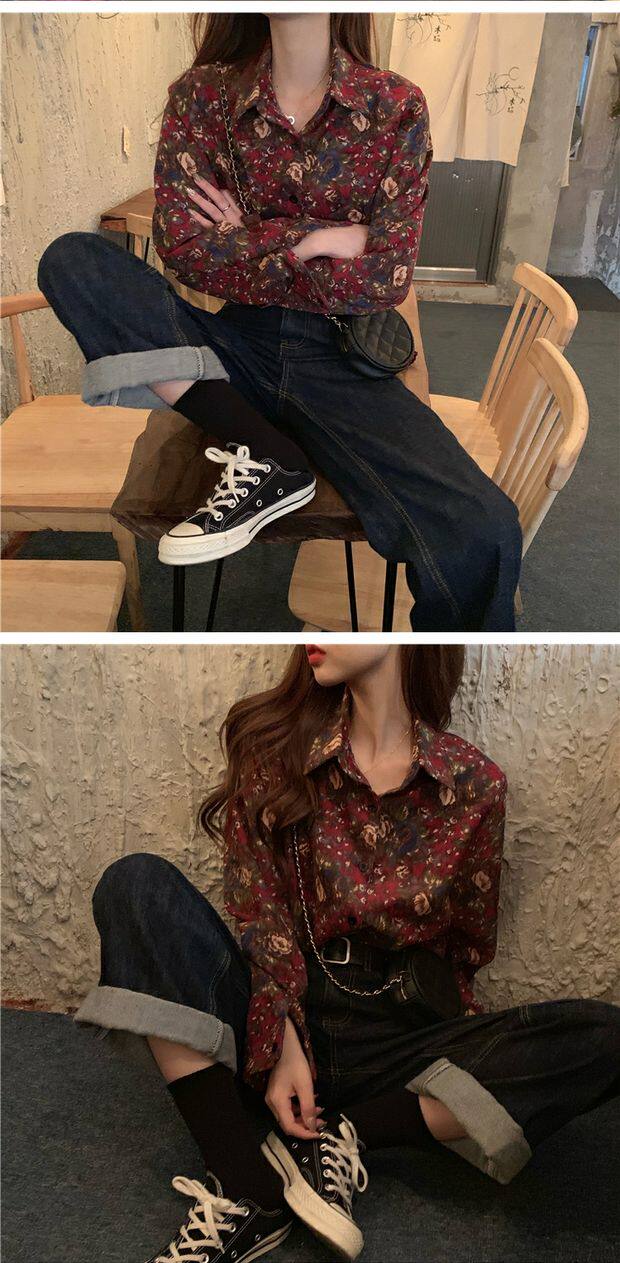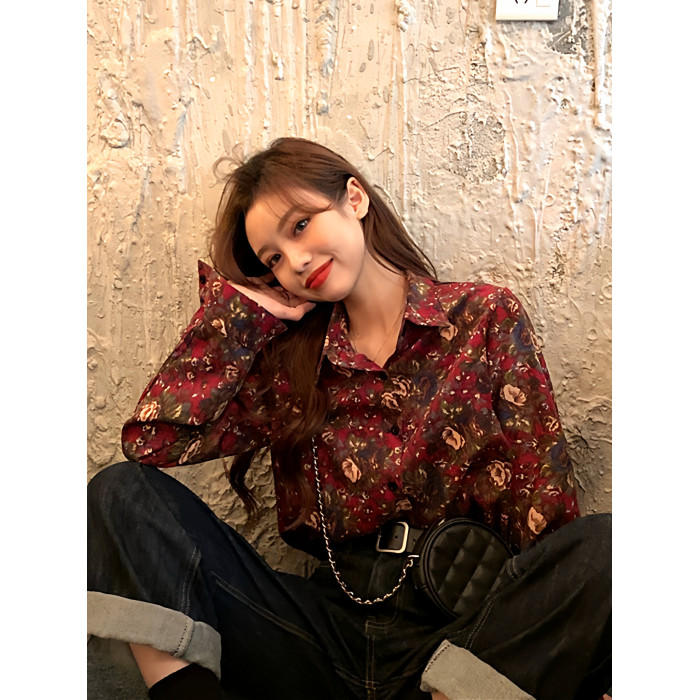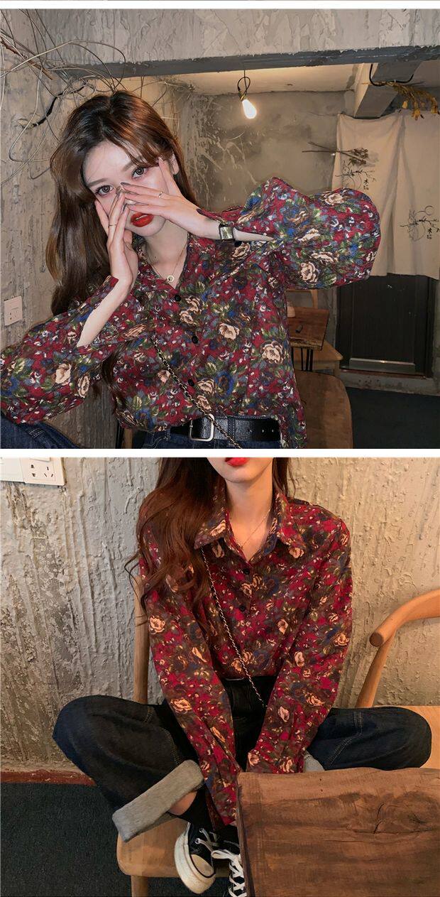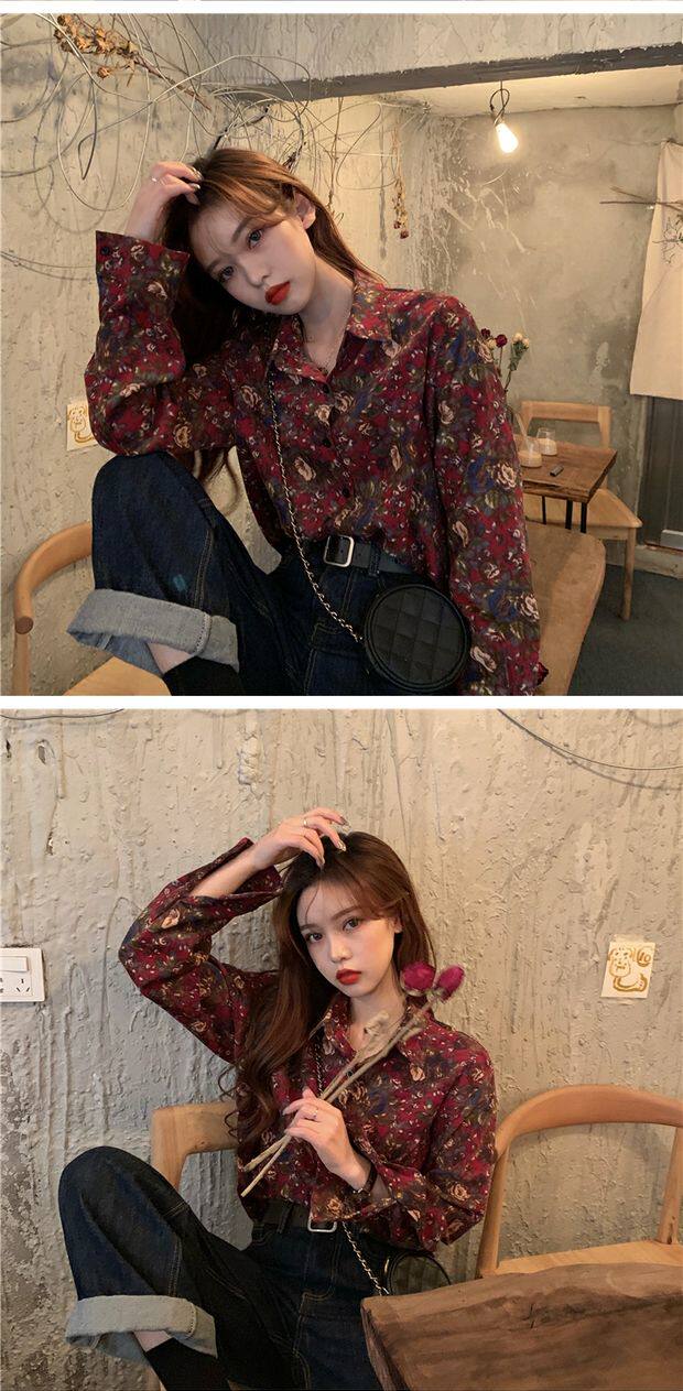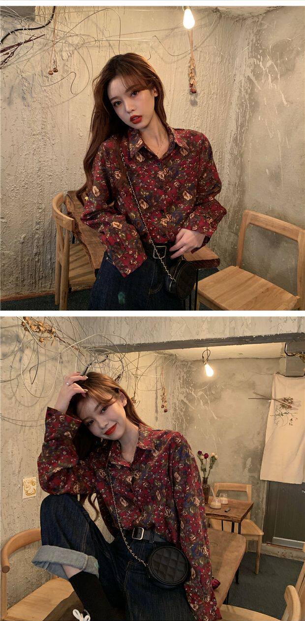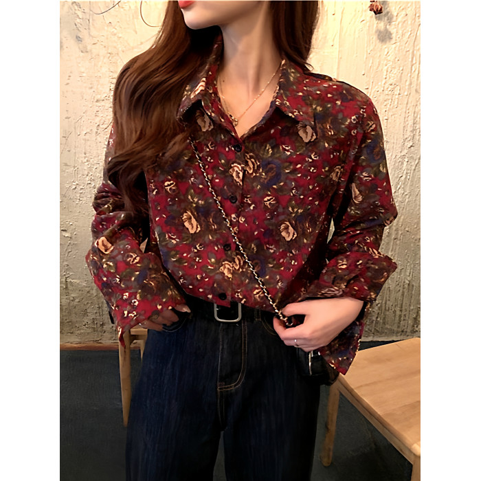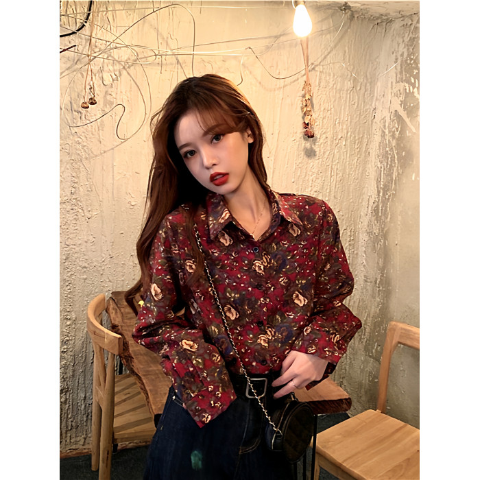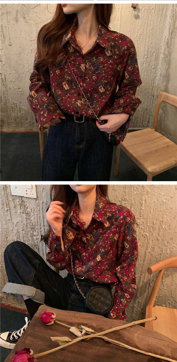 港味MAN風調調花花襯衫女小衆冷淡風復古法式燈芯絨氣質長袖襯衫