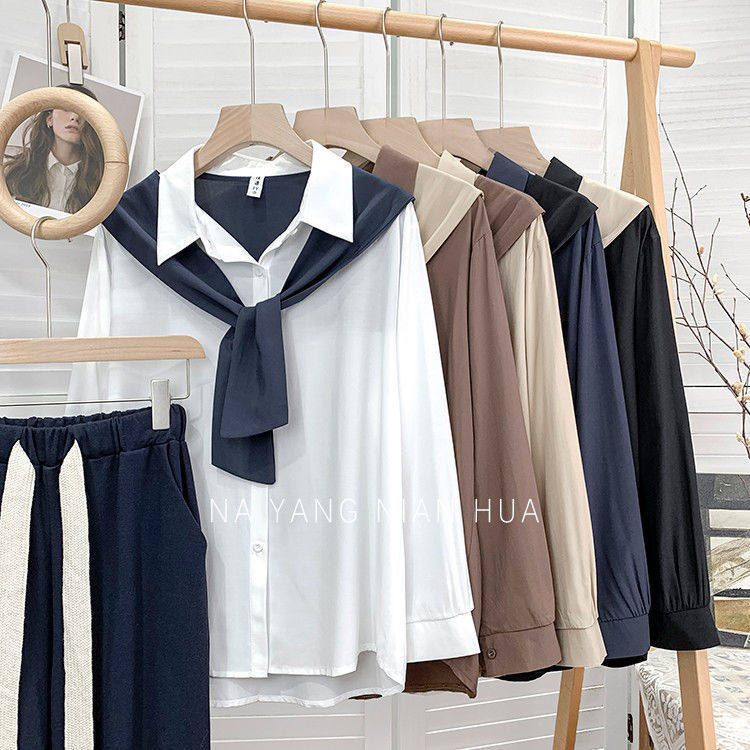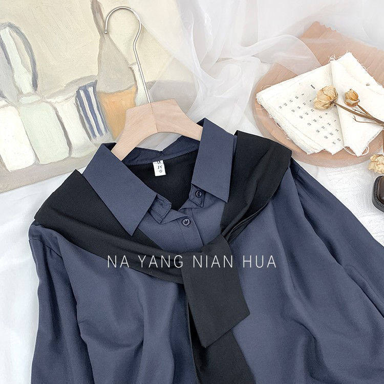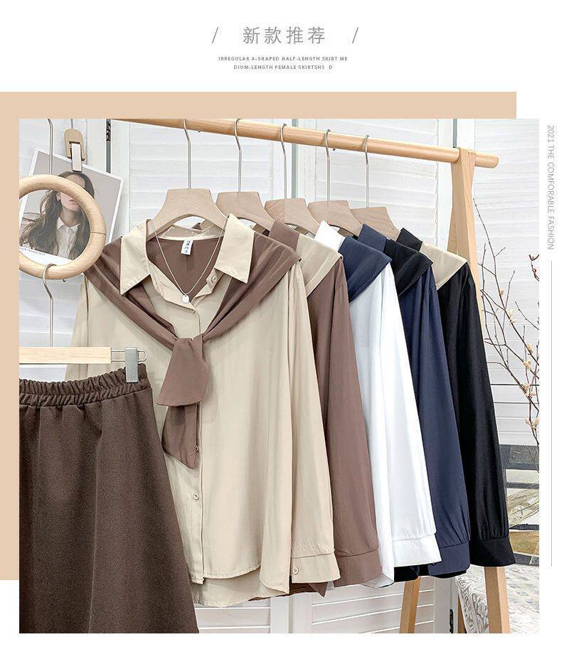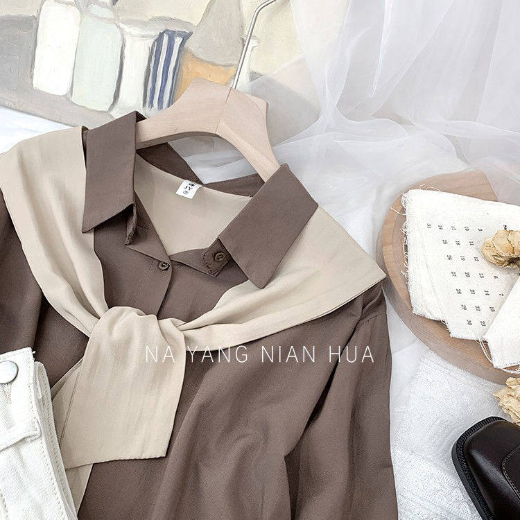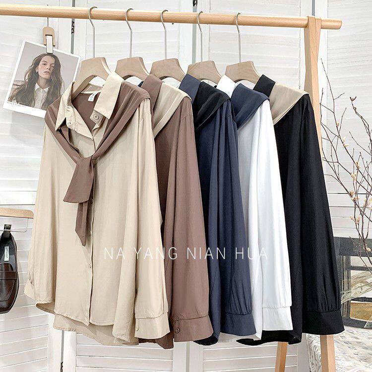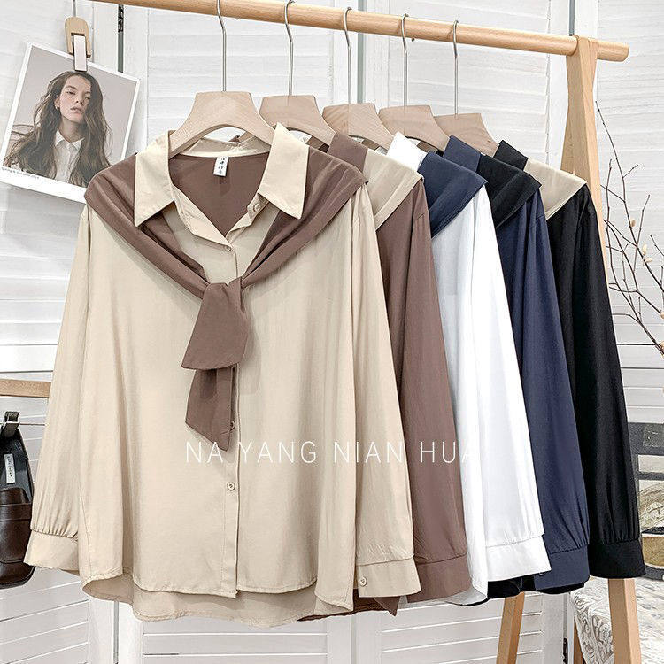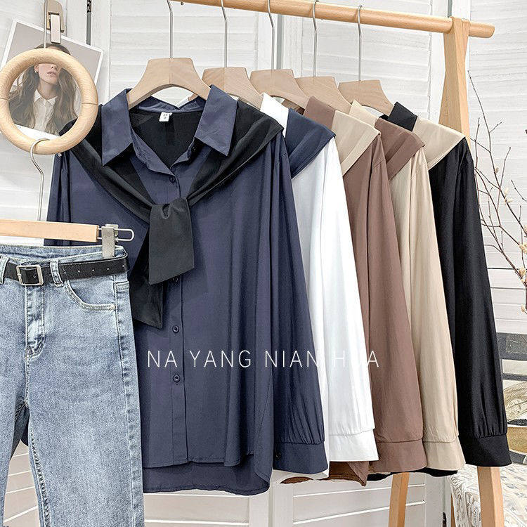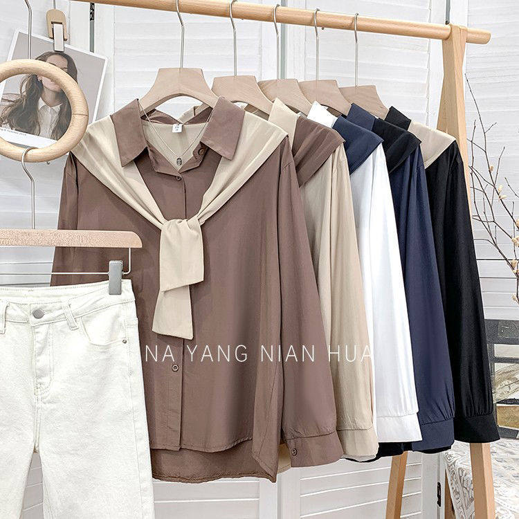 高級垂感寬鬆披肩假兩件長袖襯衫女秋設計感小衆別致外搭曡穿上衣