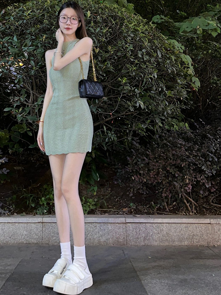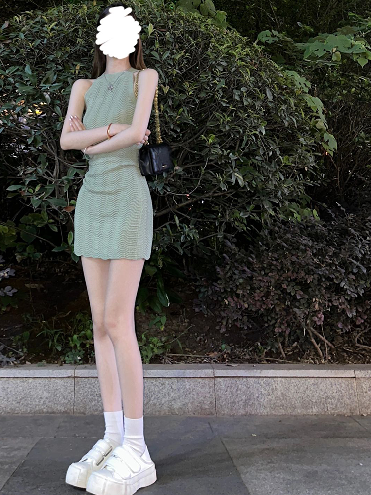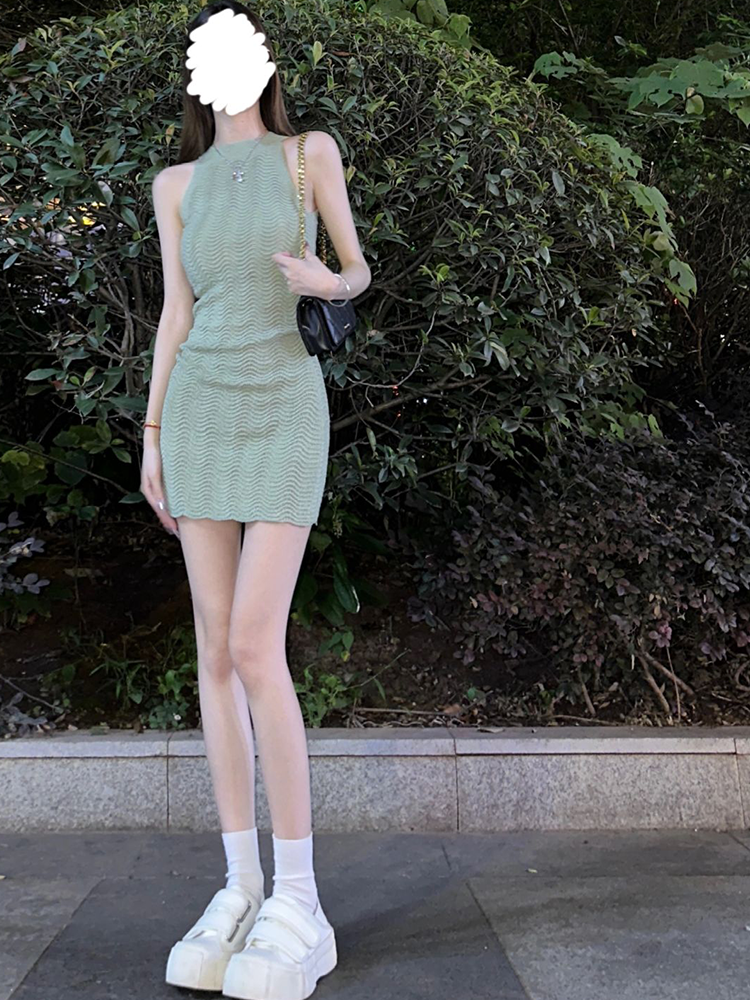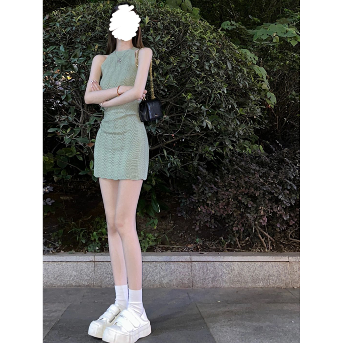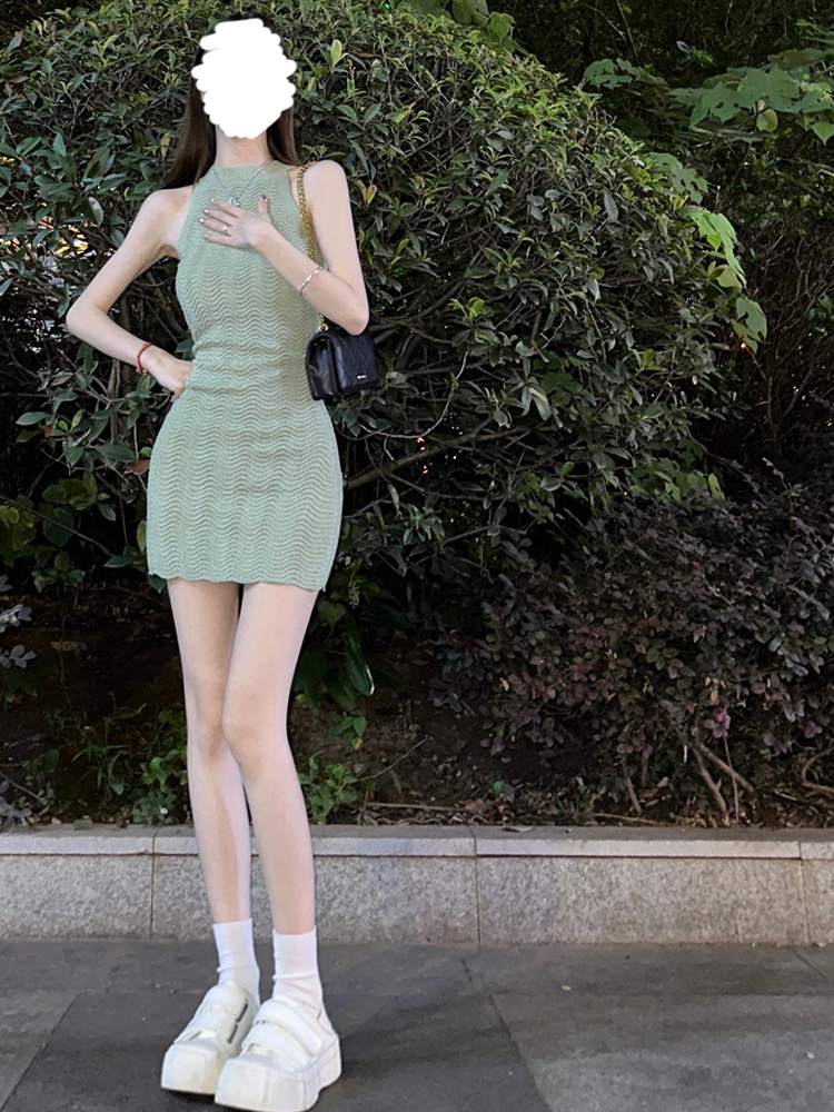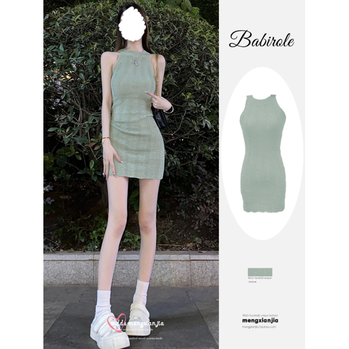 鹽系穿搭小個子顯身材掛脖連衣裙2025新款女裝波浪紋收腰包臀短裙