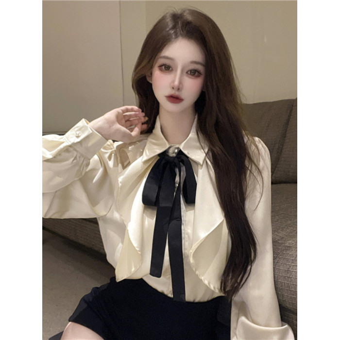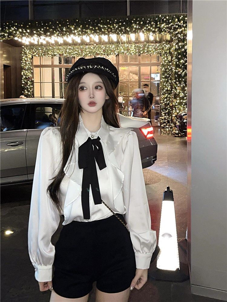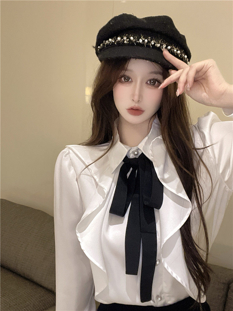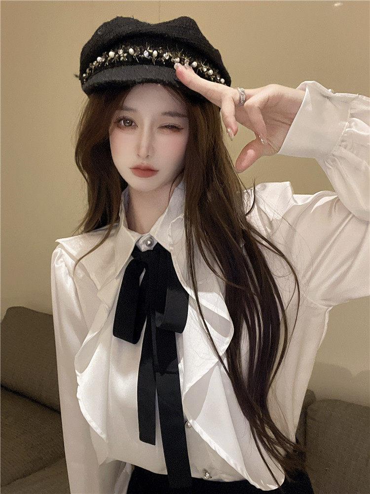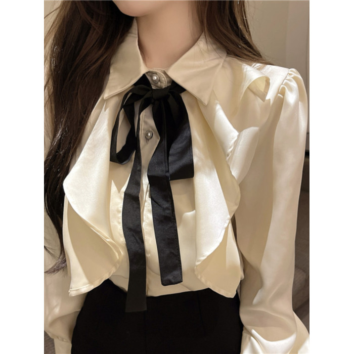 宮廷風襯衫女長袖蝴蝶結領帶繙領荷葉邊法式襯衣小衆別致上衣秋冬