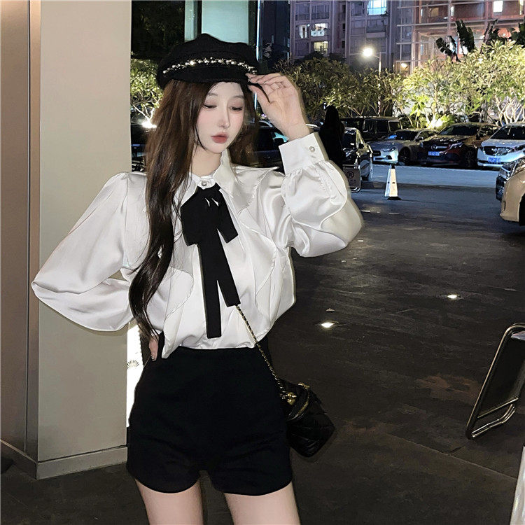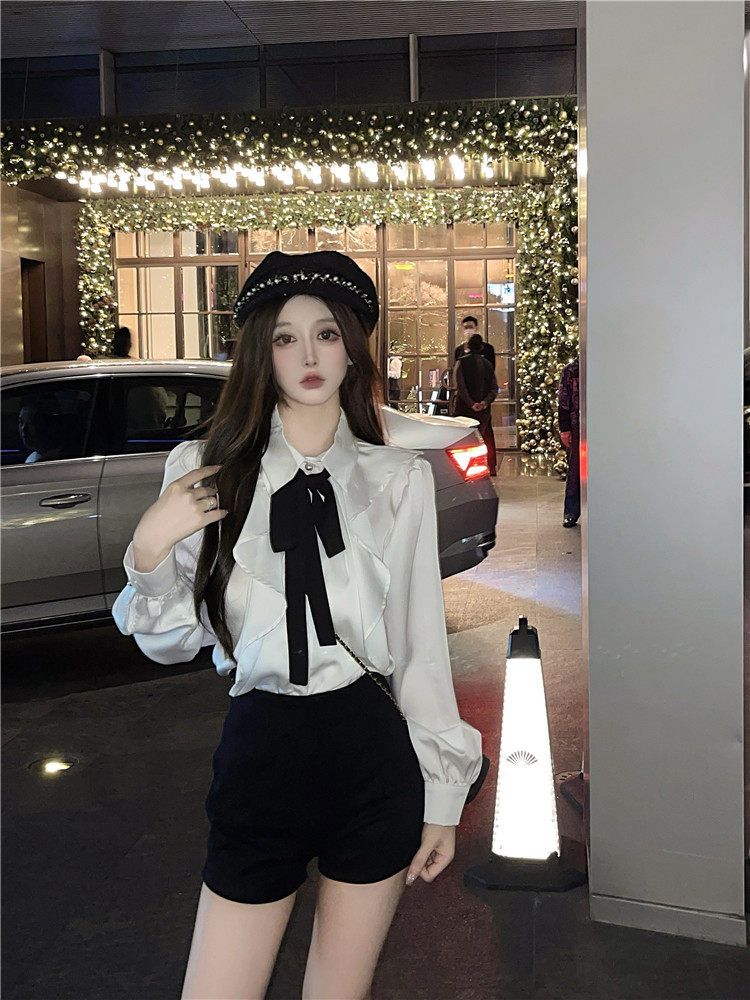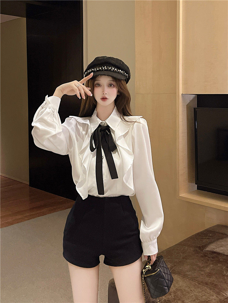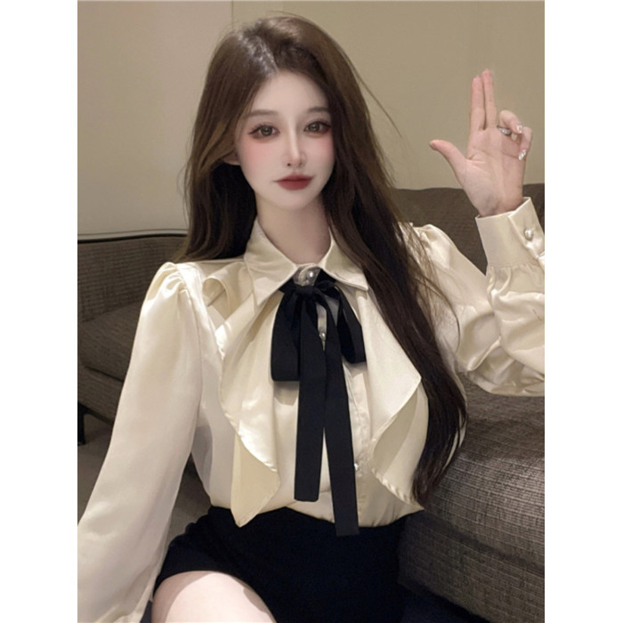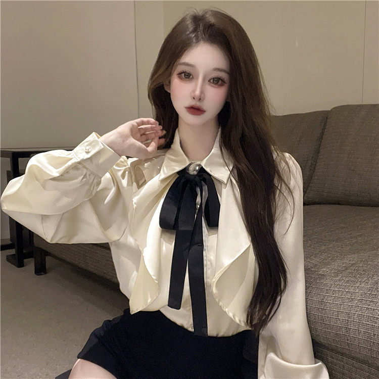 宮廷風襯衫女長袖蝴蝶結領帶繙領荷葉邊法式襯衣小衆別致上衣秋冬