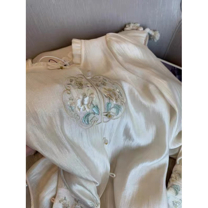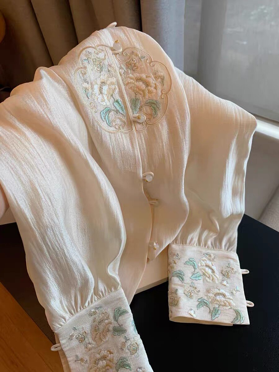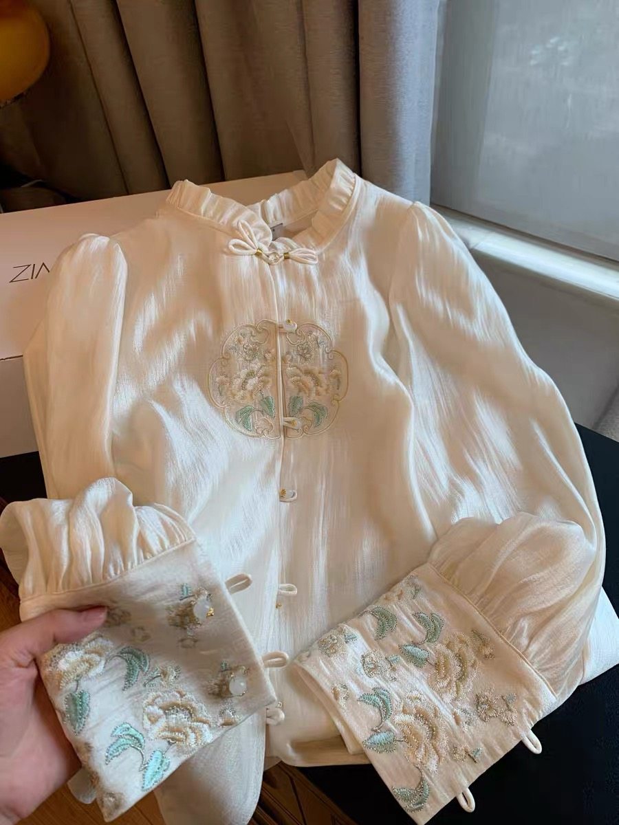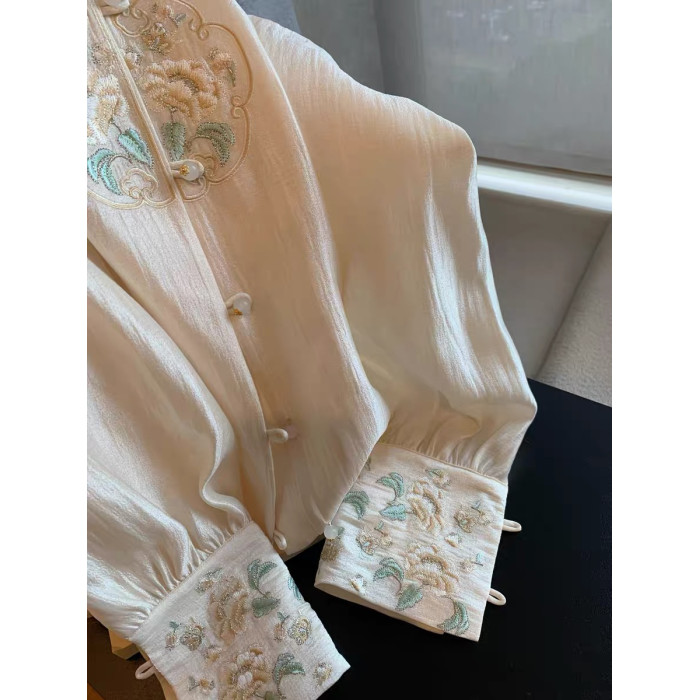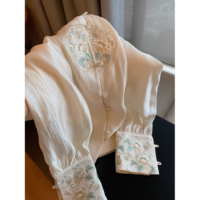 專櫃撤廻剪標新中式國風刺綉盤釦襯衫女春季新款高級名媛氣質上衣