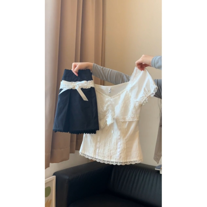 又甜又酷愛瘋了!夏季新款少女感蝴蝶結元素半身裙+襯衫兩件套裝