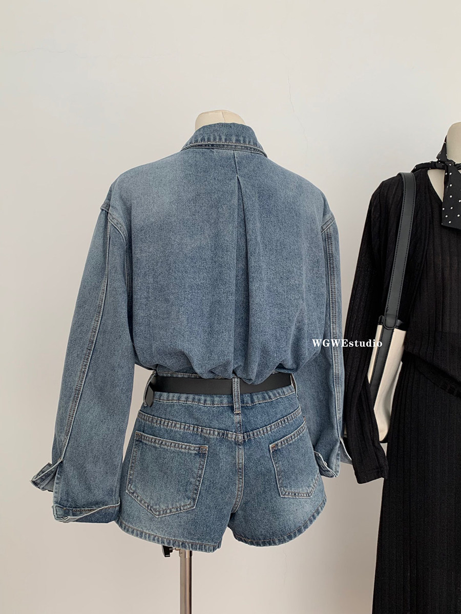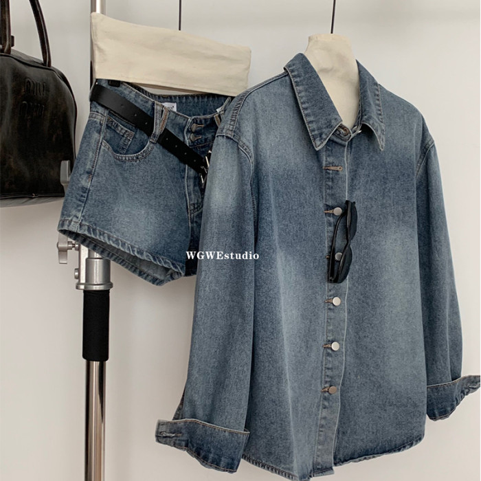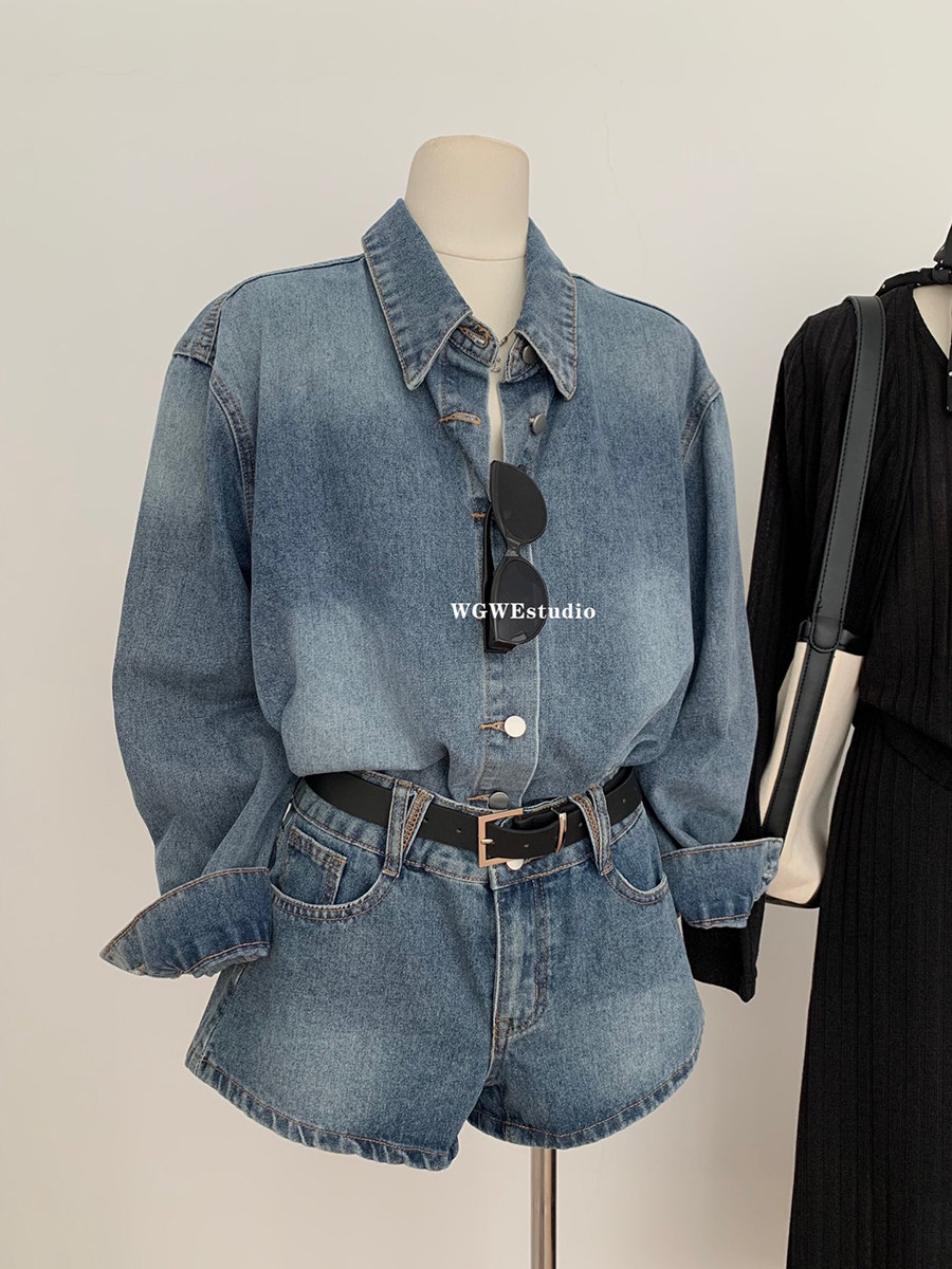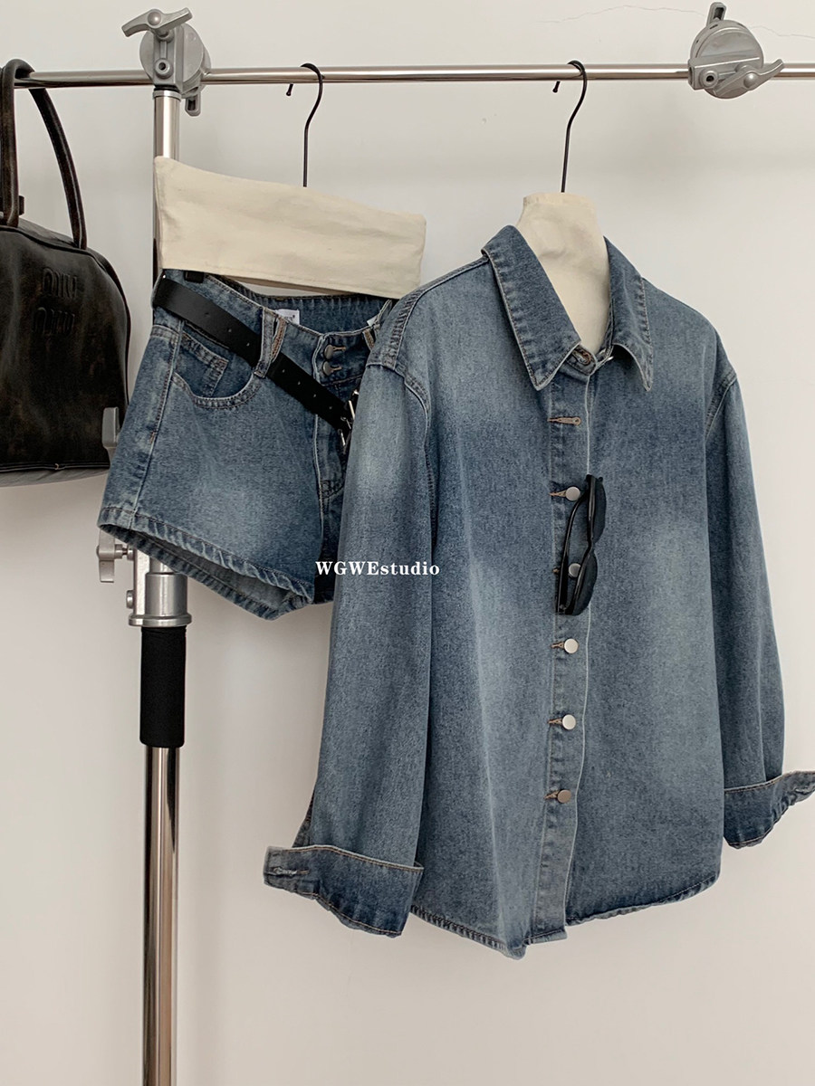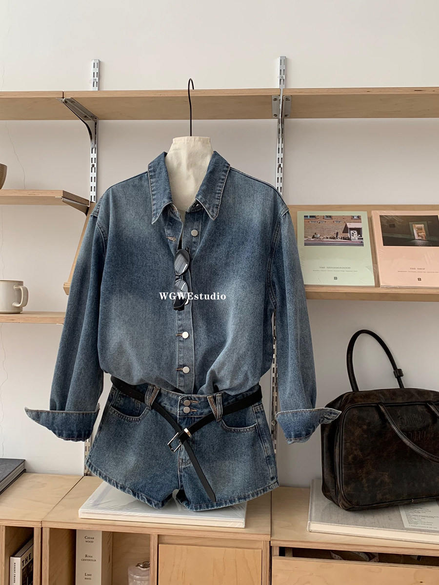 認真賣 巴黎腔調 藍色復古上衣水洗襯衫女夏秋季牛仔短褲兩件套裝