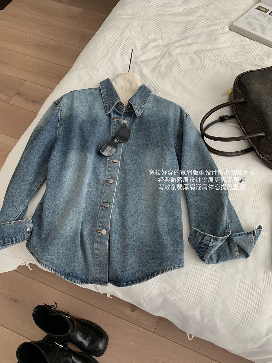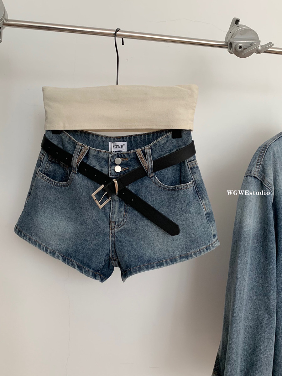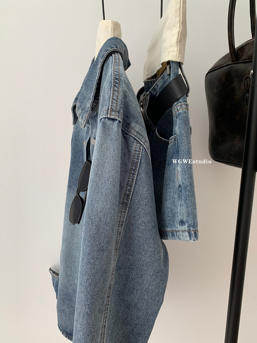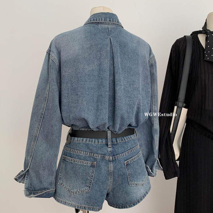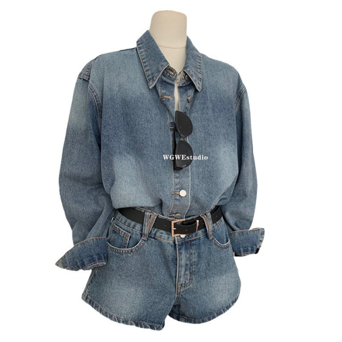 認真賣 巴黎腔調 藍色復古上衣水洗襯衫女夏秋季牛仔短褲兩件套裝