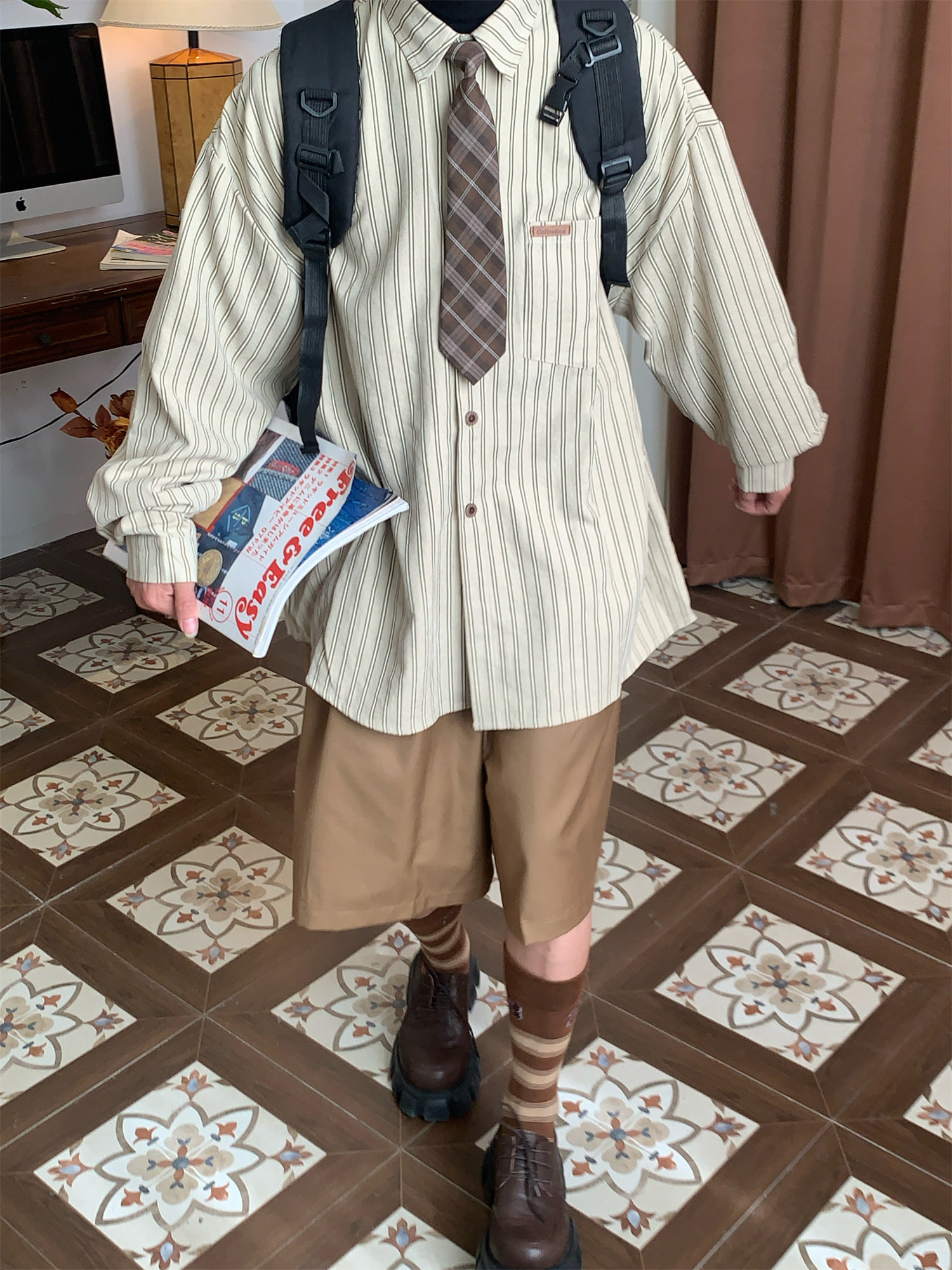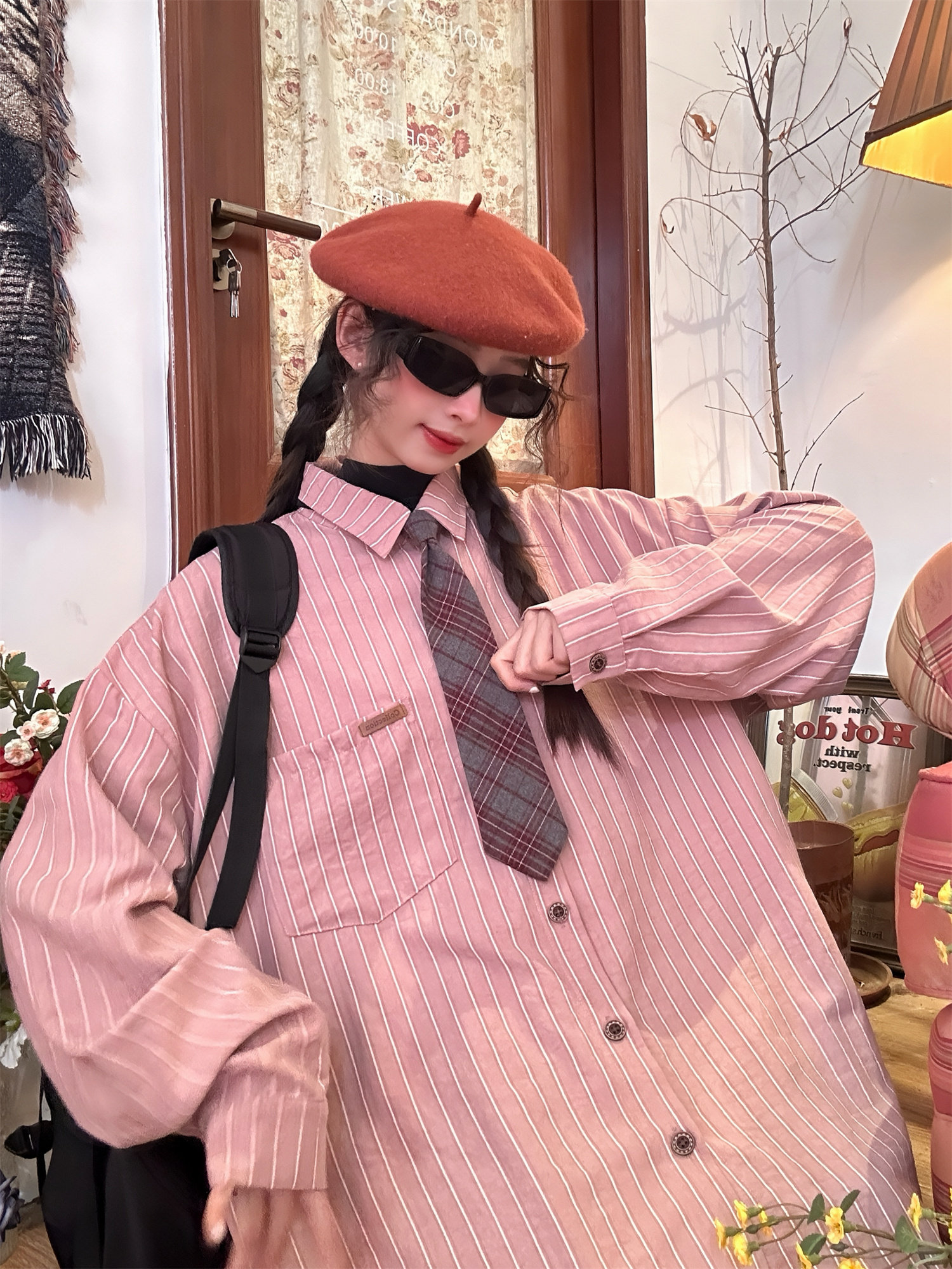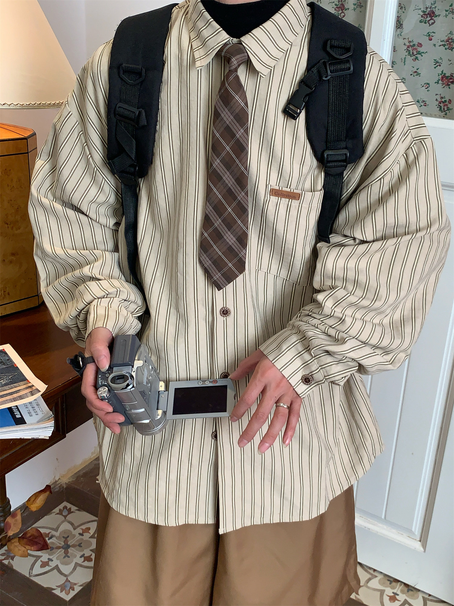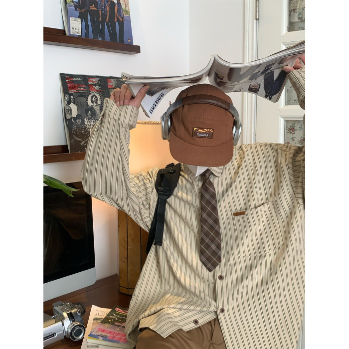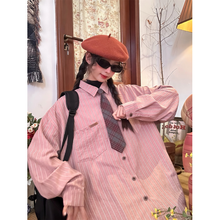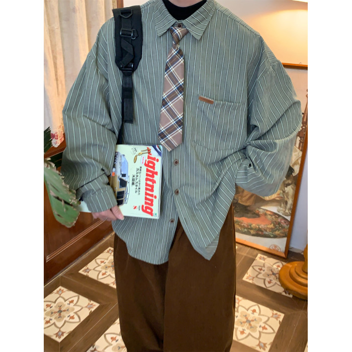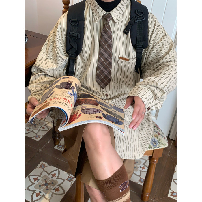 C2自製/春秋新款美式復古條紋長袖襯衫男女百搭寬鬆打底上衣領帶
