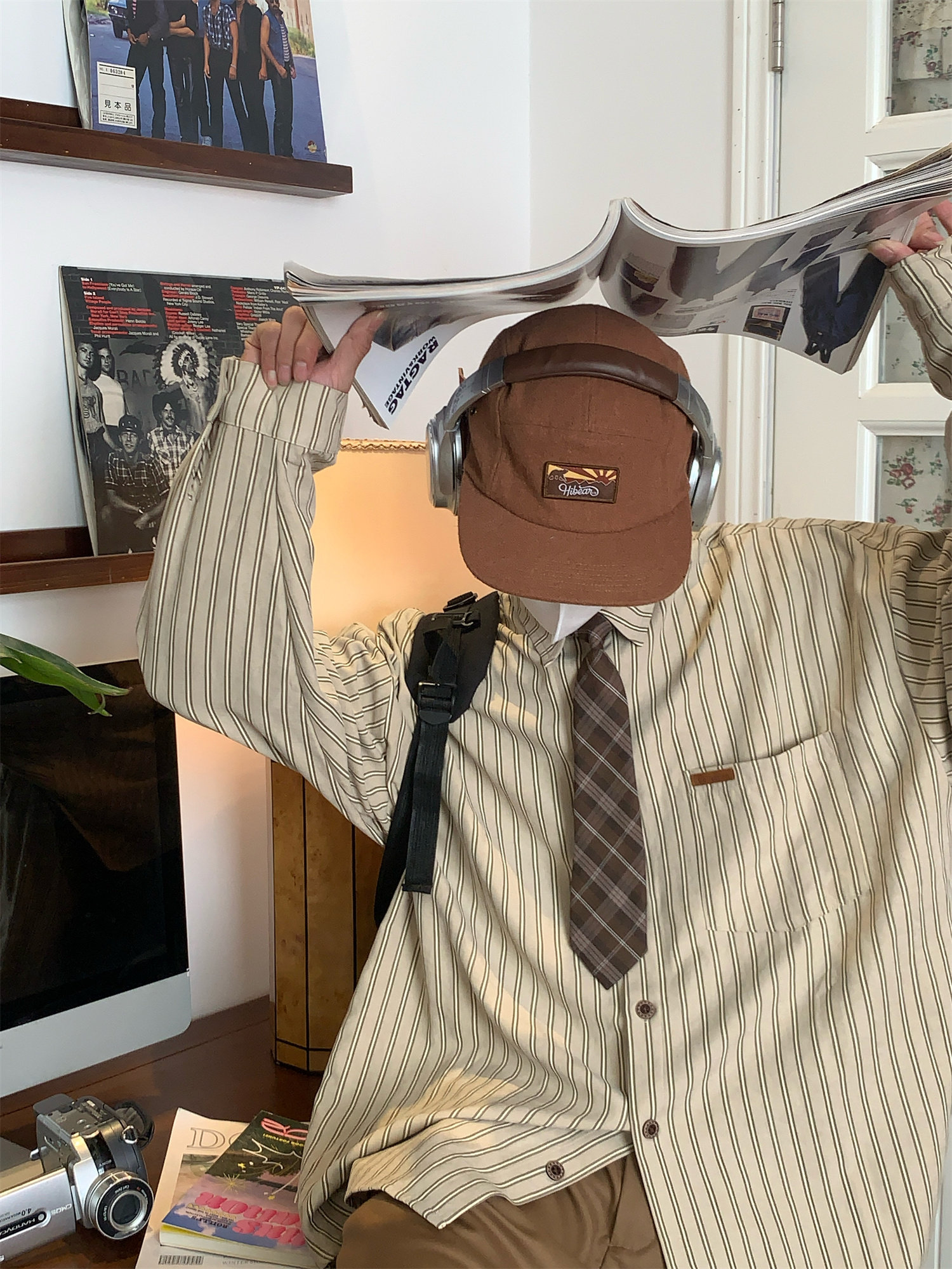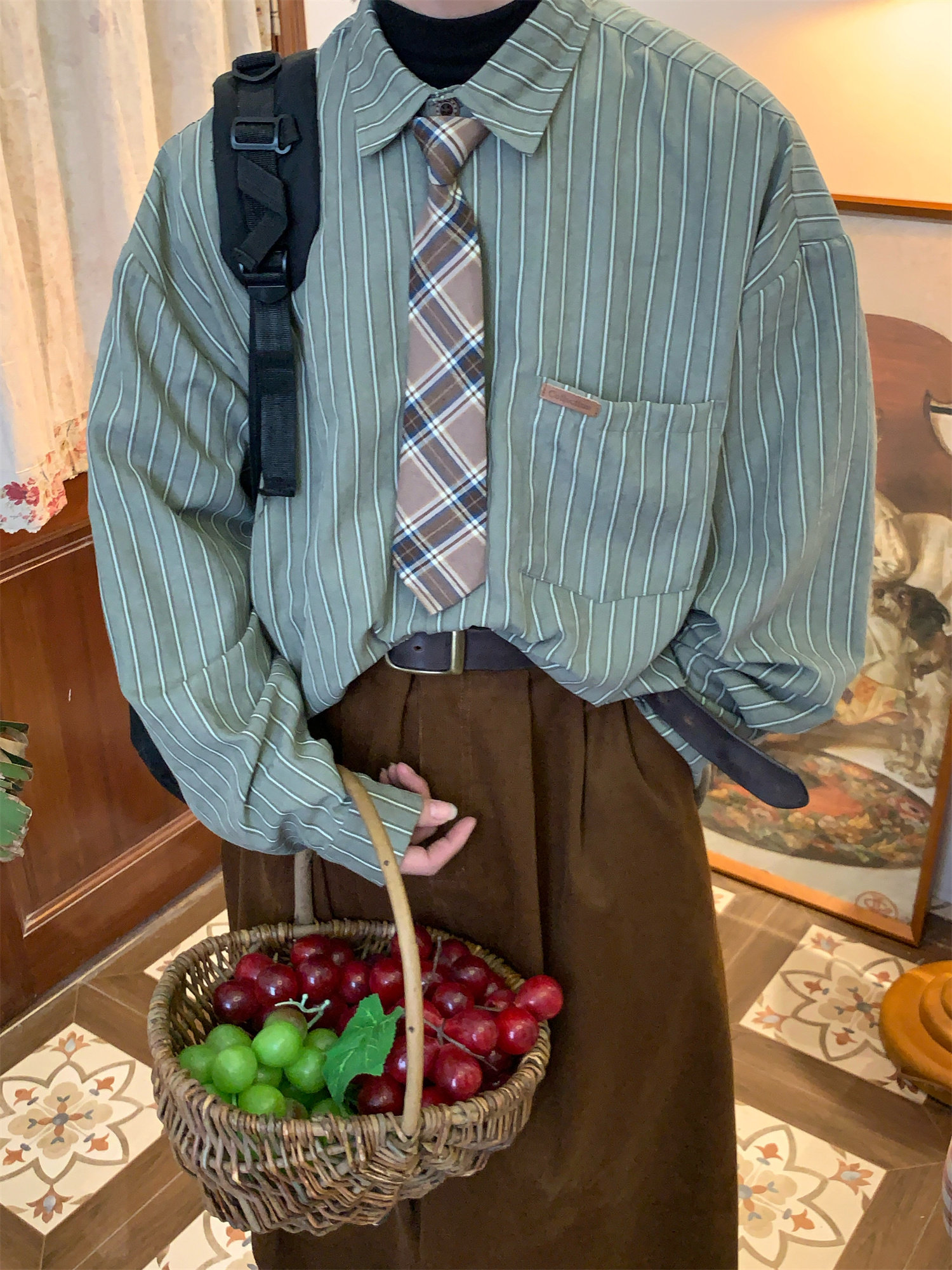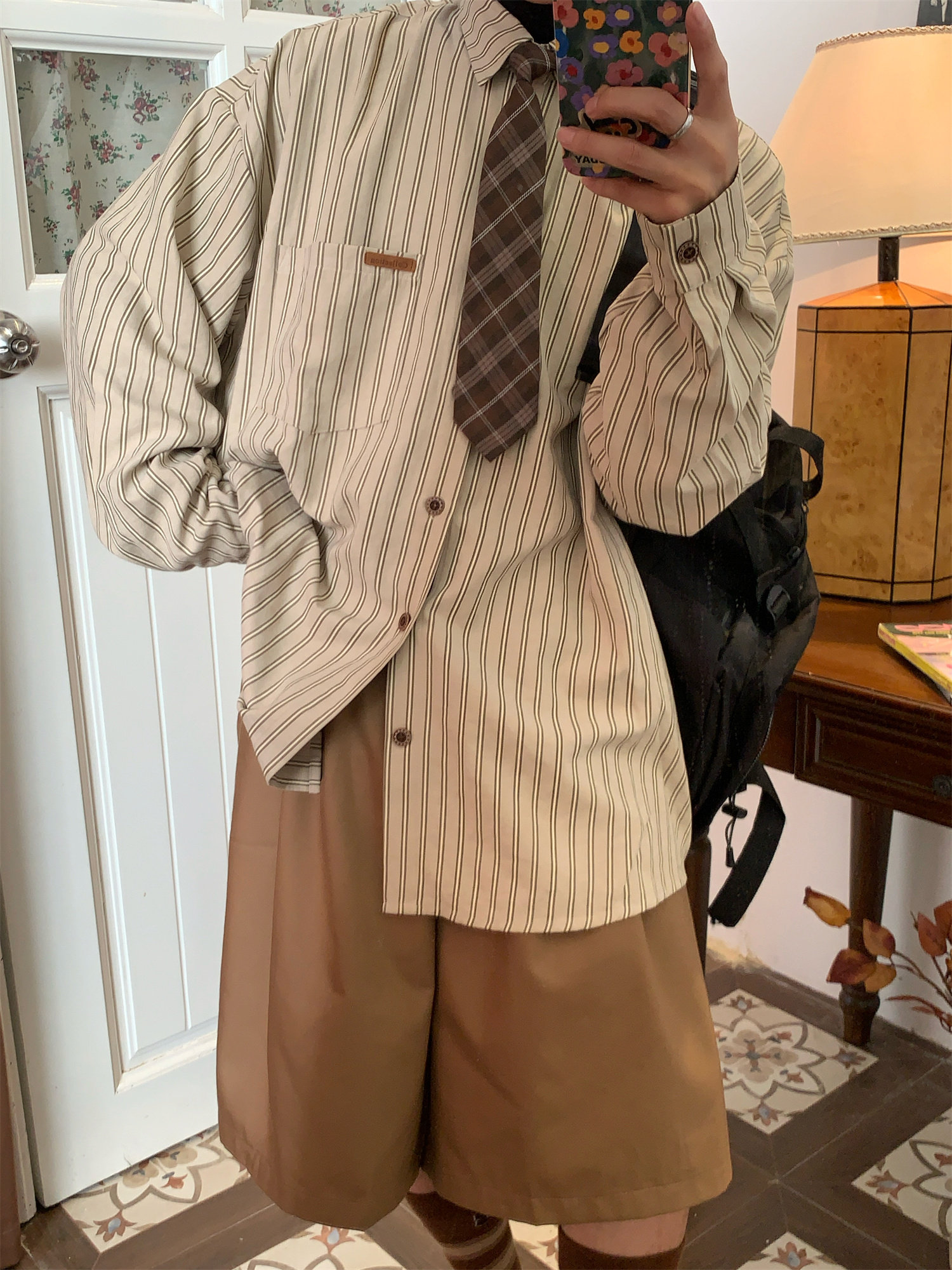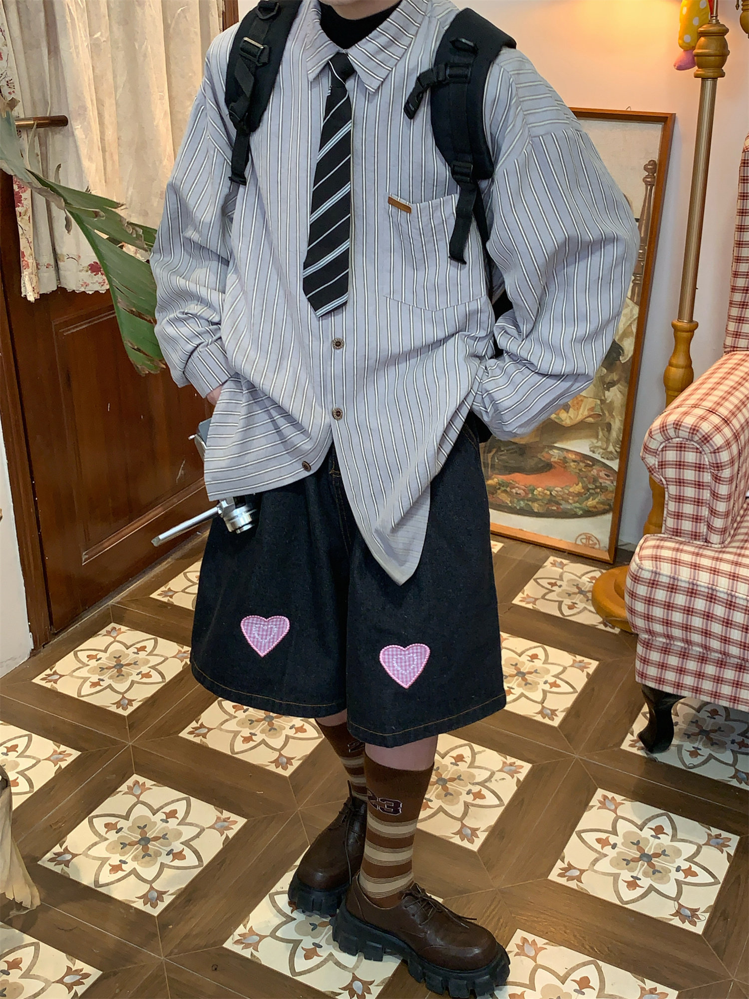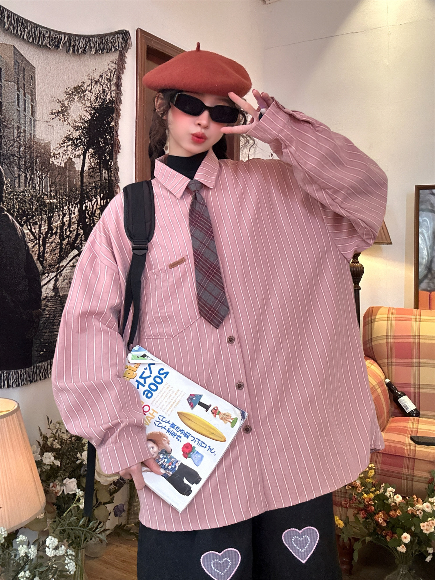 C2自製/春秋新款美式復古條紋長袖襯衫男女百搭寬鬆打底上衣領帶