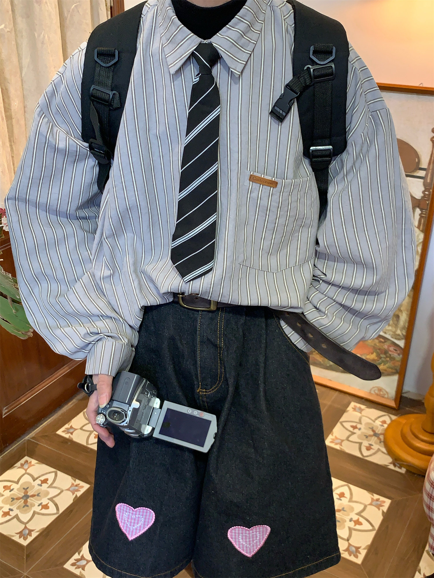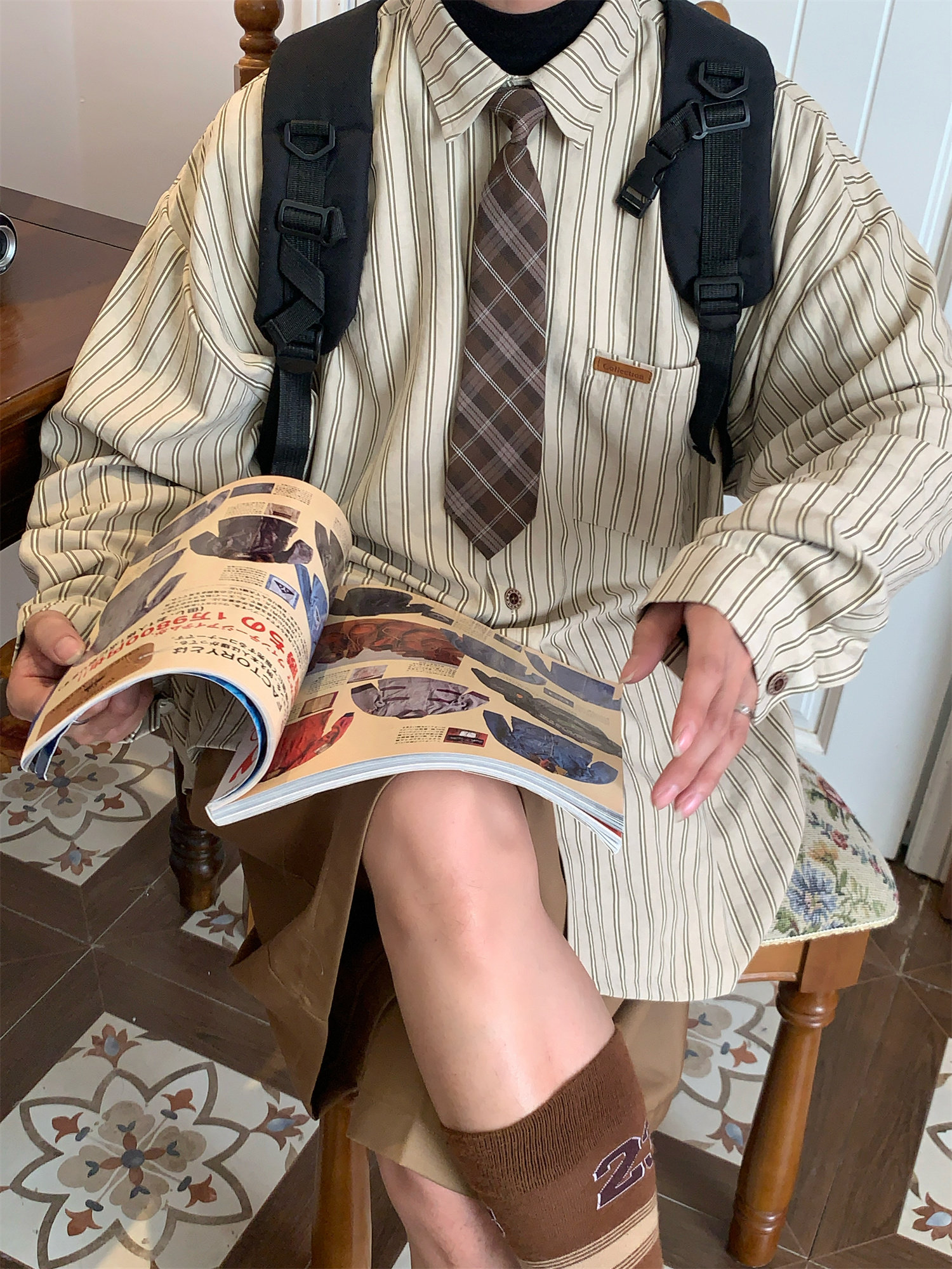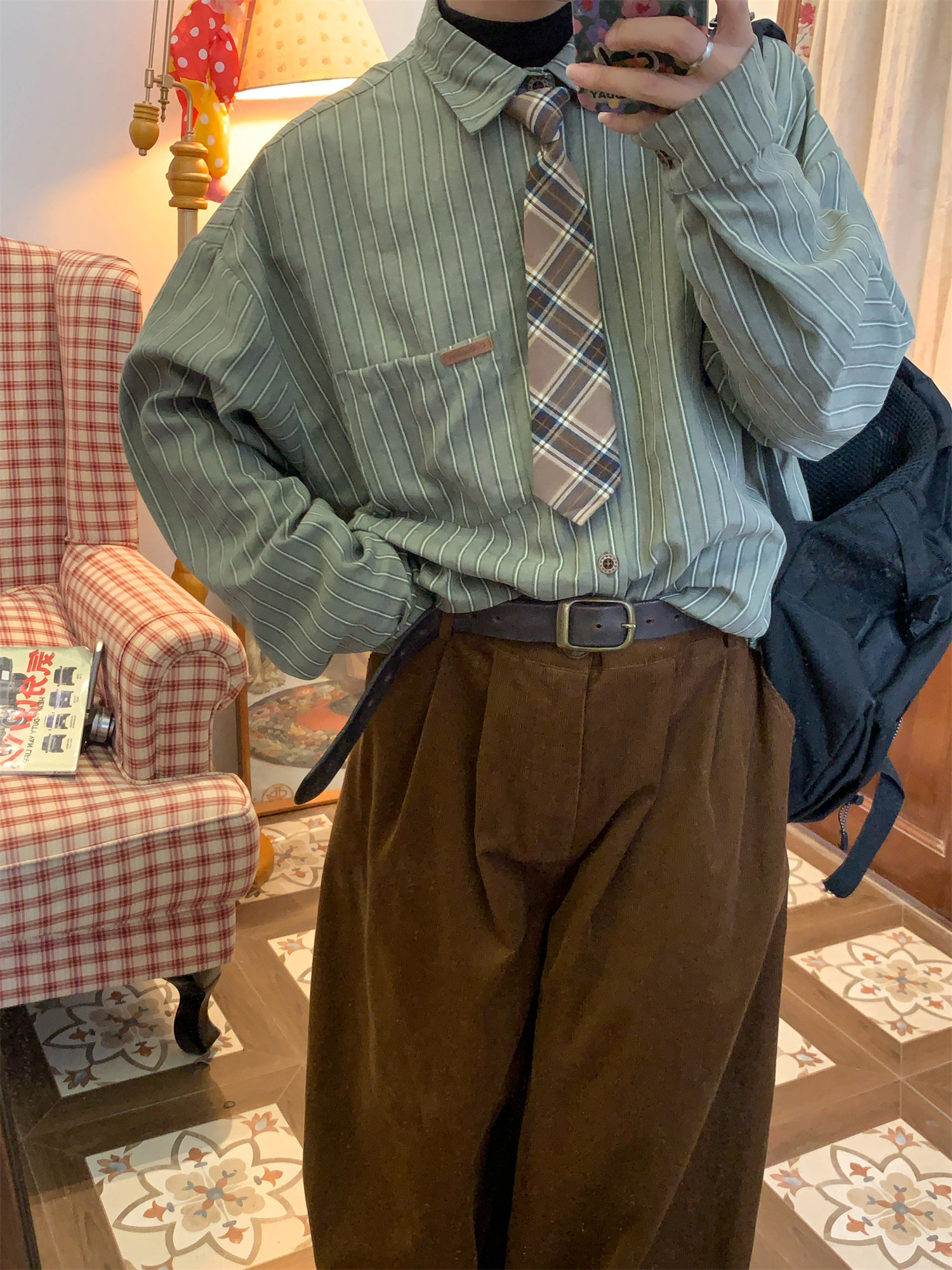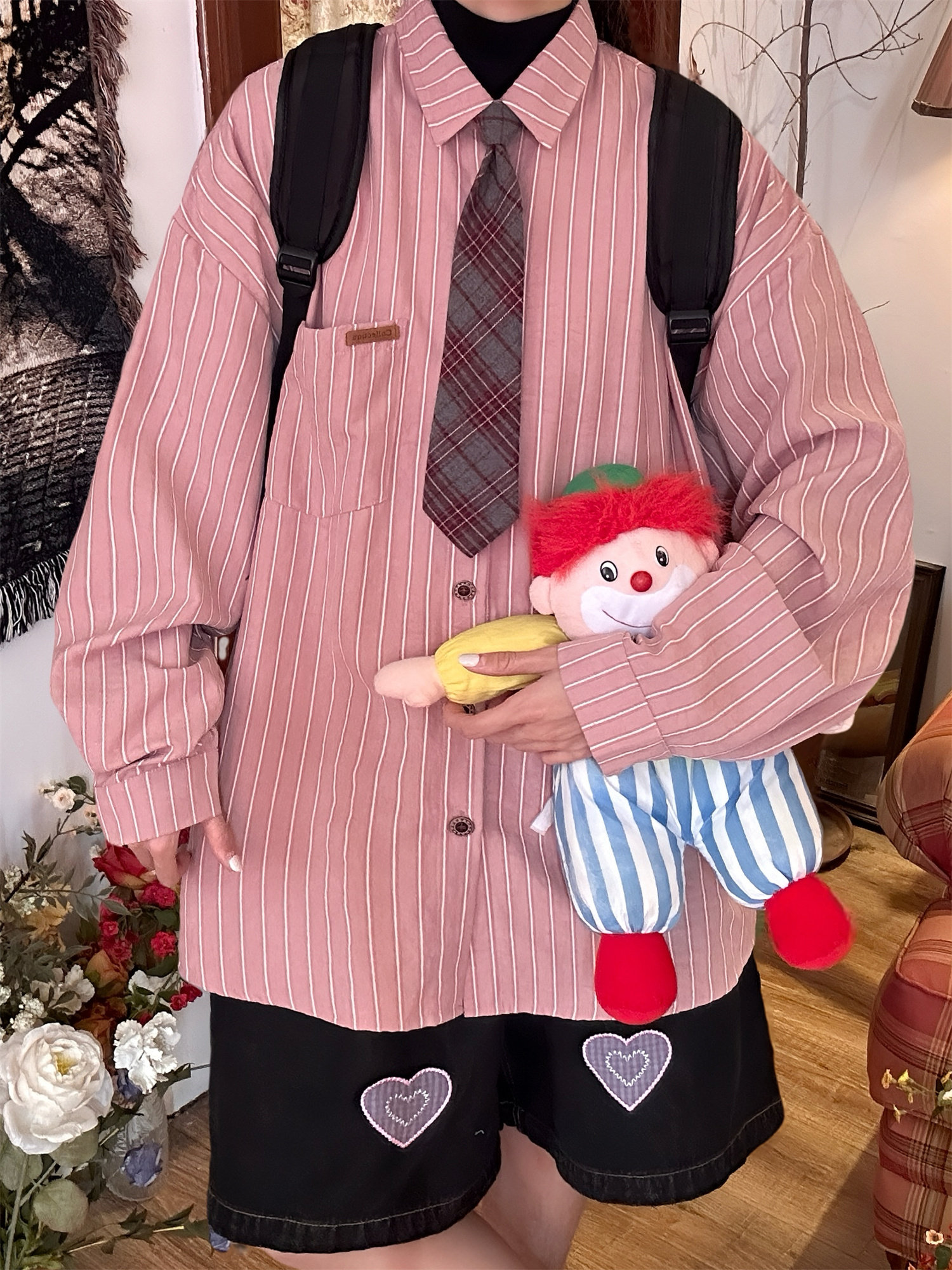 C2自製/春秋新款美式復古條紋長袖襯衫男女百搭寬鬆打底上衣領帶