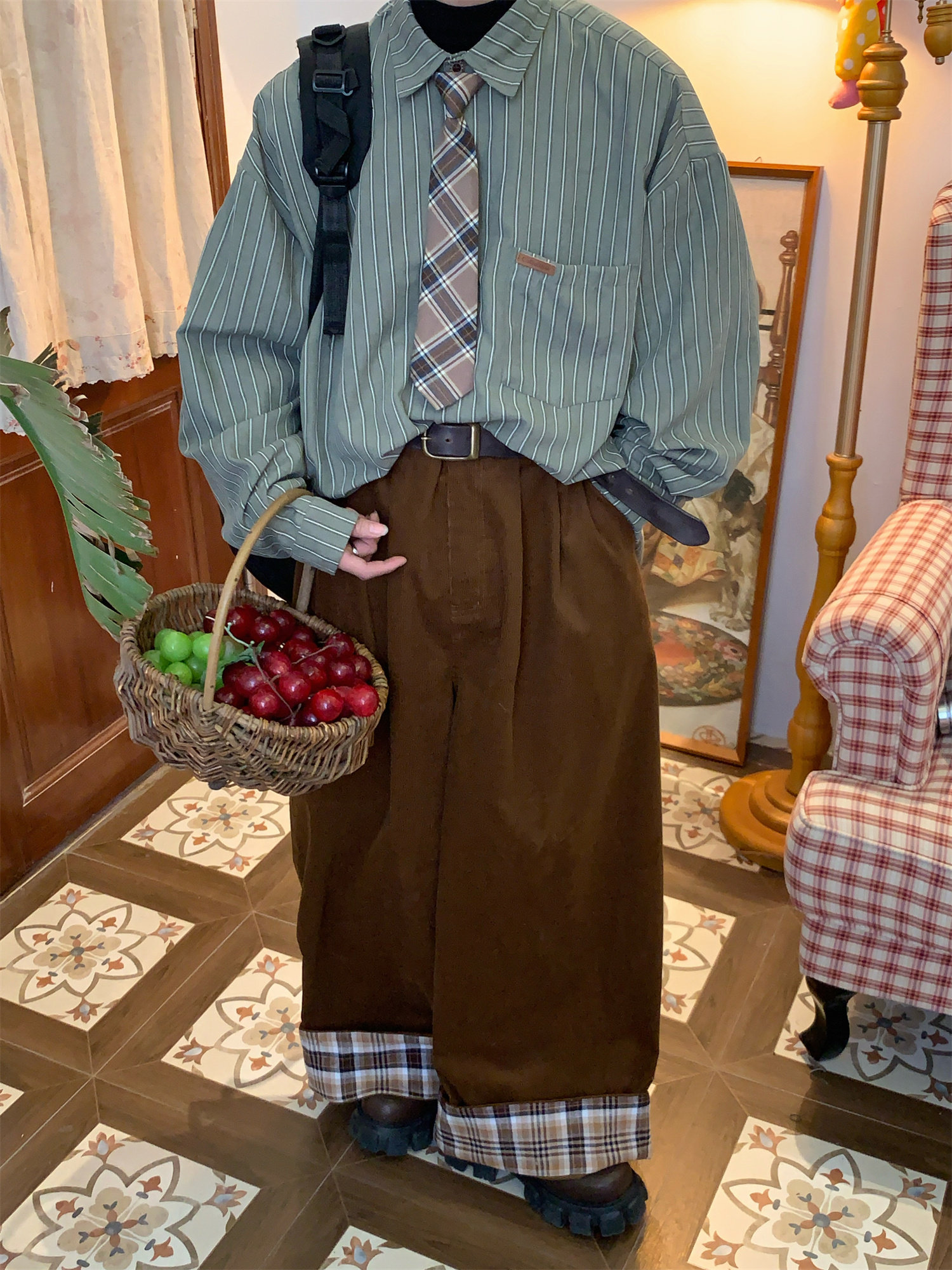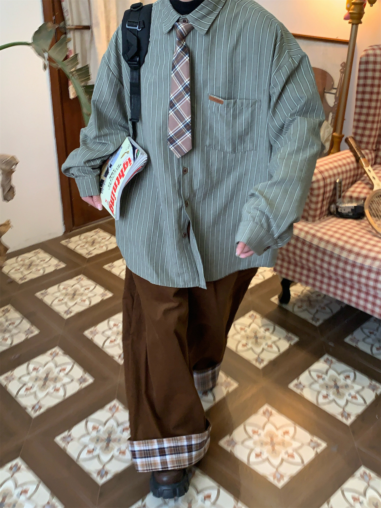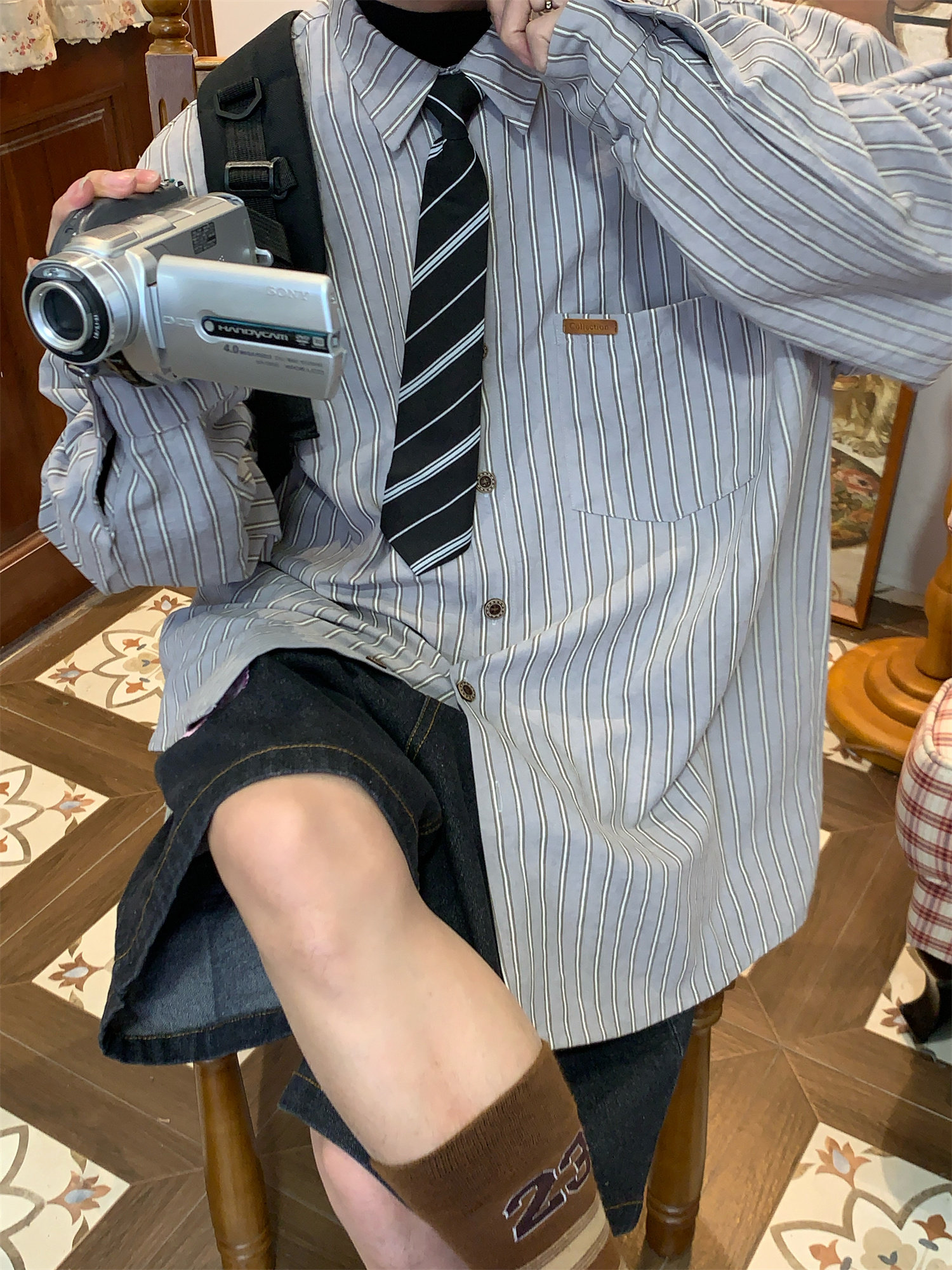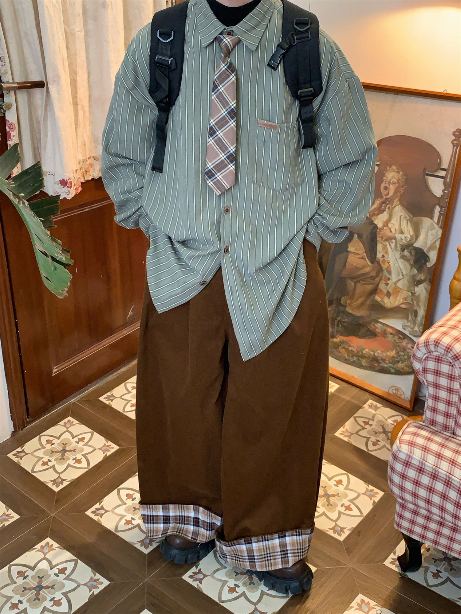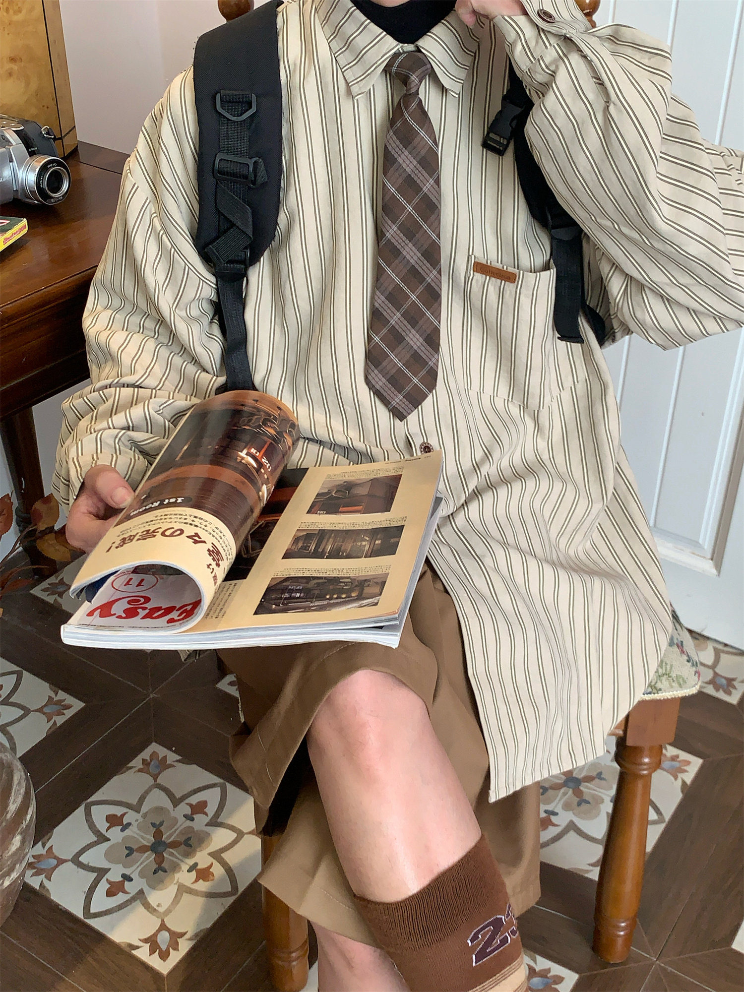 C2自製/春秋新款美式復古條紋長袖襯衫男女百搭寬鬆打底上衣領帶