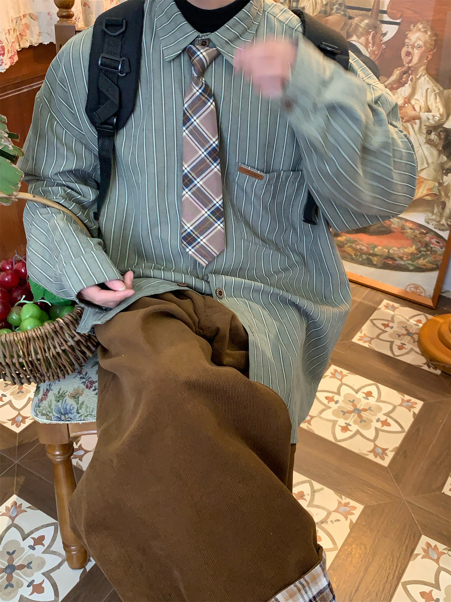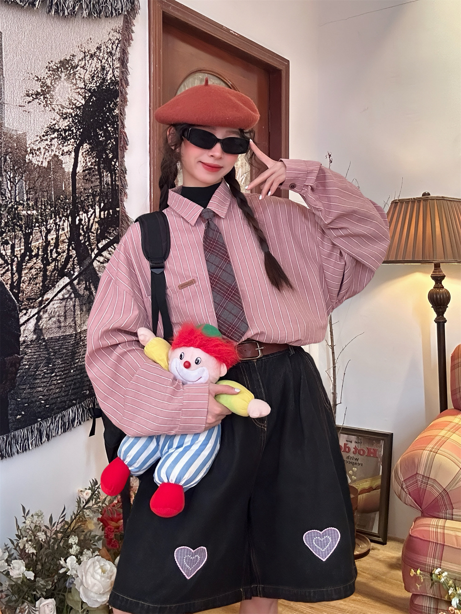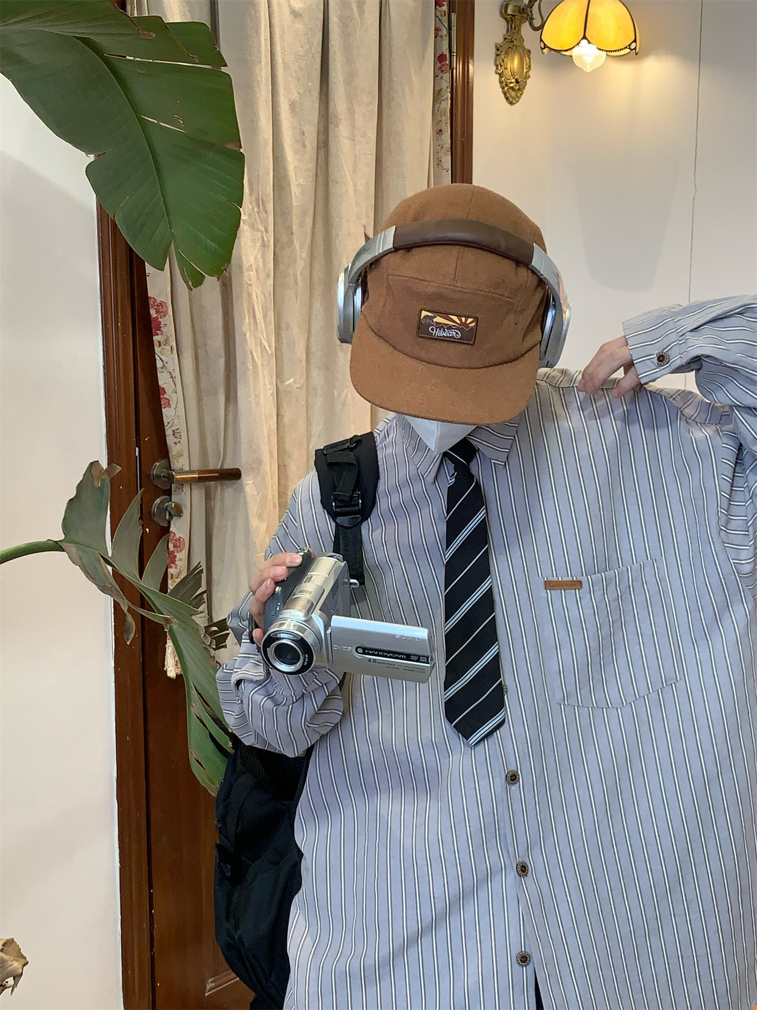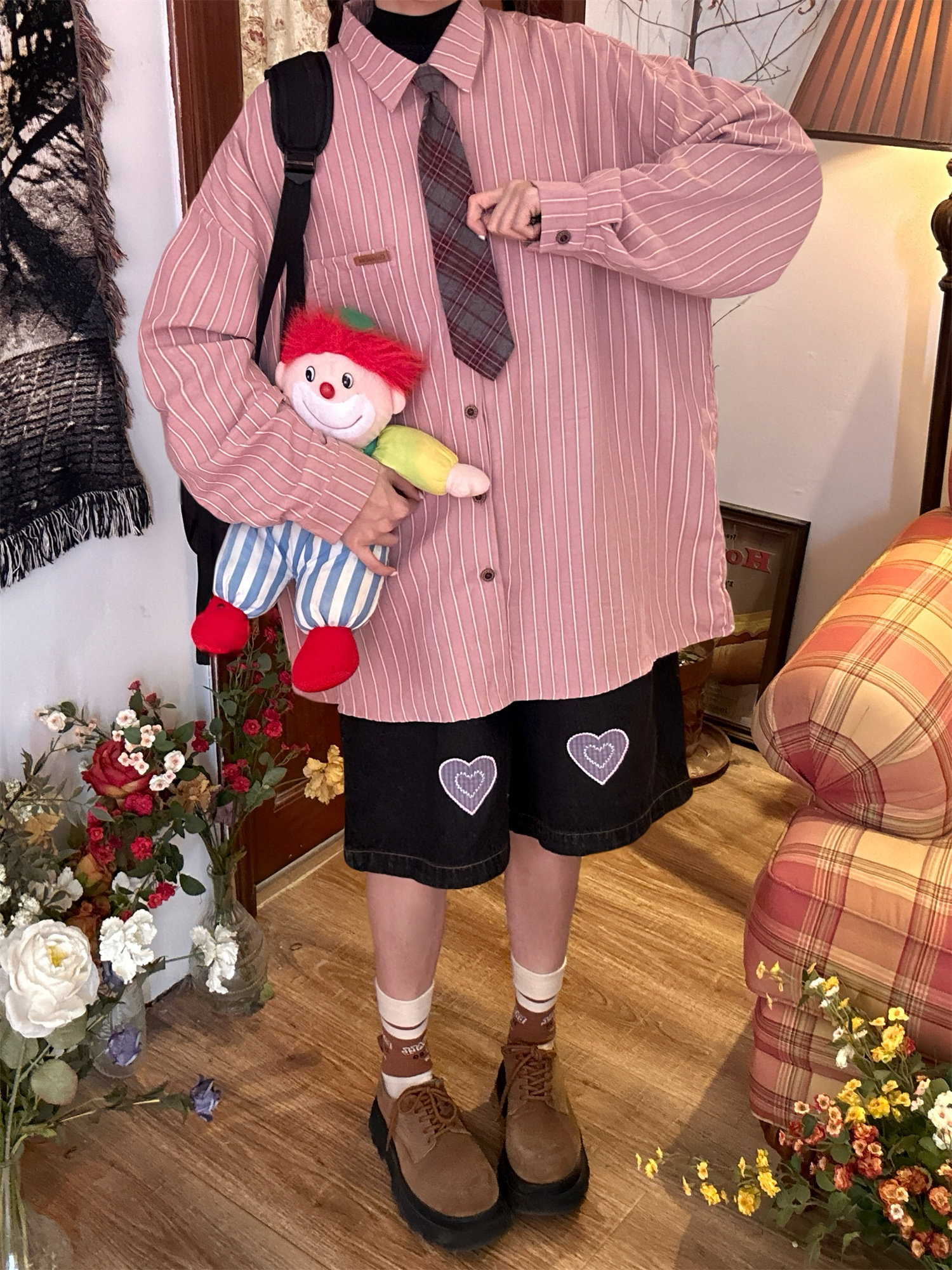 C2自製/春秋新款美式復古條紋長袖襯衫男女百搭寬鬆打底上衣領帶