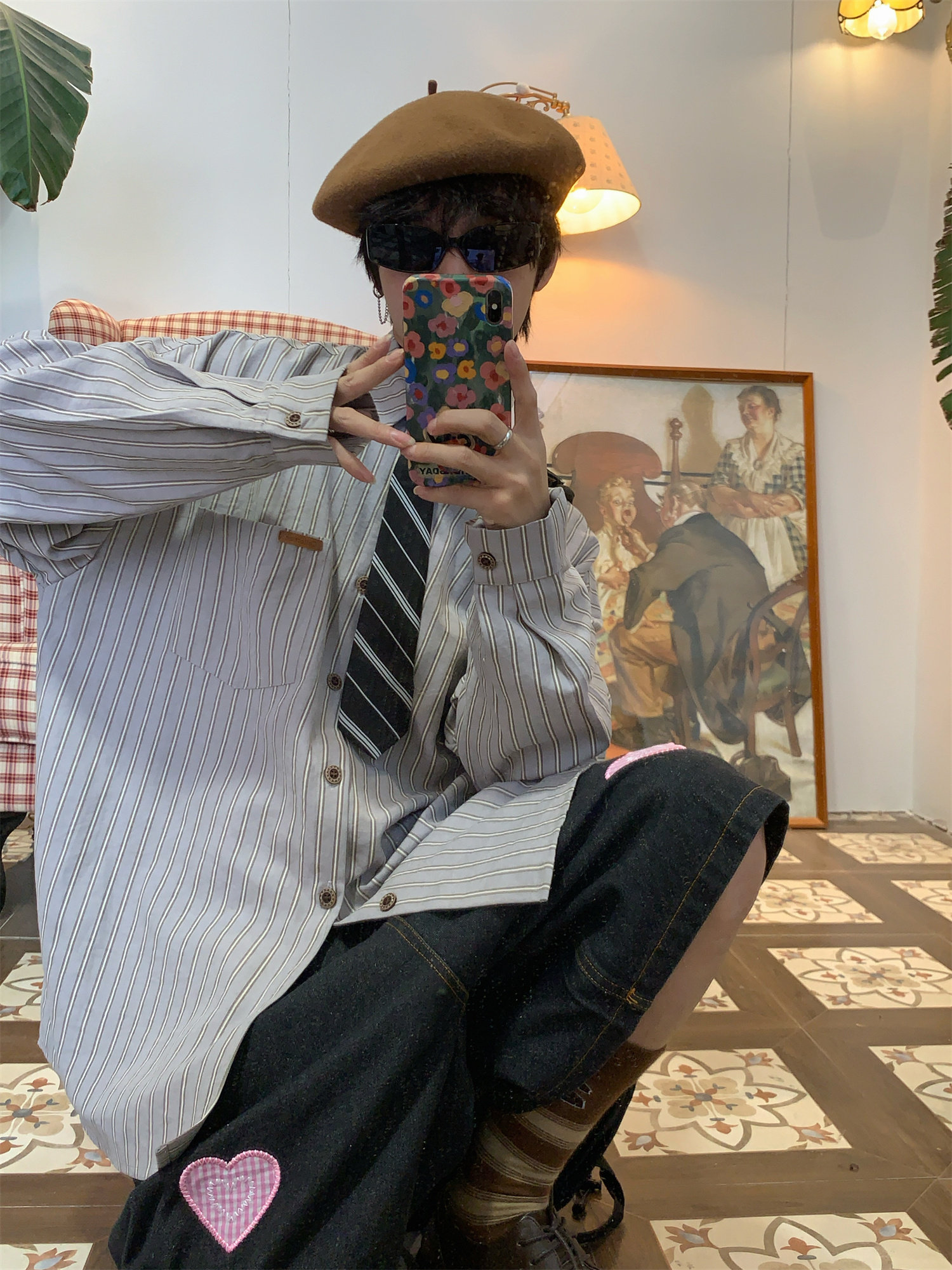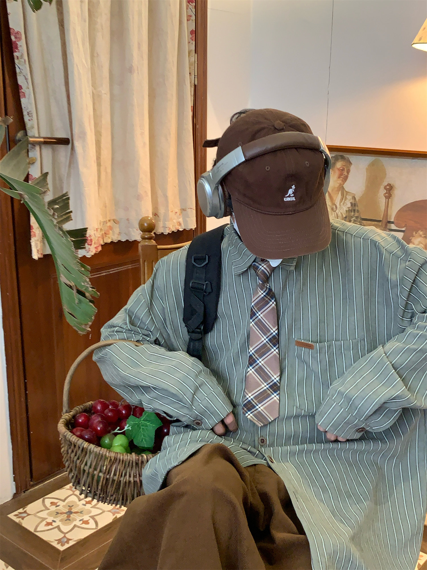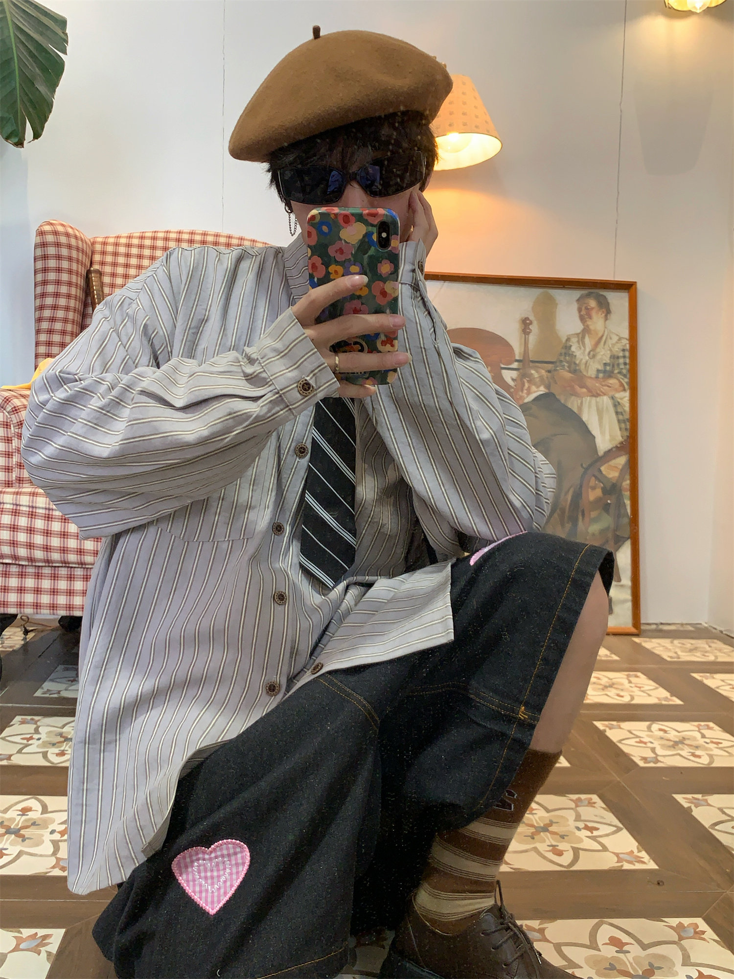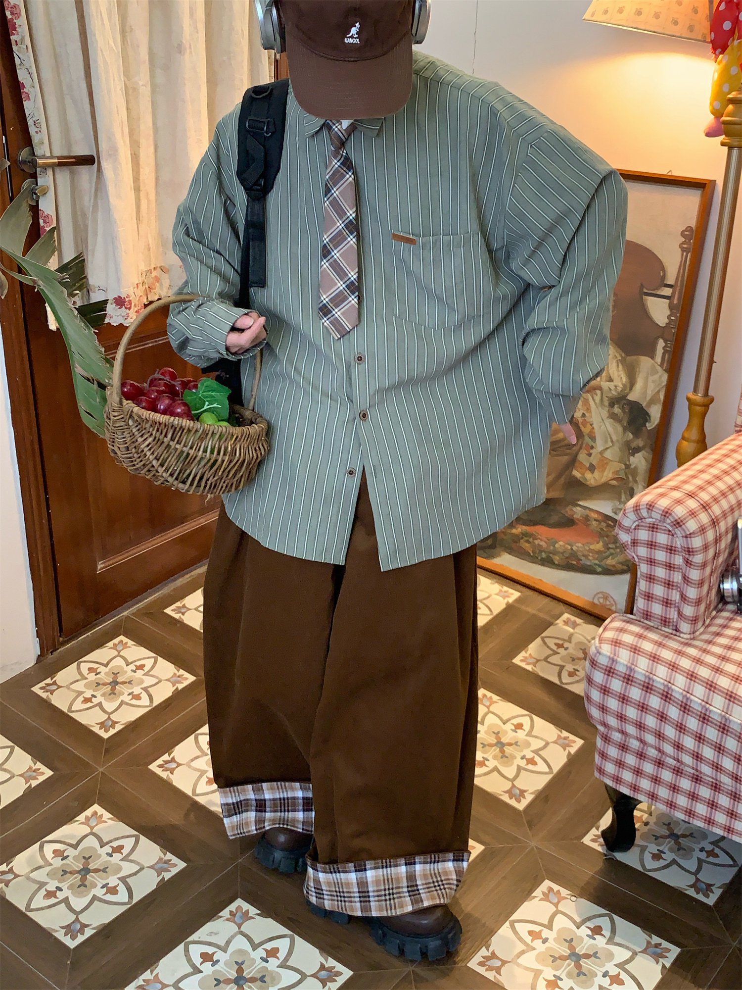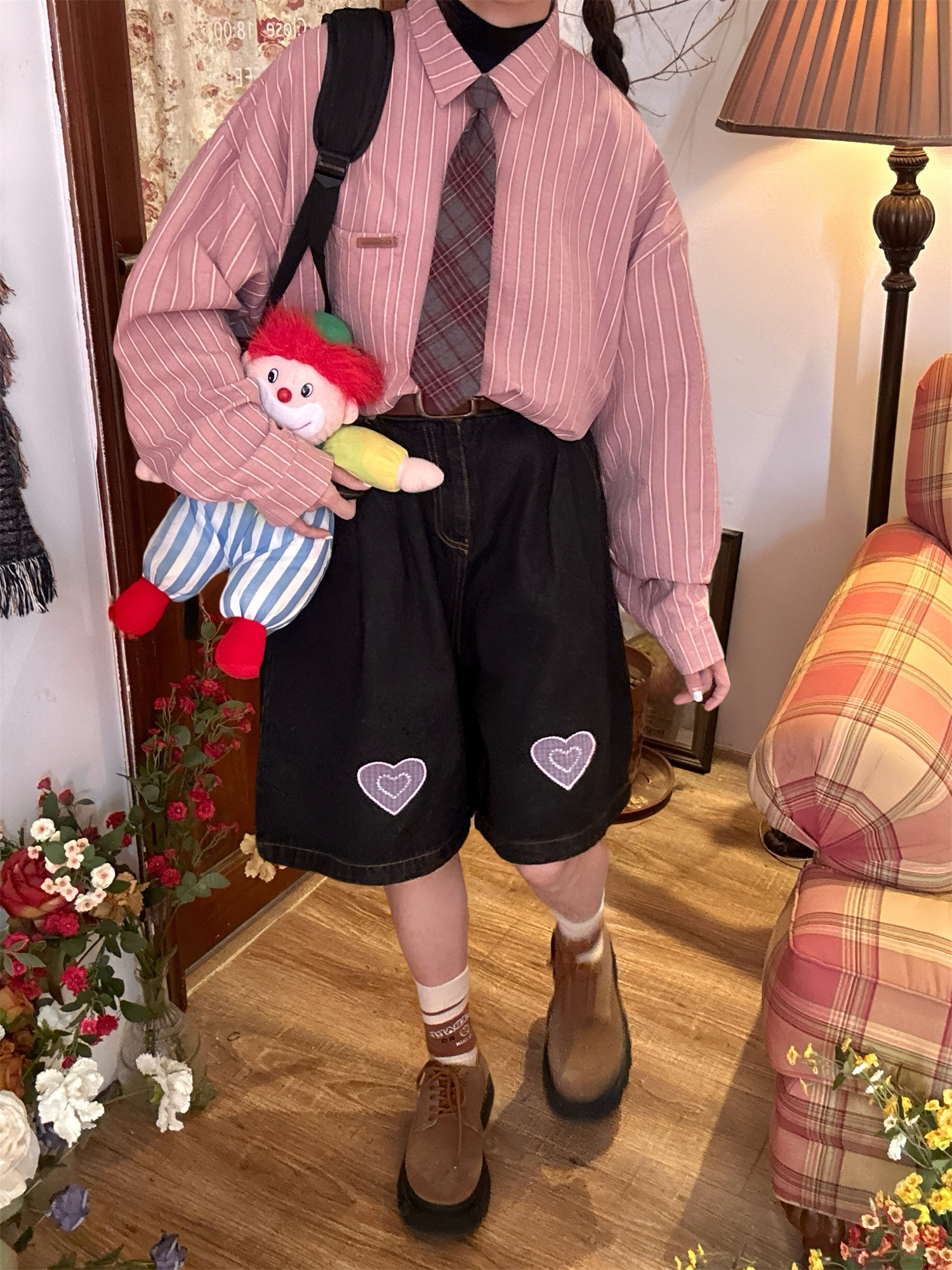 C2自製/春秋新款美式復古條紋長袖襯衫男女百搭寬鬆打底上衣領帶
