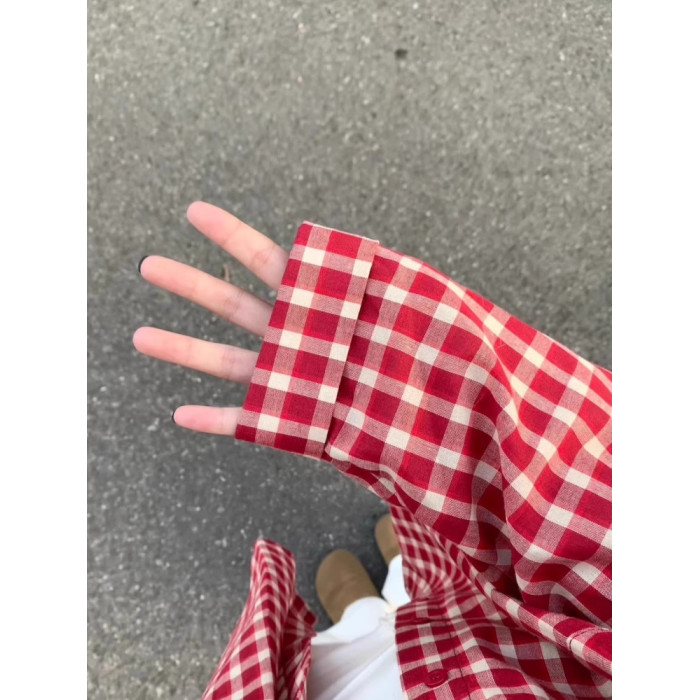 美式復古紅色格子長袖襯衫女早春外搭襯衣外套慵懶風防曬夏款上衣