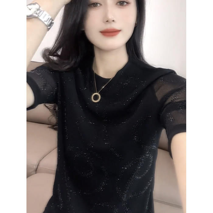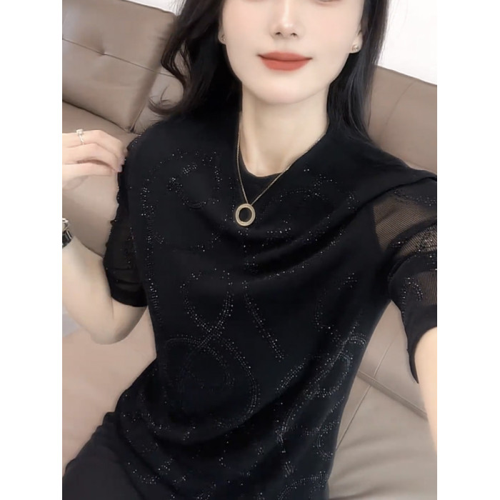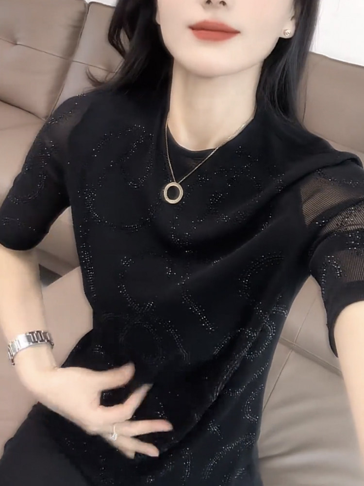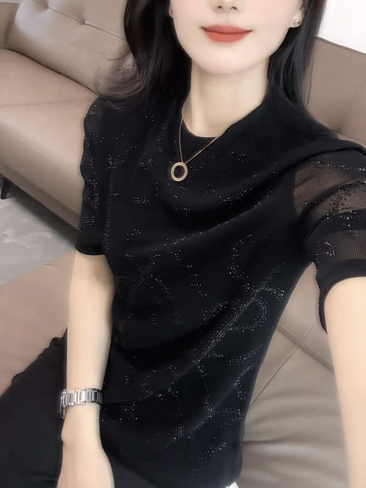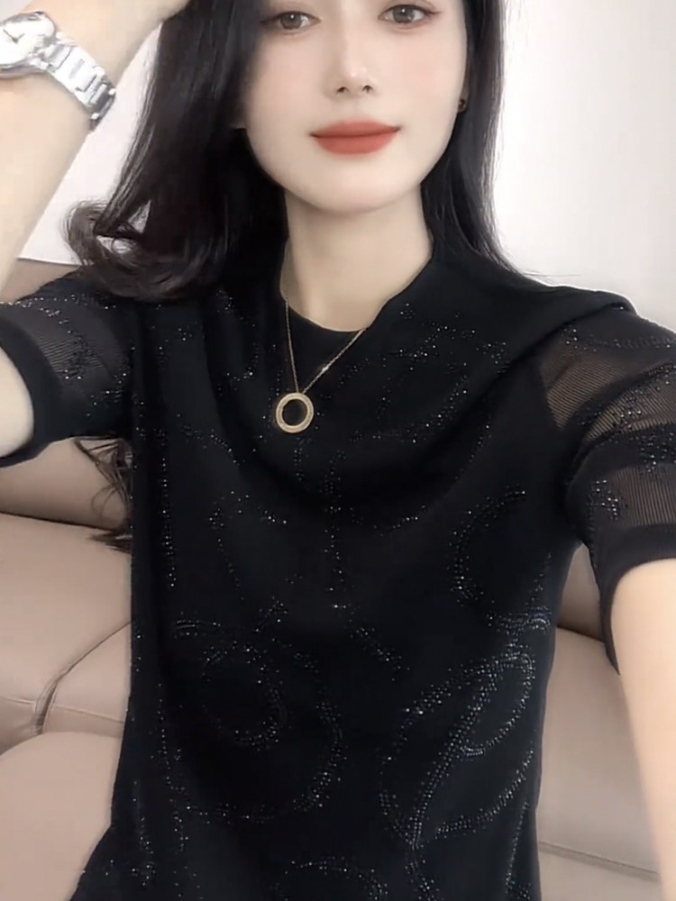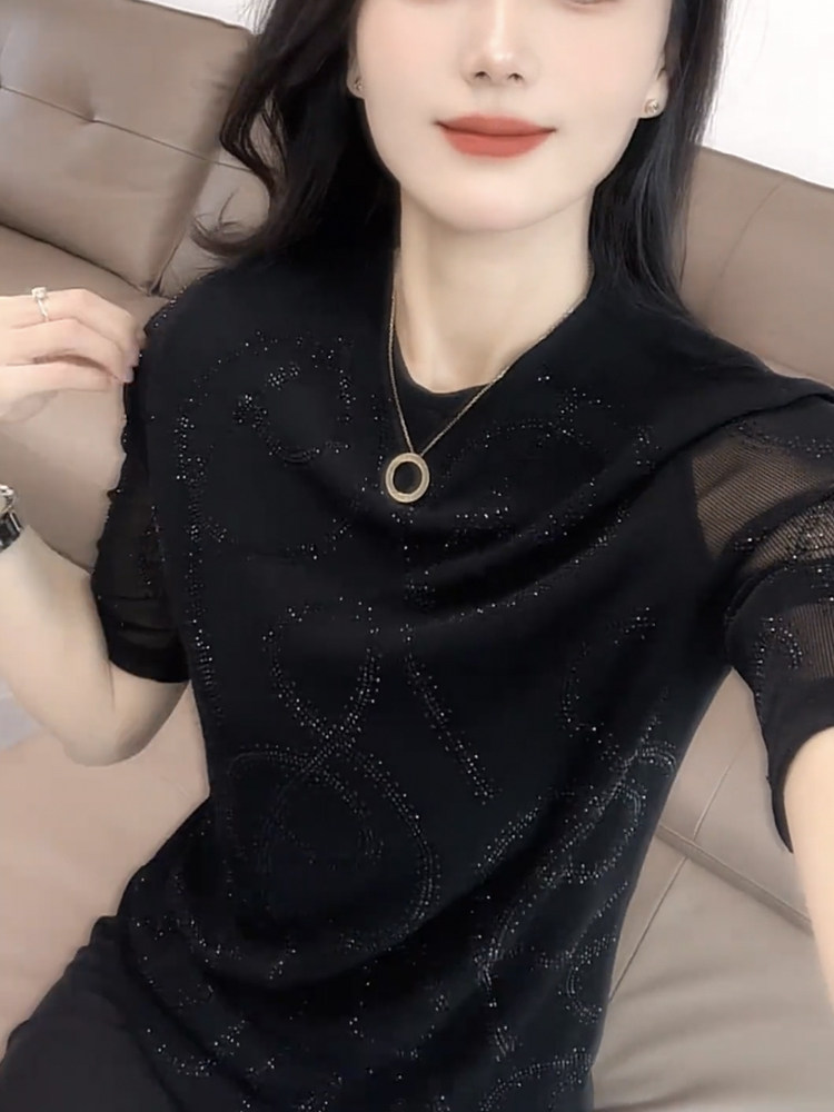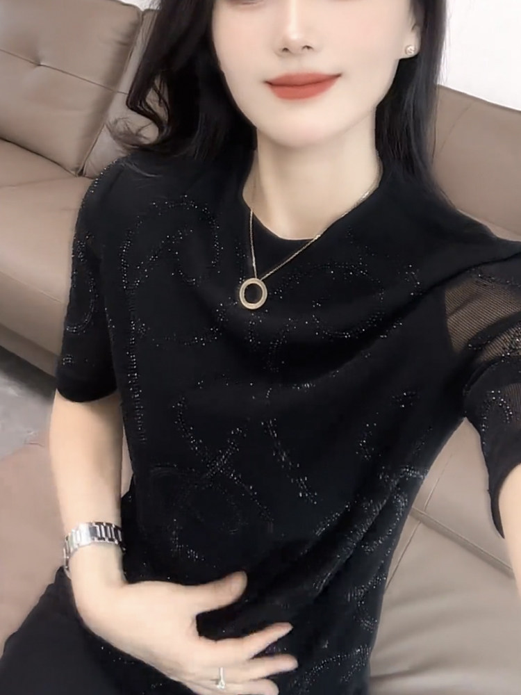 鏤空網紗拼接短袖T恤女2025年夏季新款圓領洋氣質高級感穿搭上衣