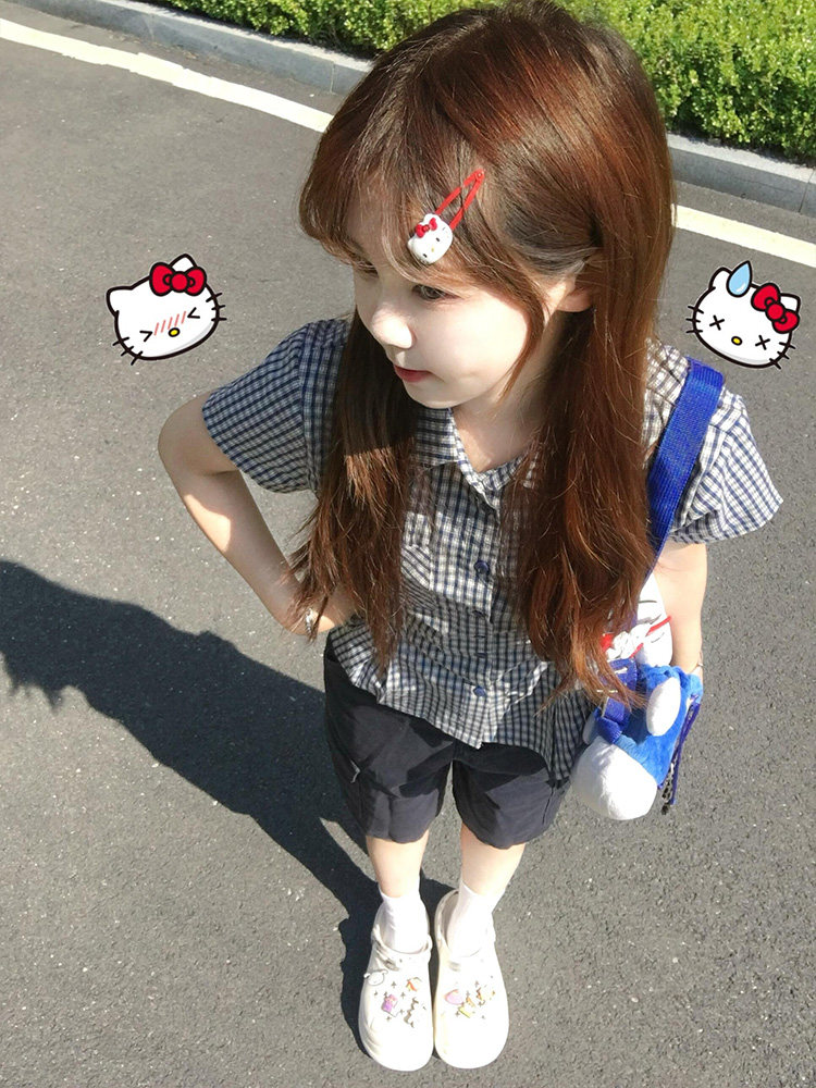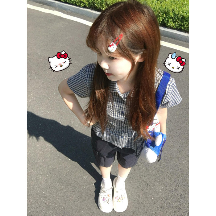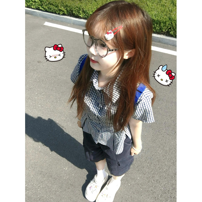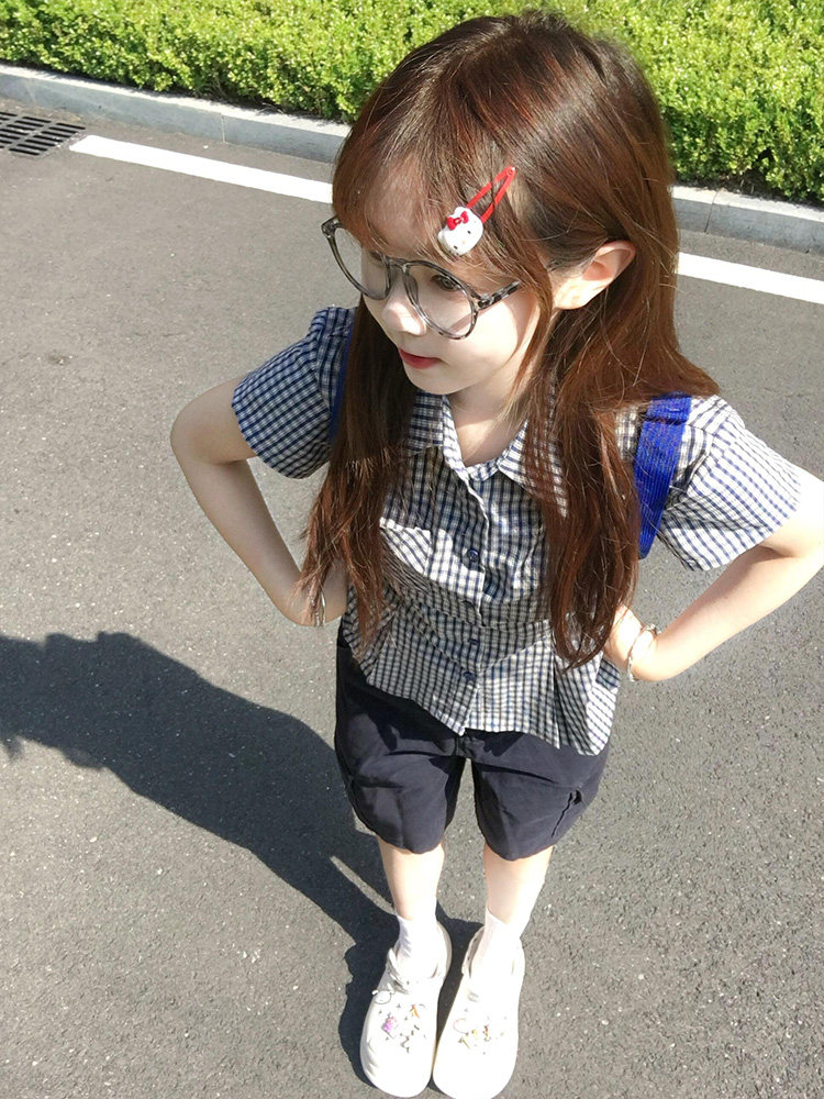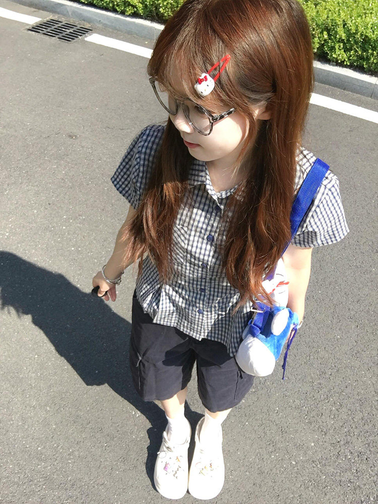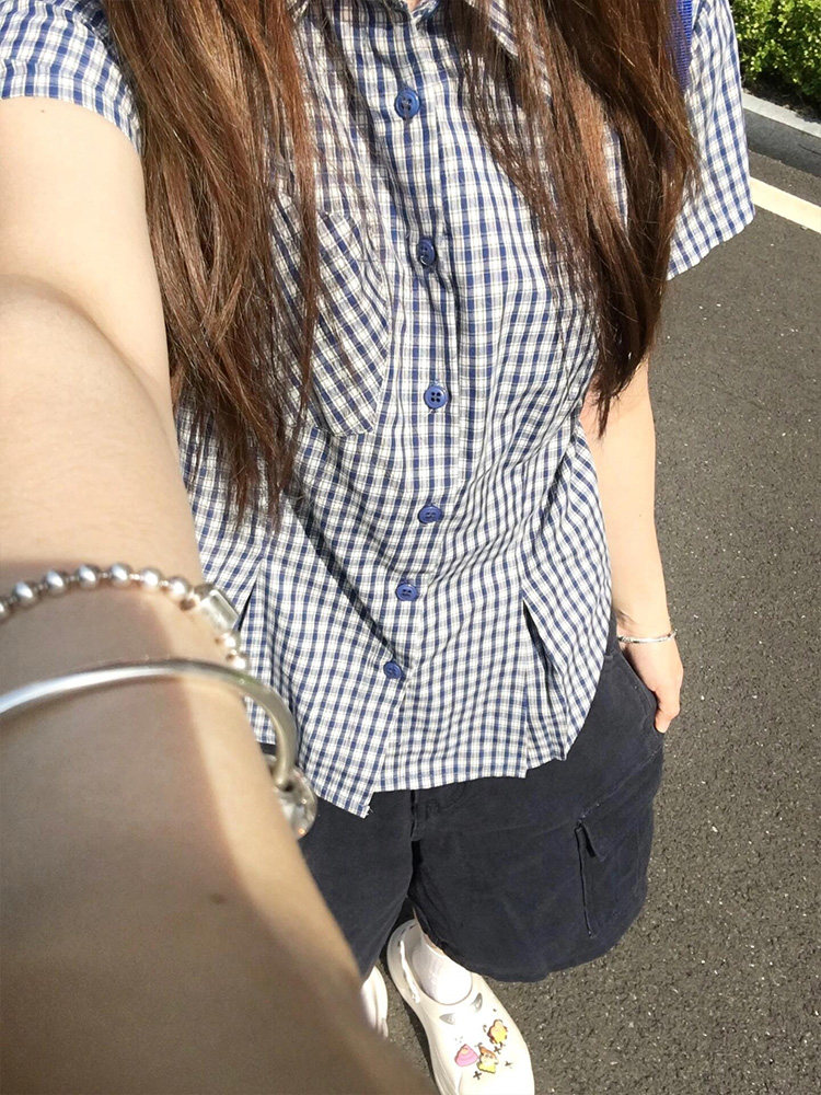 韓系復古藍色格子短袖襯衫女夏季新款繙領收腰顯瘦小個子外搭上衣