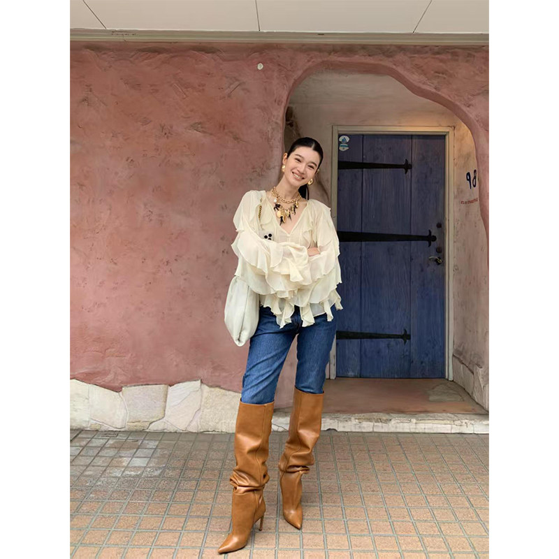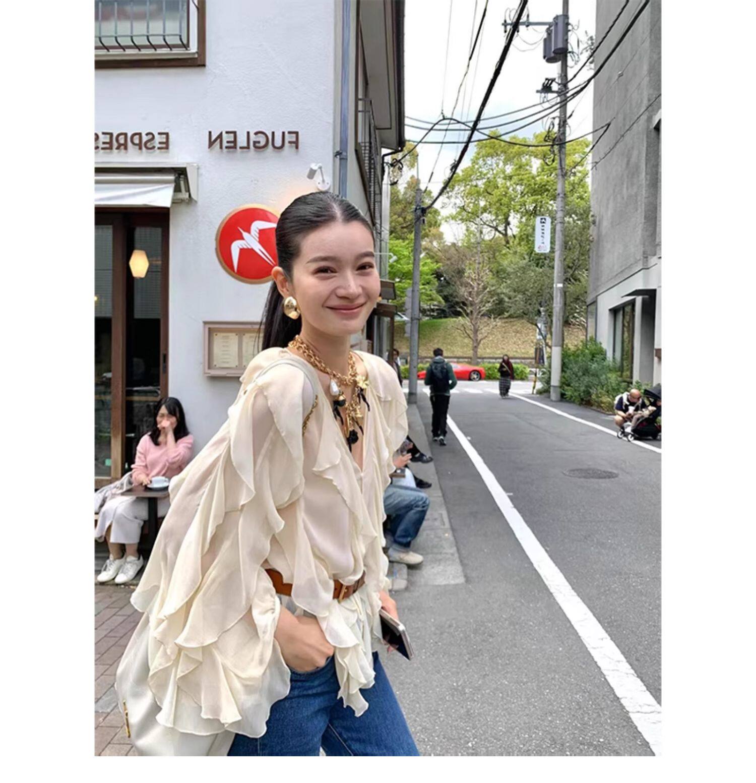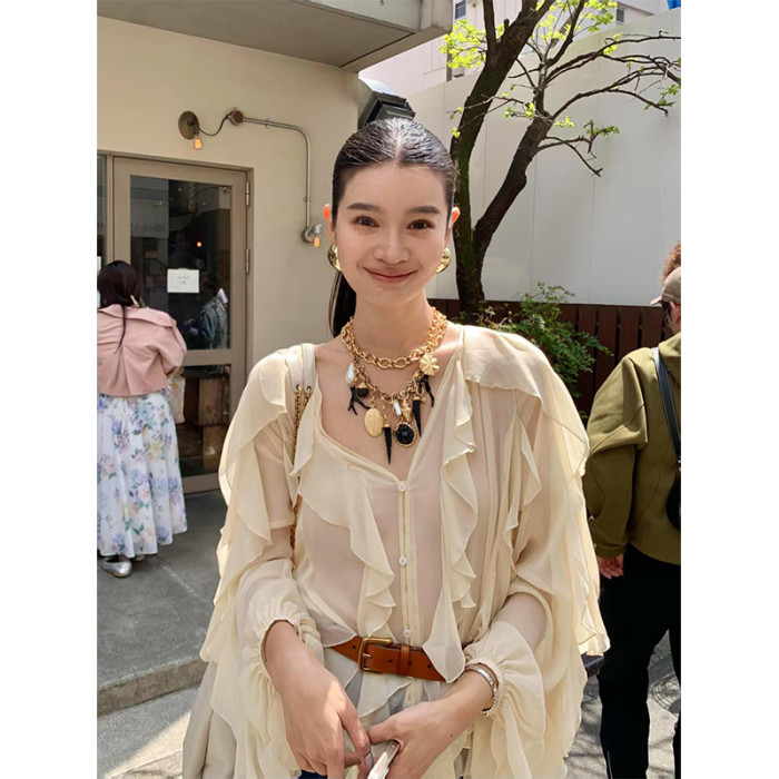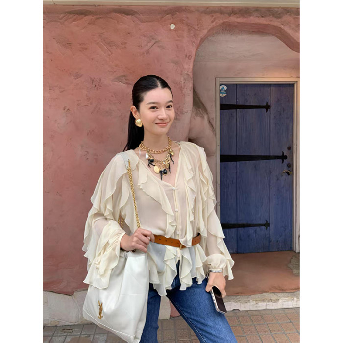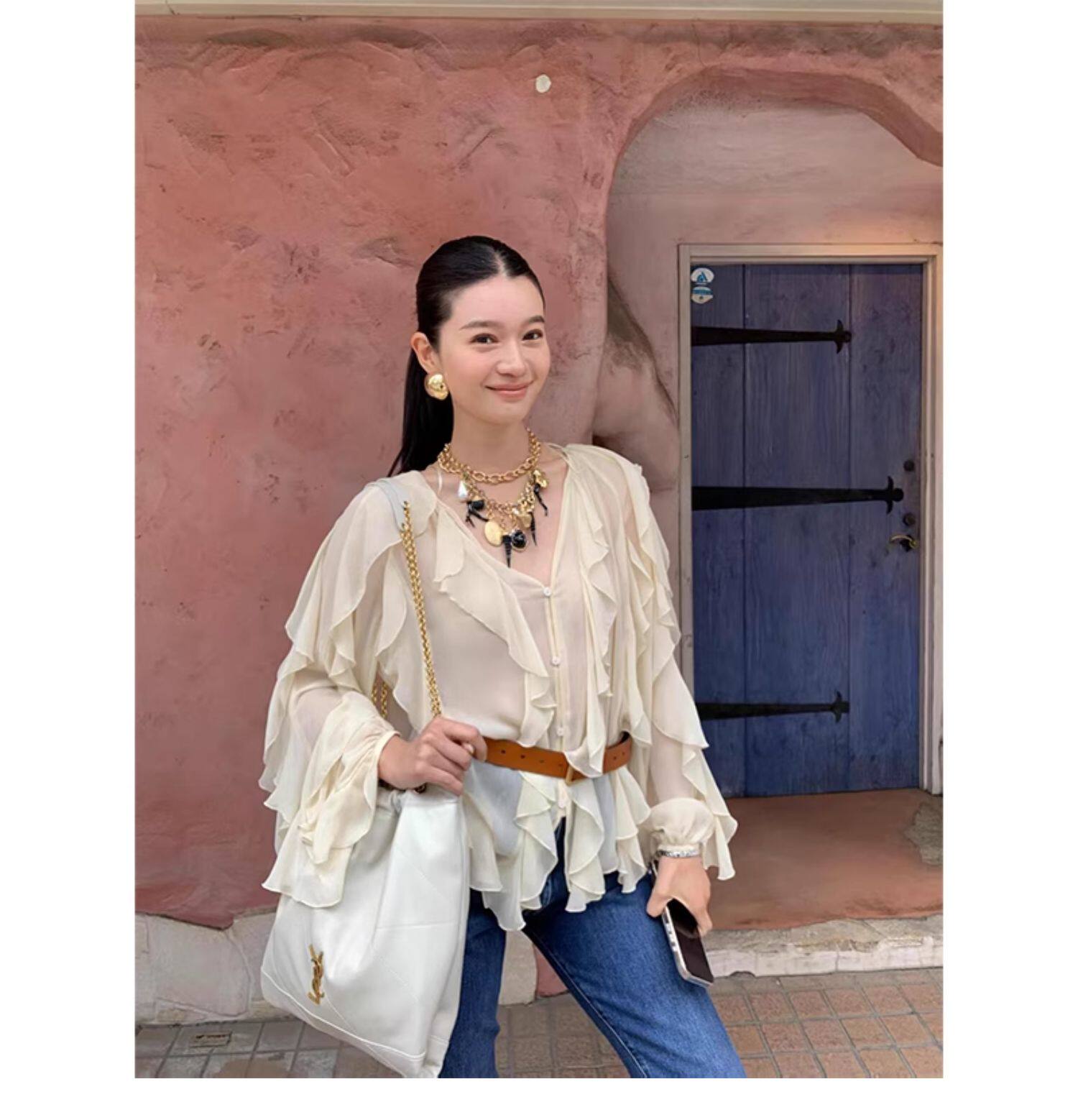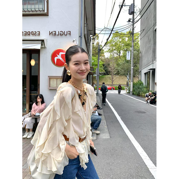 Turn right/陳大腿 設計感曡層裝飾V領防曬襯衫女荷葉邊飄逸上衣