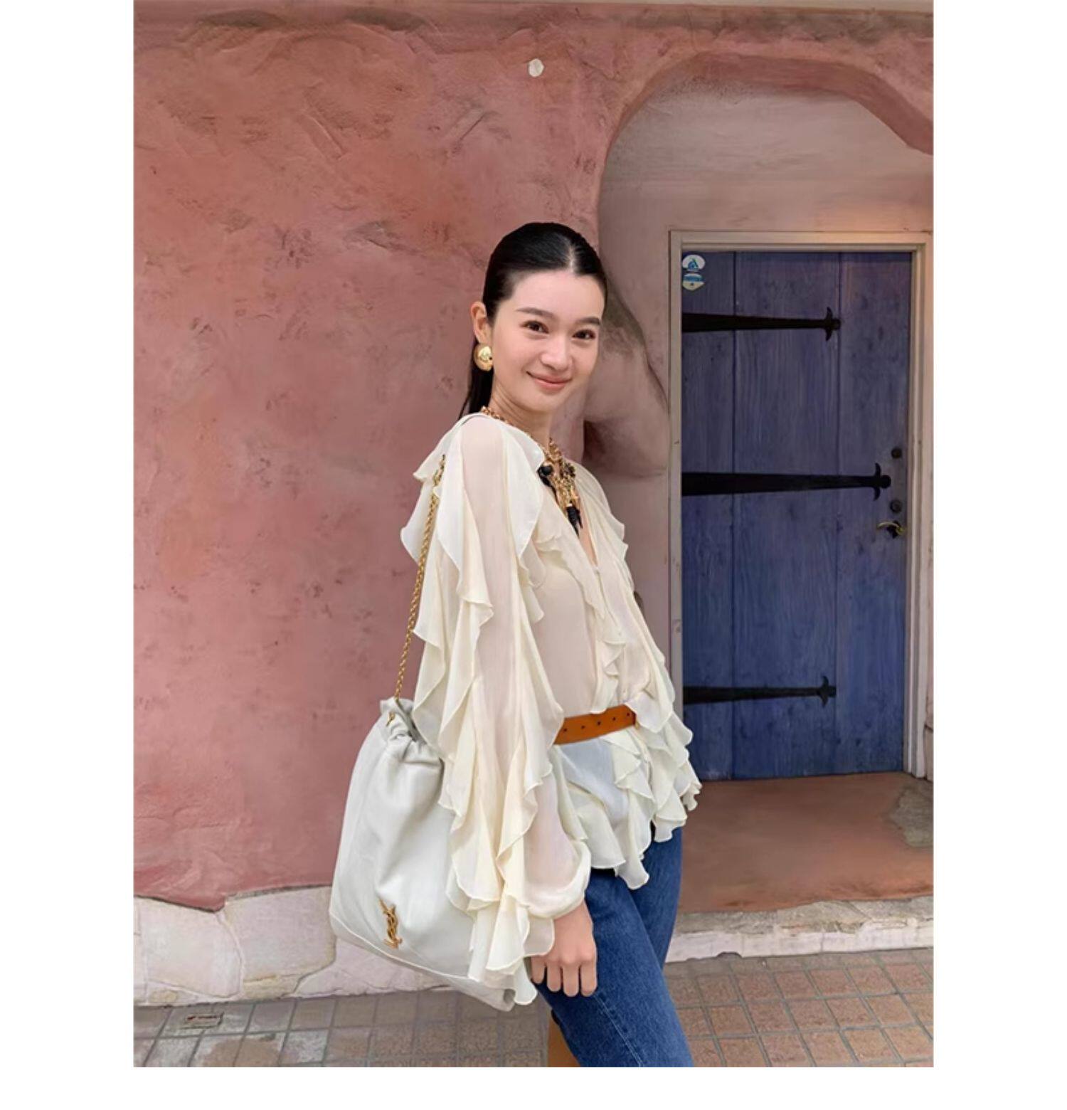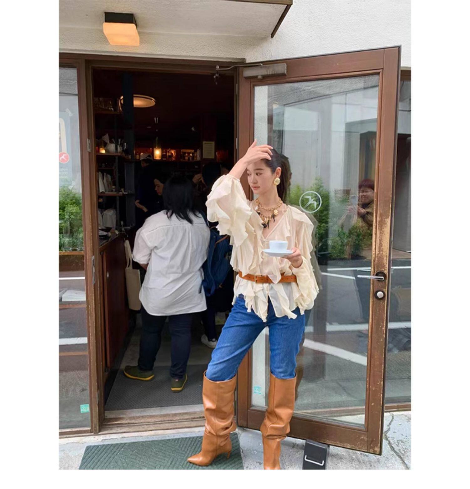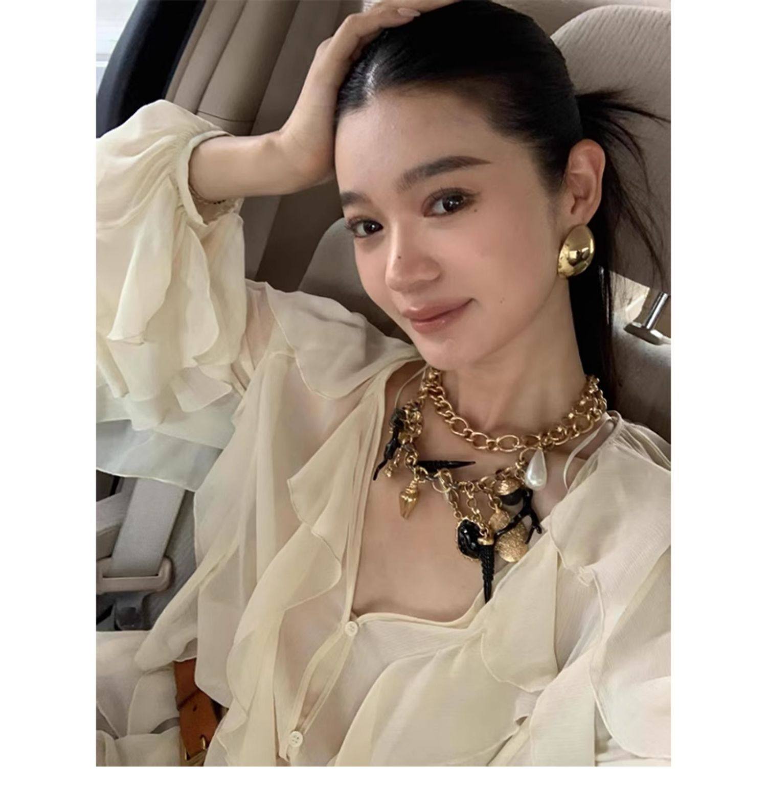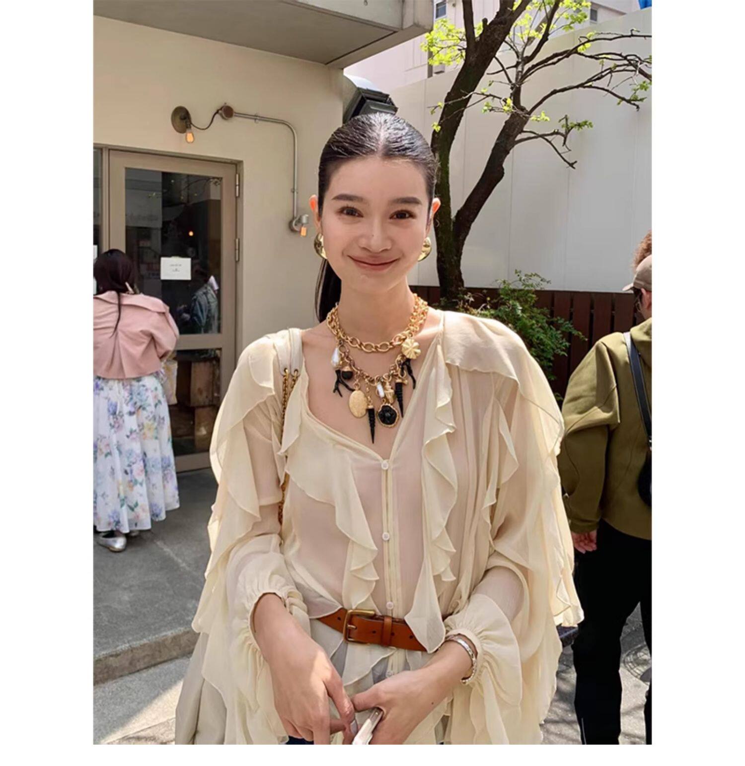 Turn right/陳大腿 設計感曡層裝飾V領防曬襯衫女荷葉邊飄逸上衣
