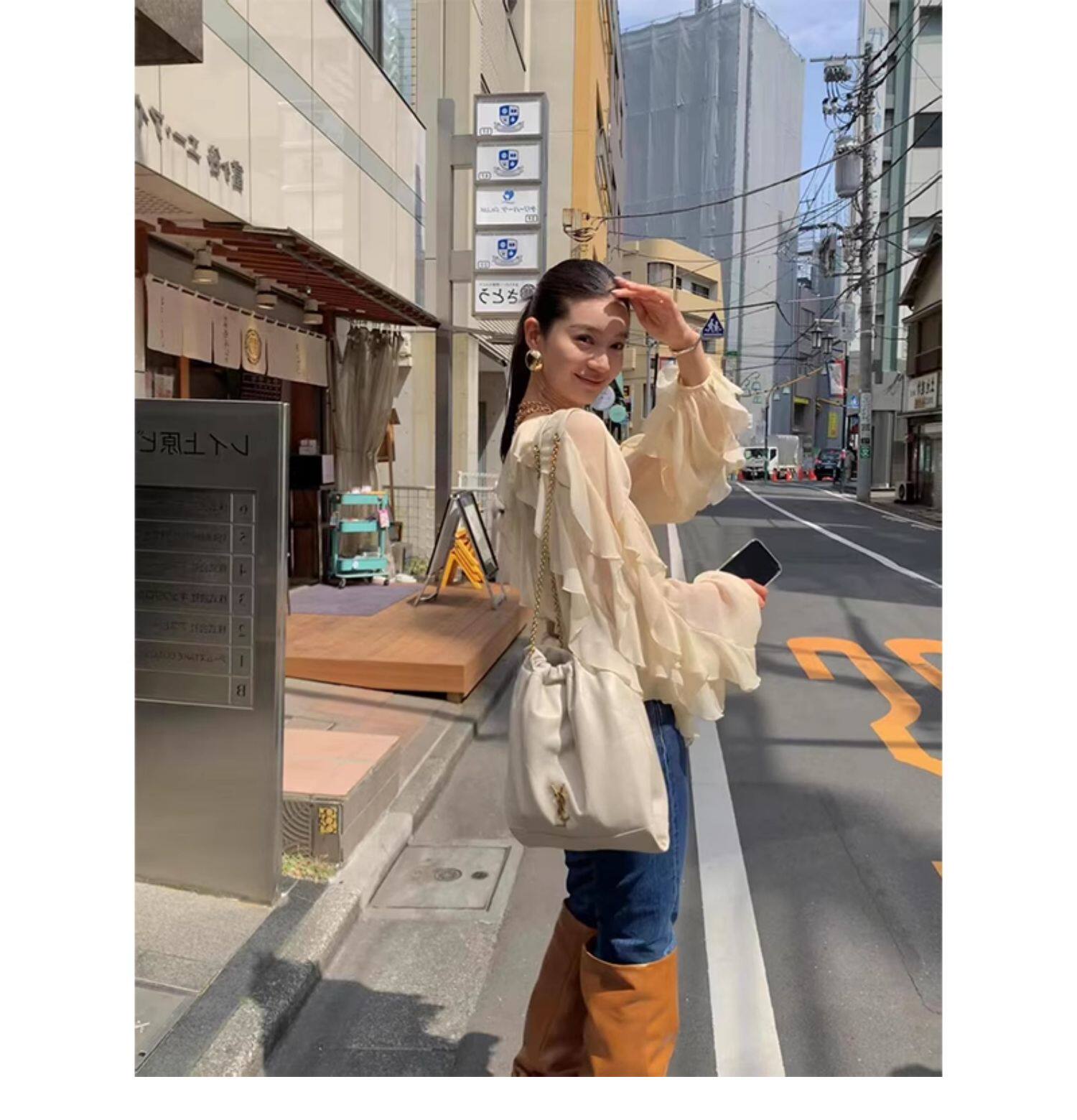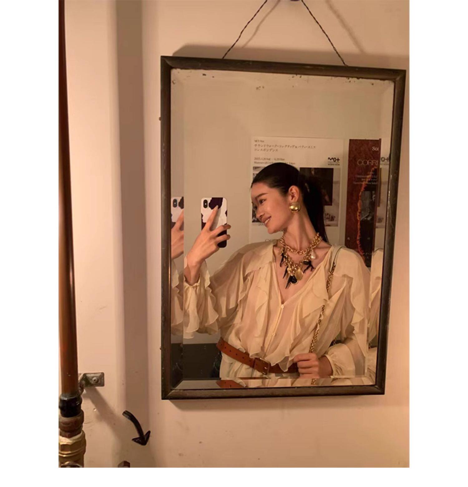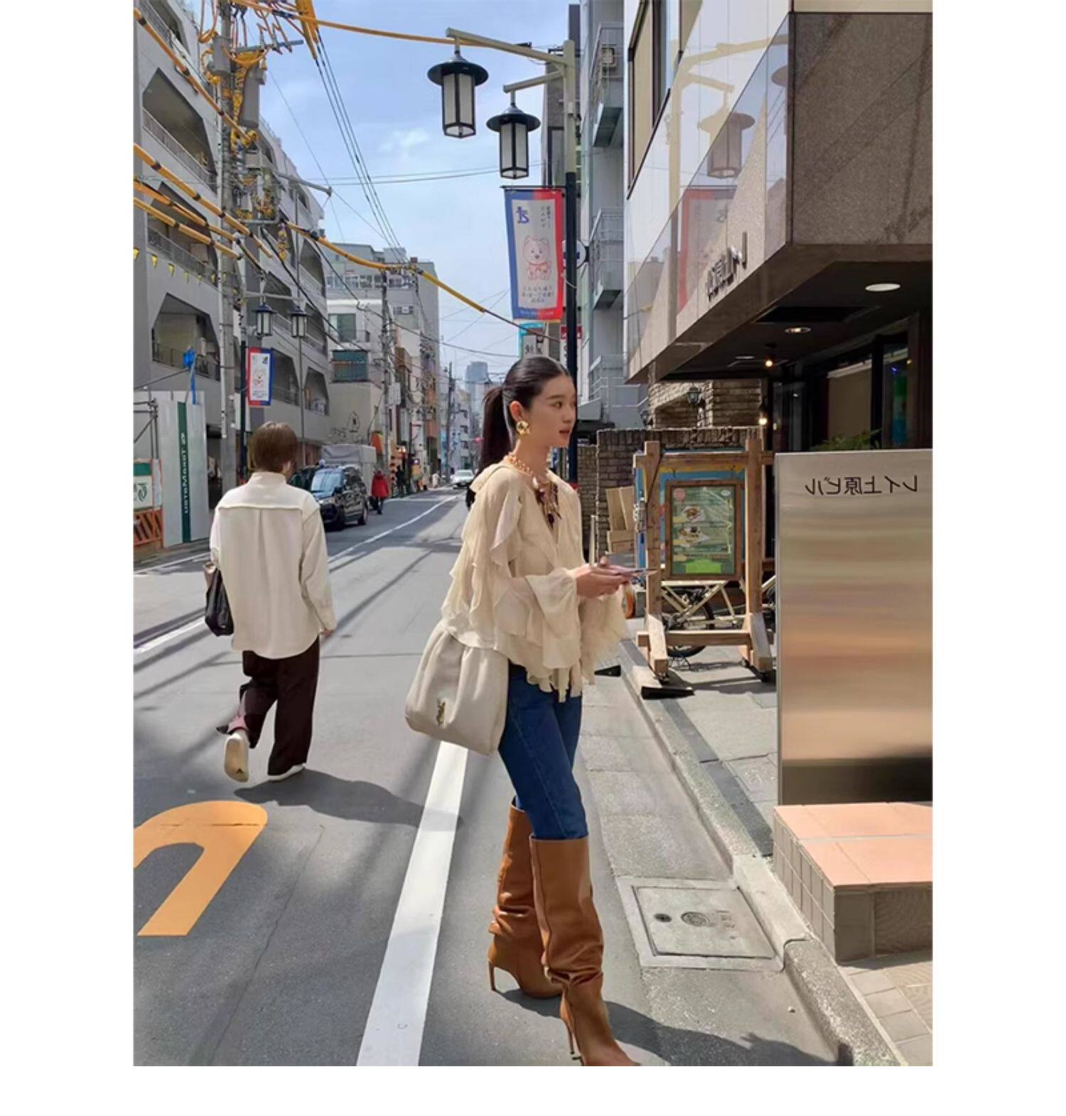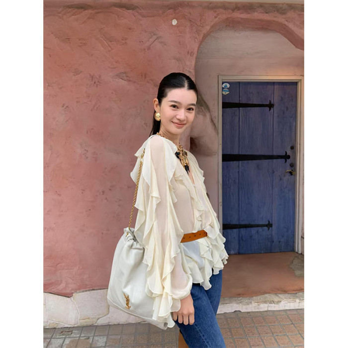 Turn right/陳大腿 設計感曡層裝飾V領防曬襯衫女荷葉邊飄逸上衣