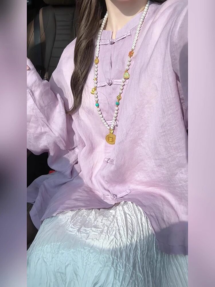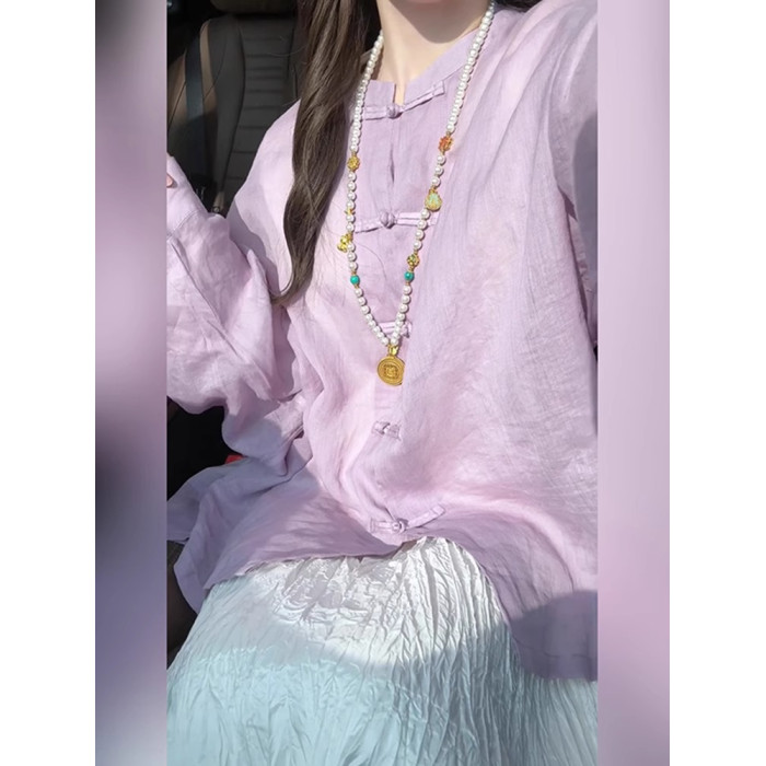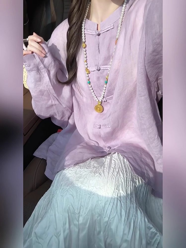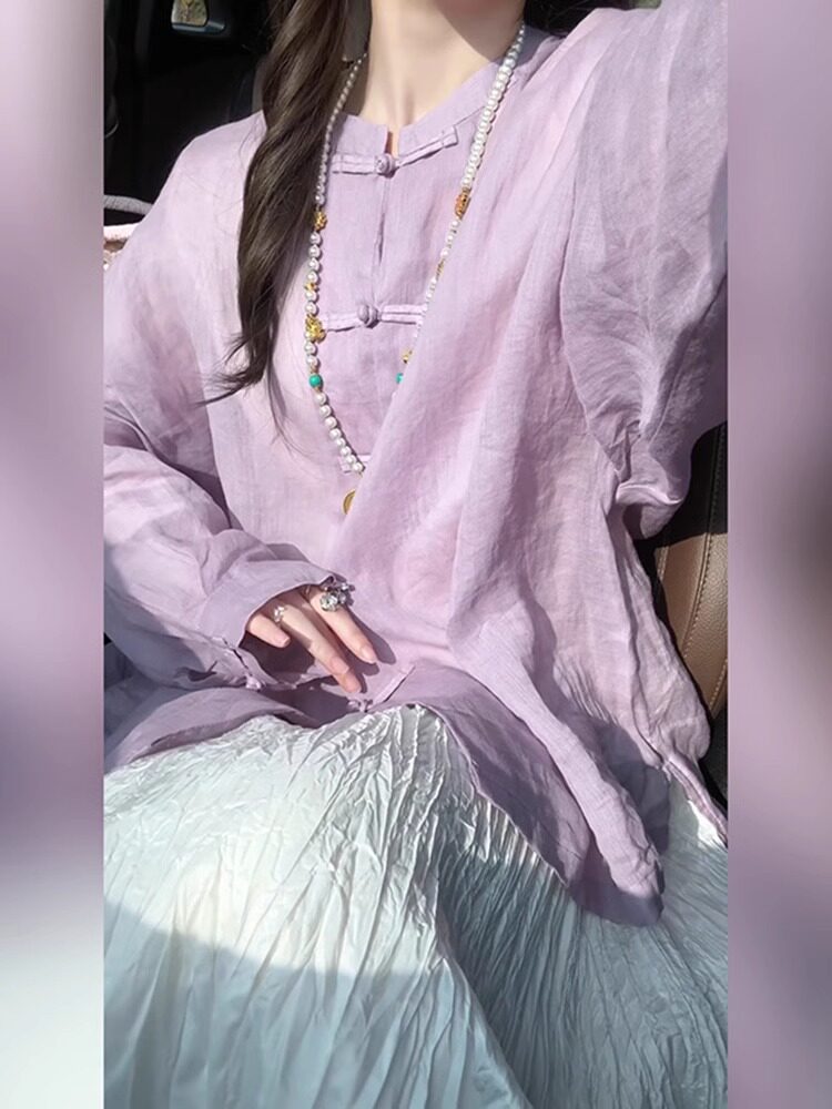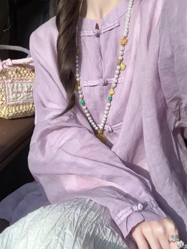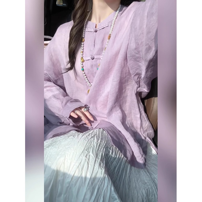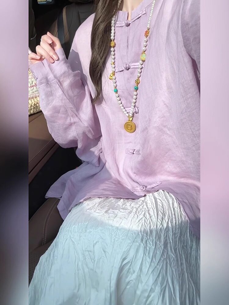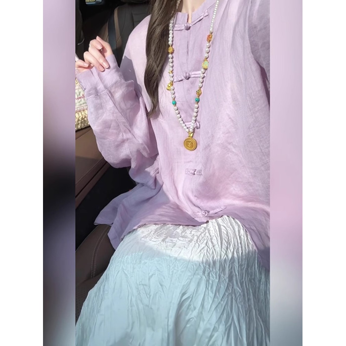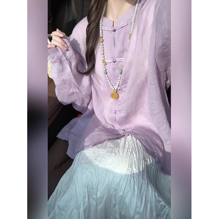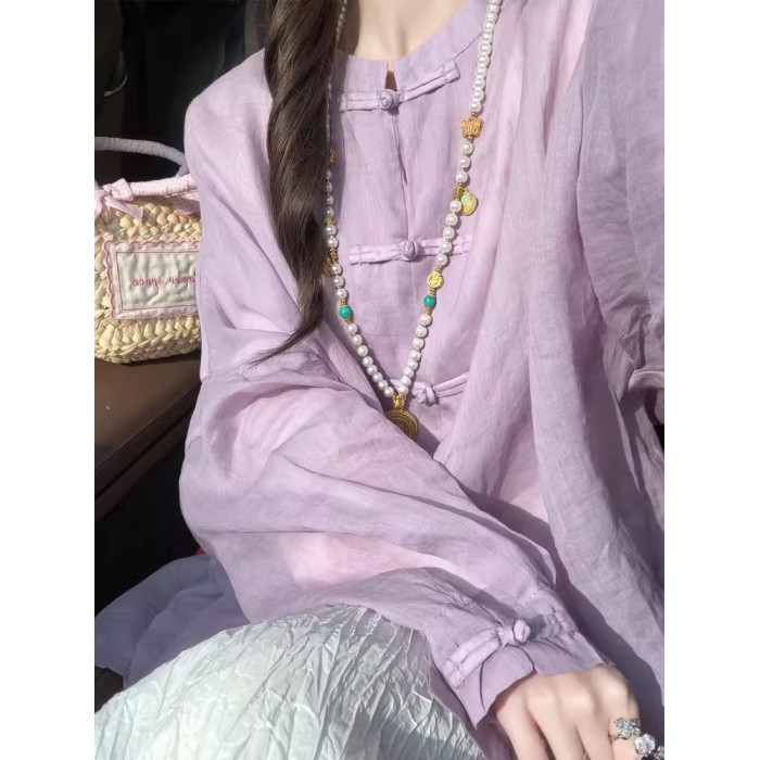國風新中式紫色盤釦襯衫女秋季2025新款外搭薄款防曬長袖氣質上衣