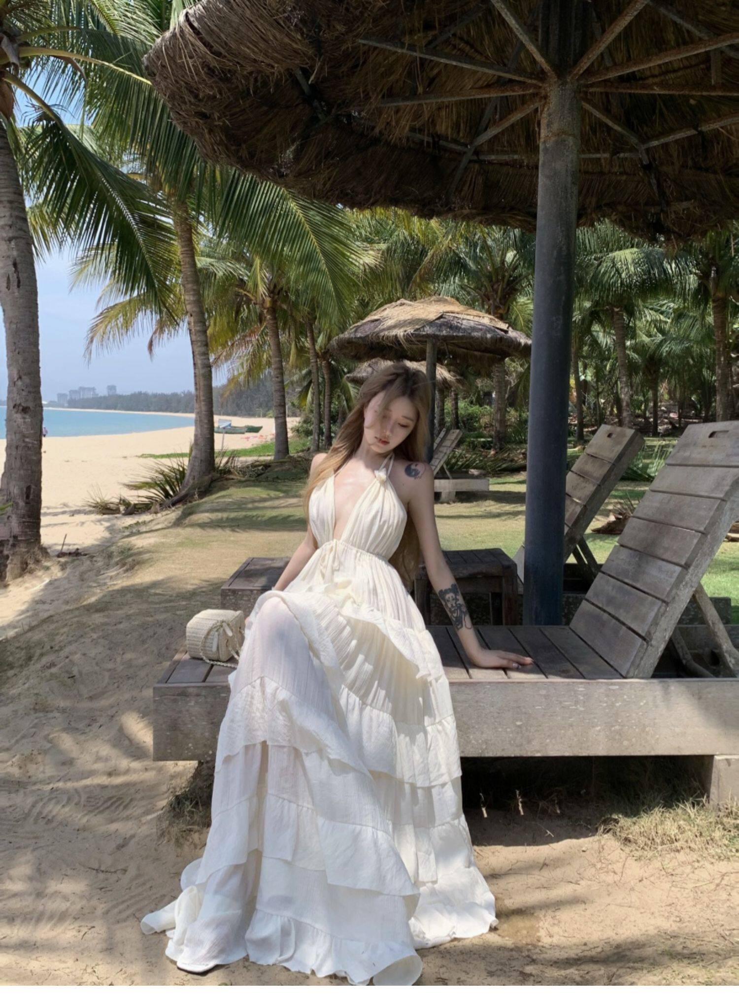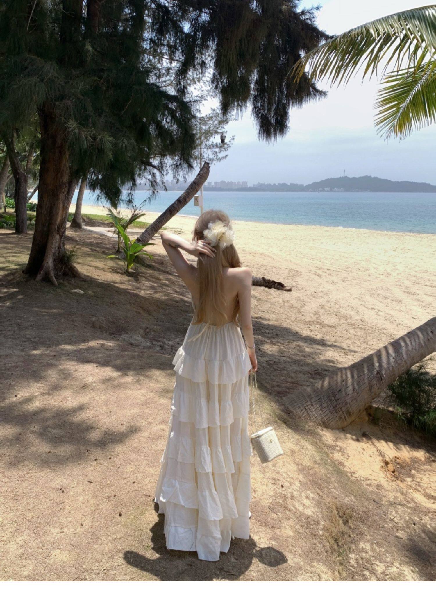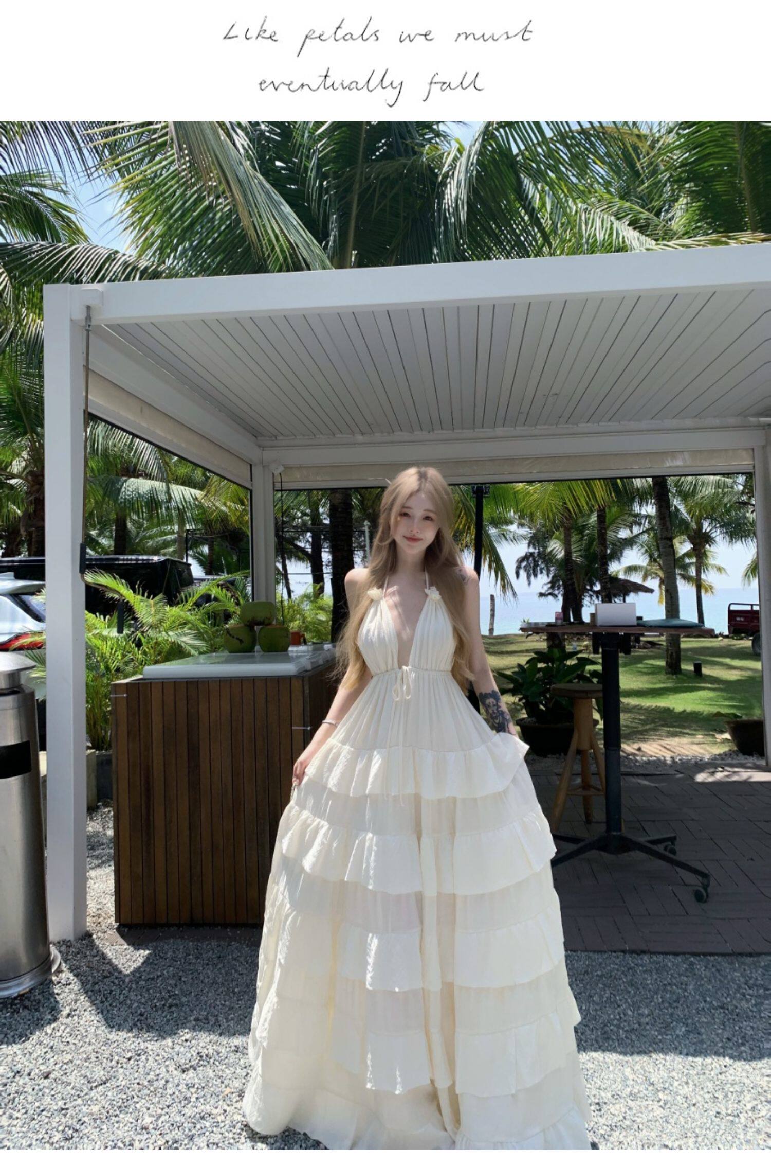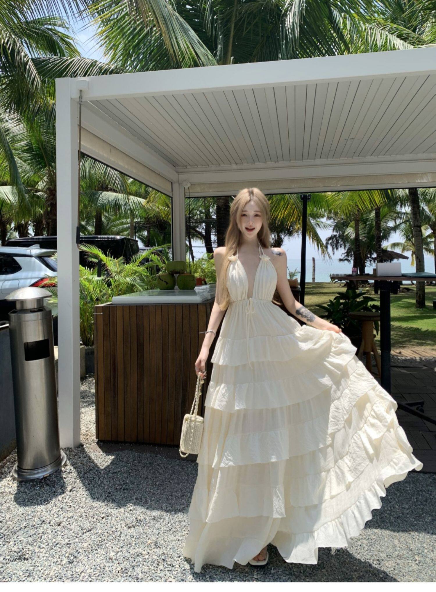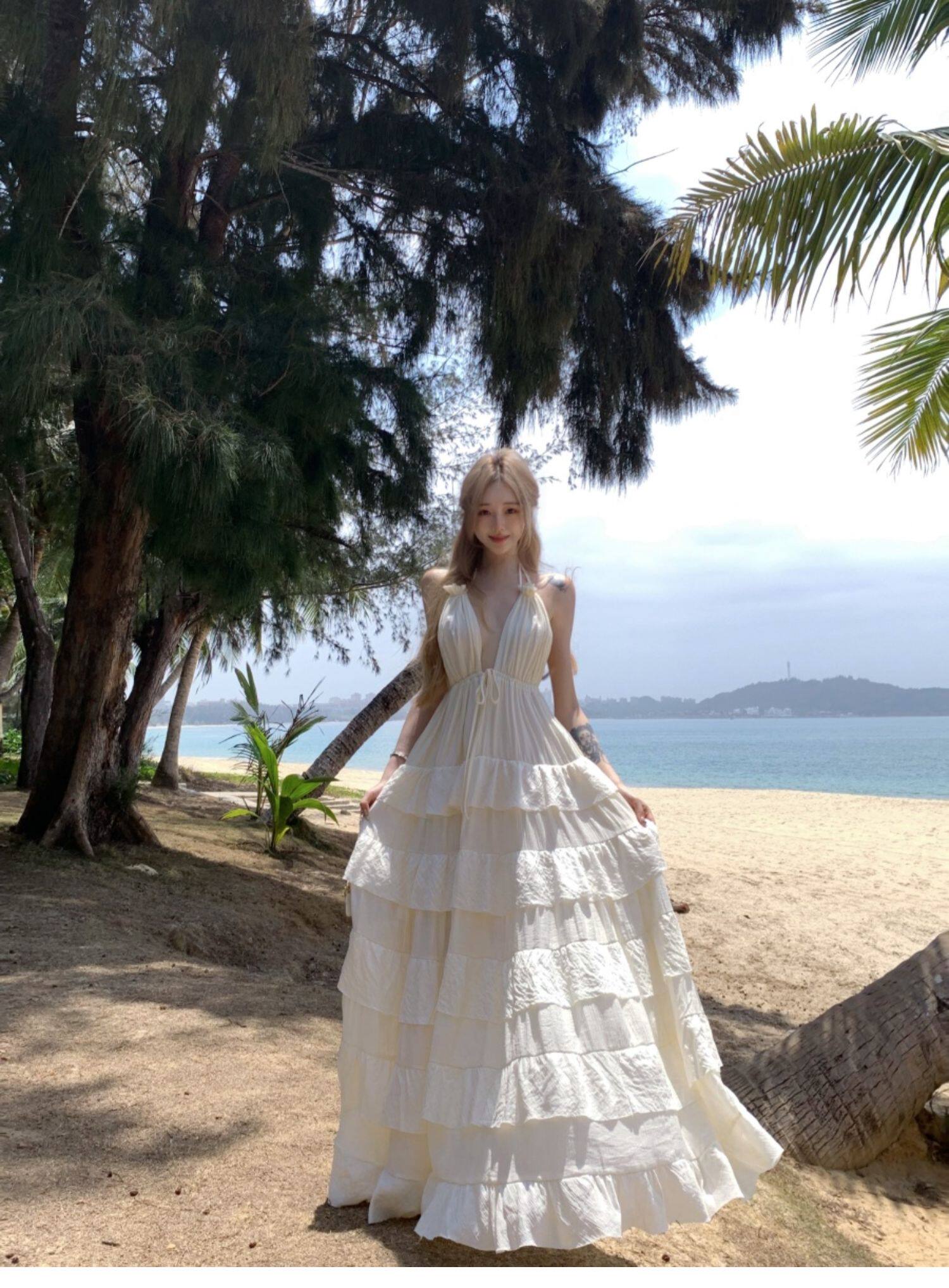 泰國海邊雲南度假棉麻V領收腰顯瘦掛脖露背荷葉邊大擺蛋糕連衣裙