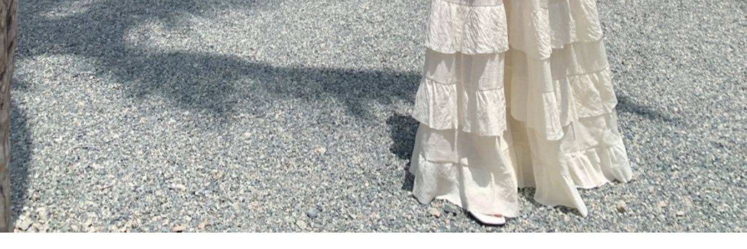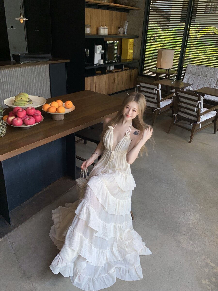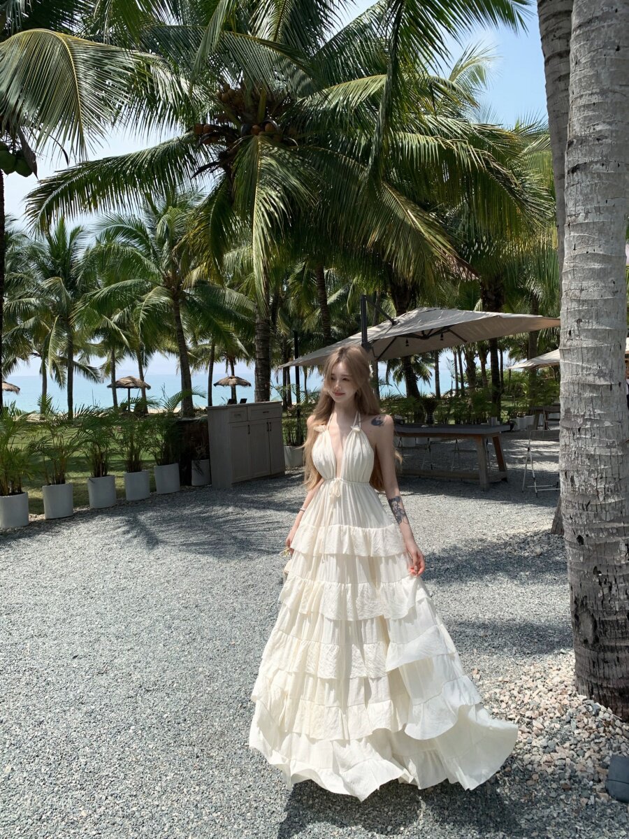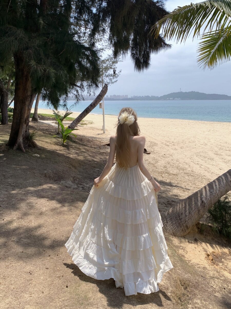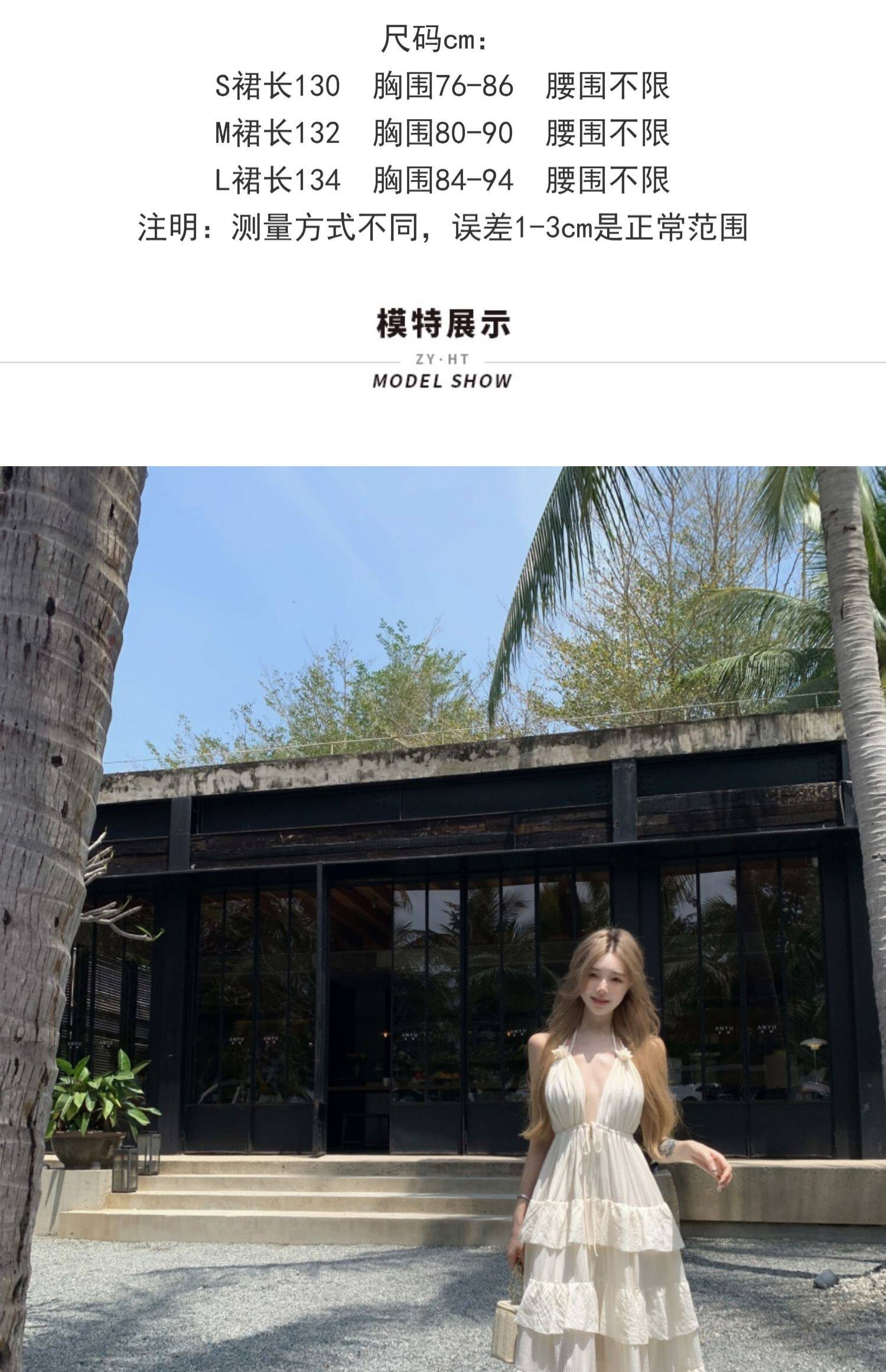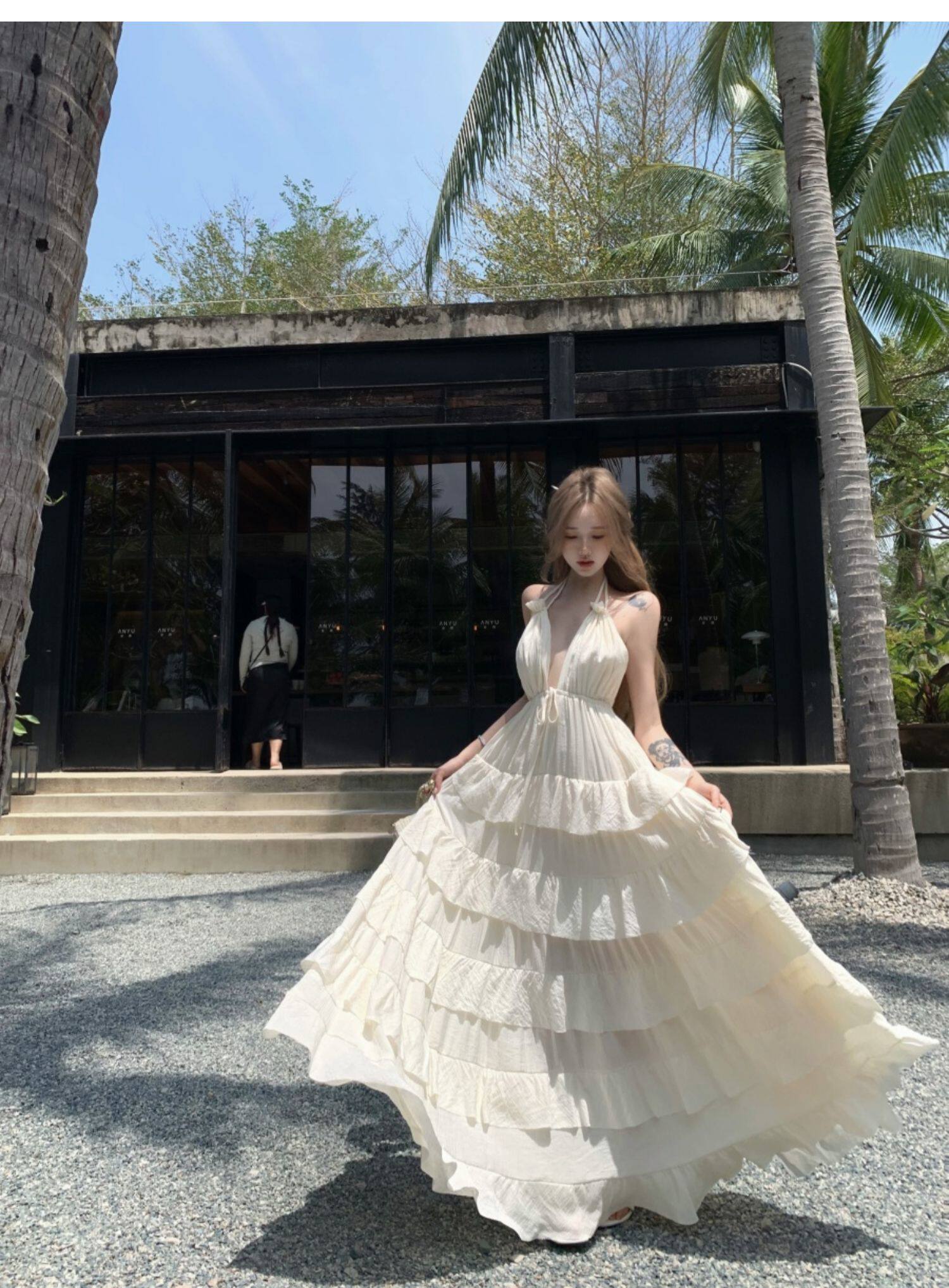 泰國海邊雲南度假棉麻V領收腰顯瘦掛脖露背荷葉邊大擺蛋糕連衣裙