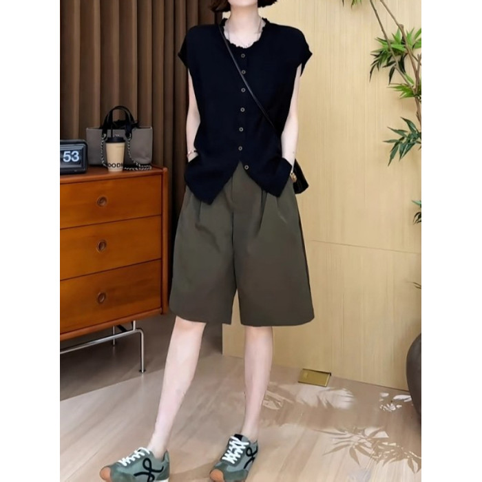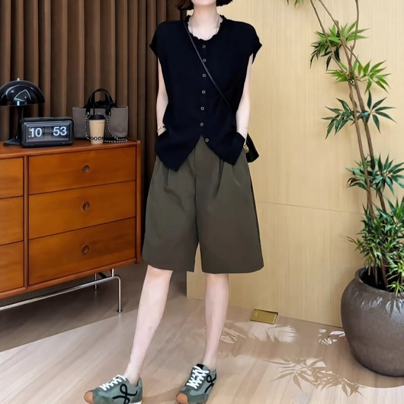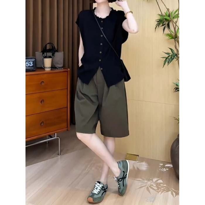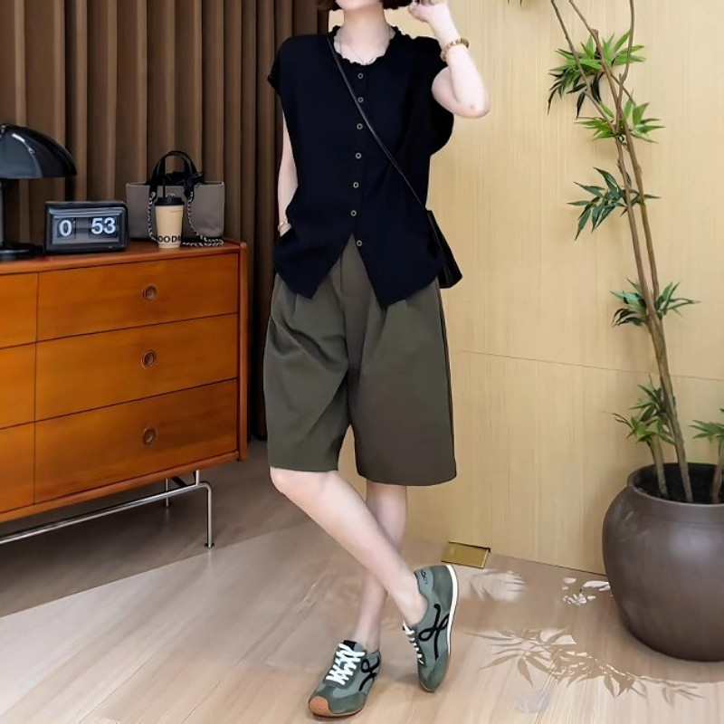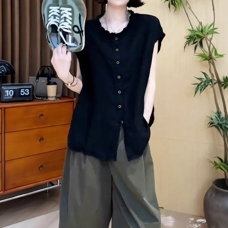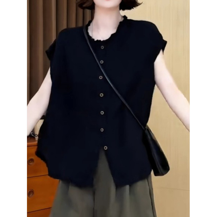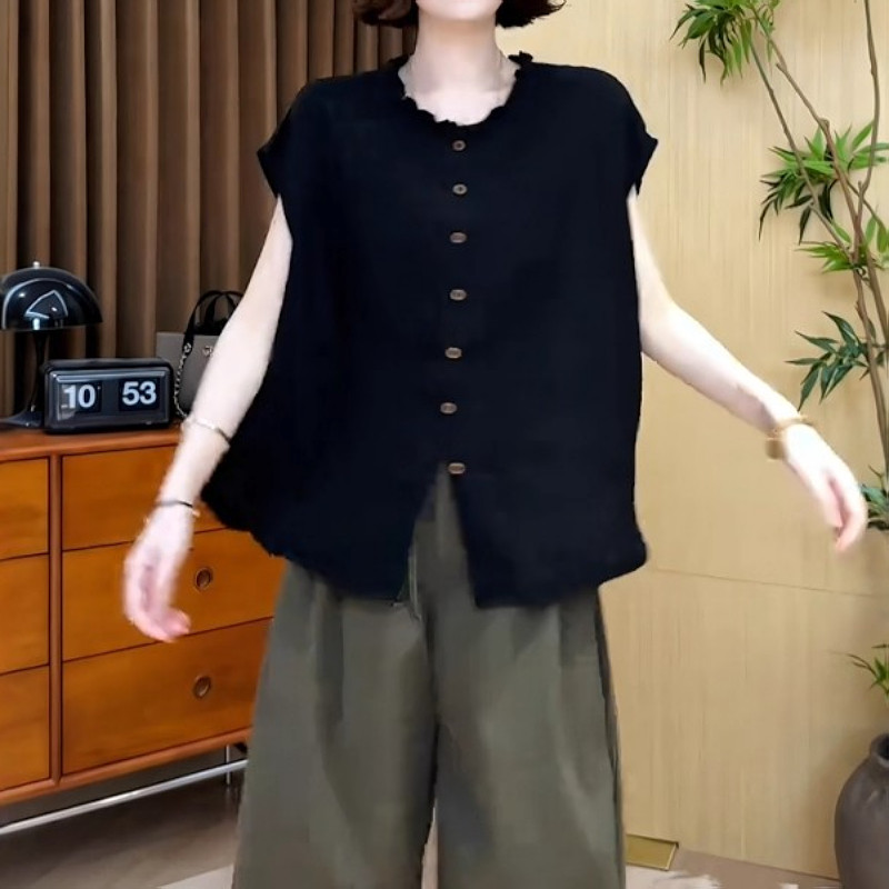 大碼女裝黑色圓領木耳邊單排釦短袖襯衫上衣胖mm寬鬆顯瘦氣質小衫