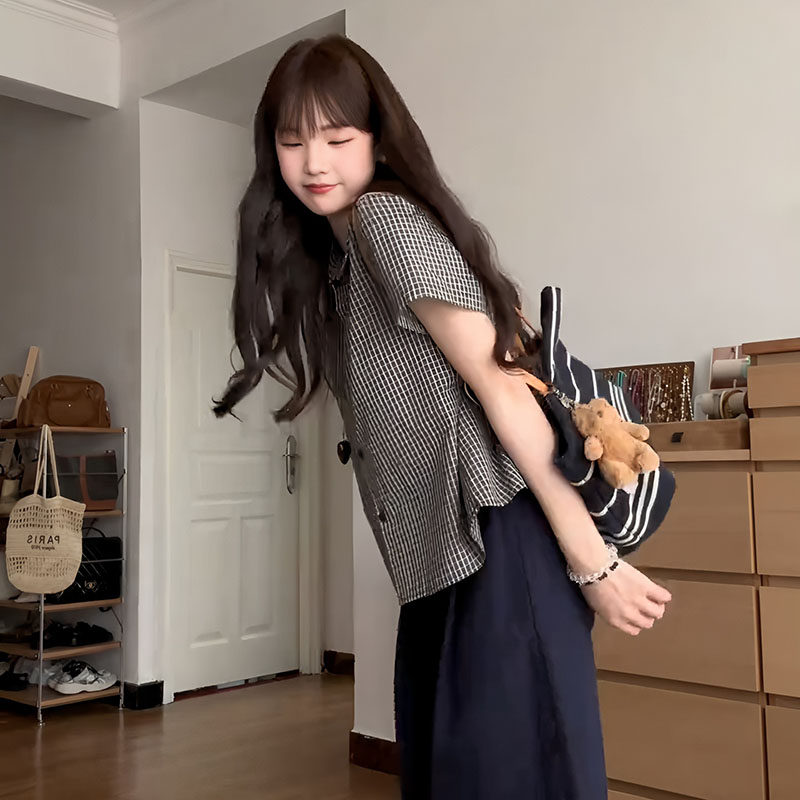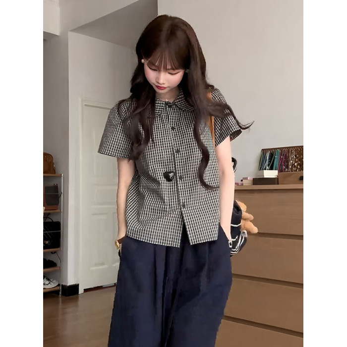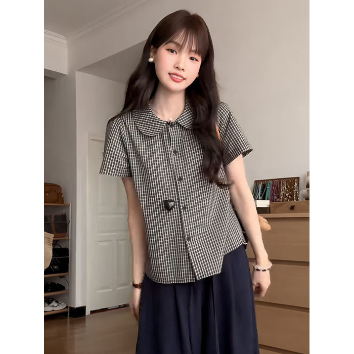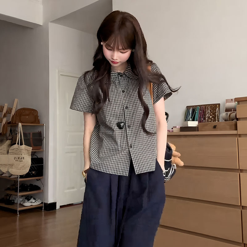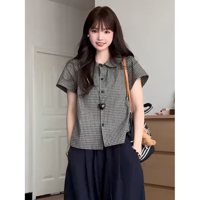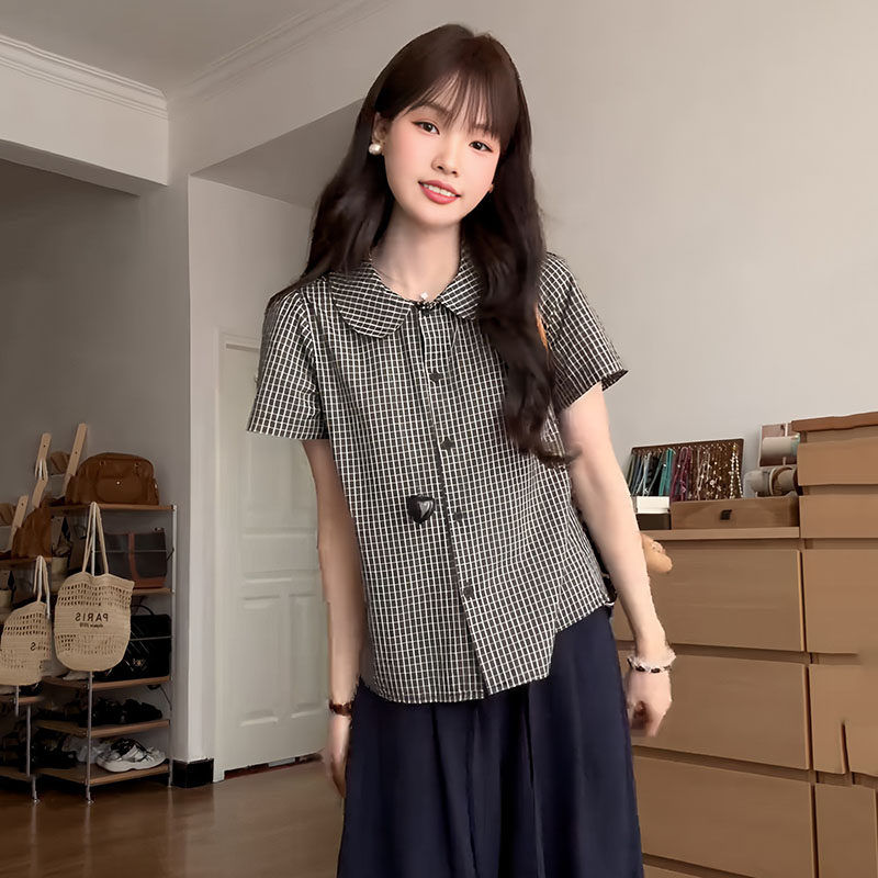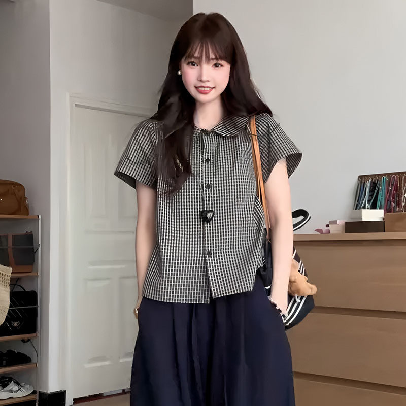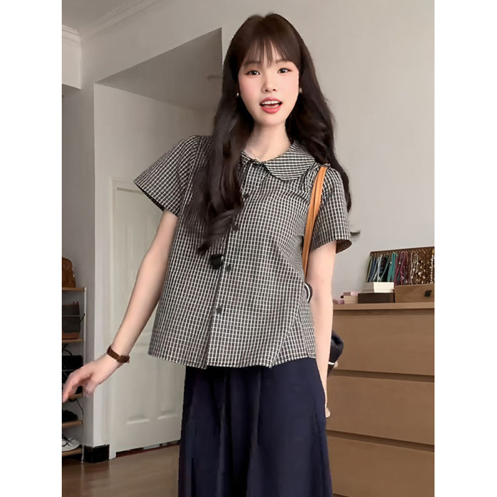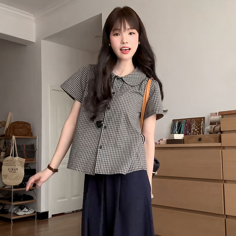 大碼學院風娃娃領格子短袖襯衫女夏季胖mm寬鬆巨顯瘦減齡小衫上衣