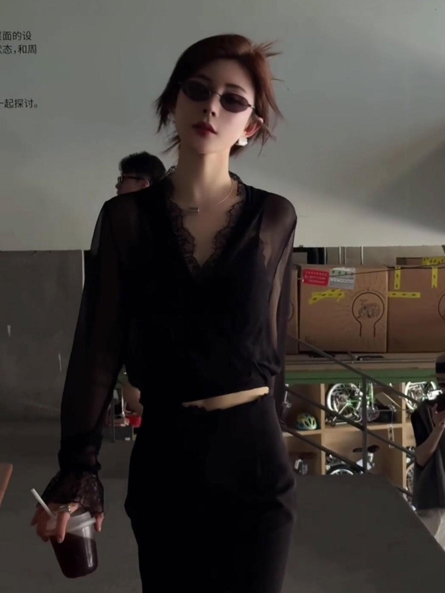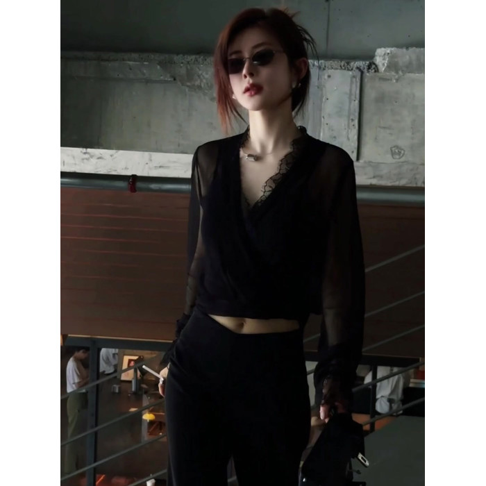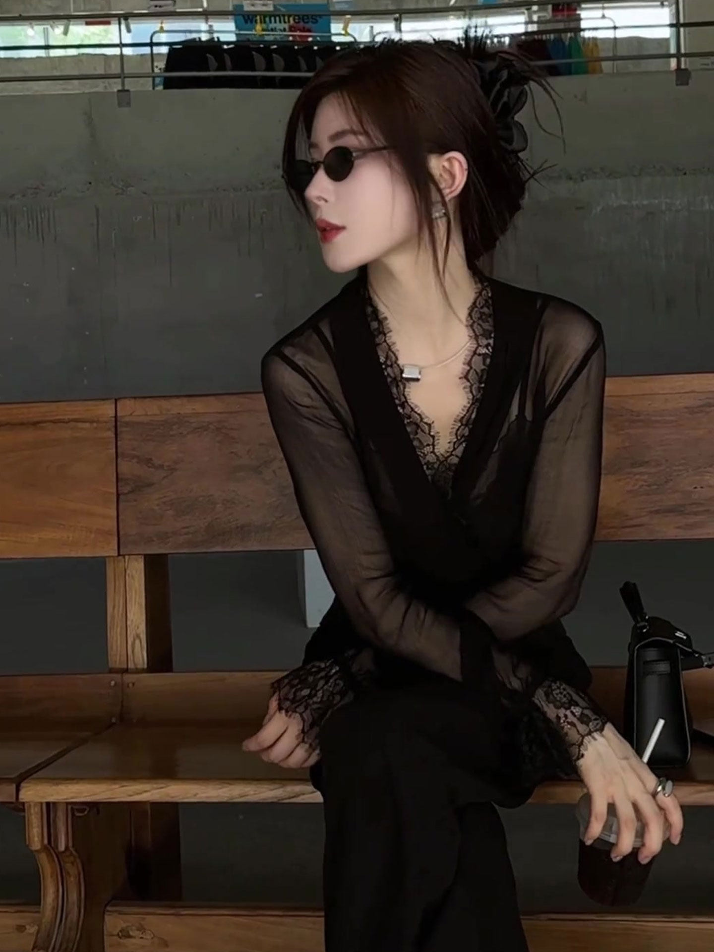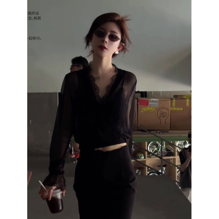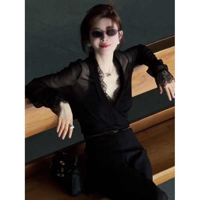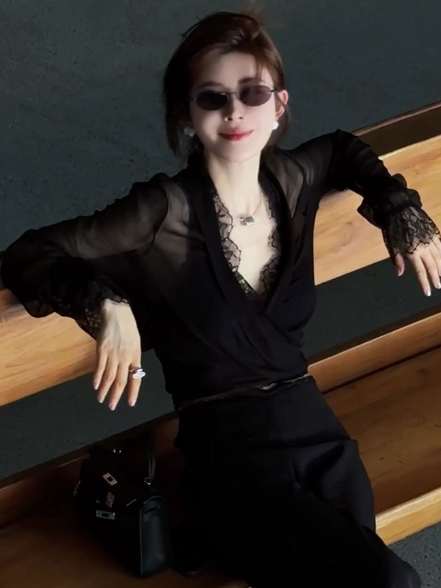 歐貨高級大牌輕薄透氣長袖罩衫上衣2025夏季修身蕾絲拼接漂亮小衫