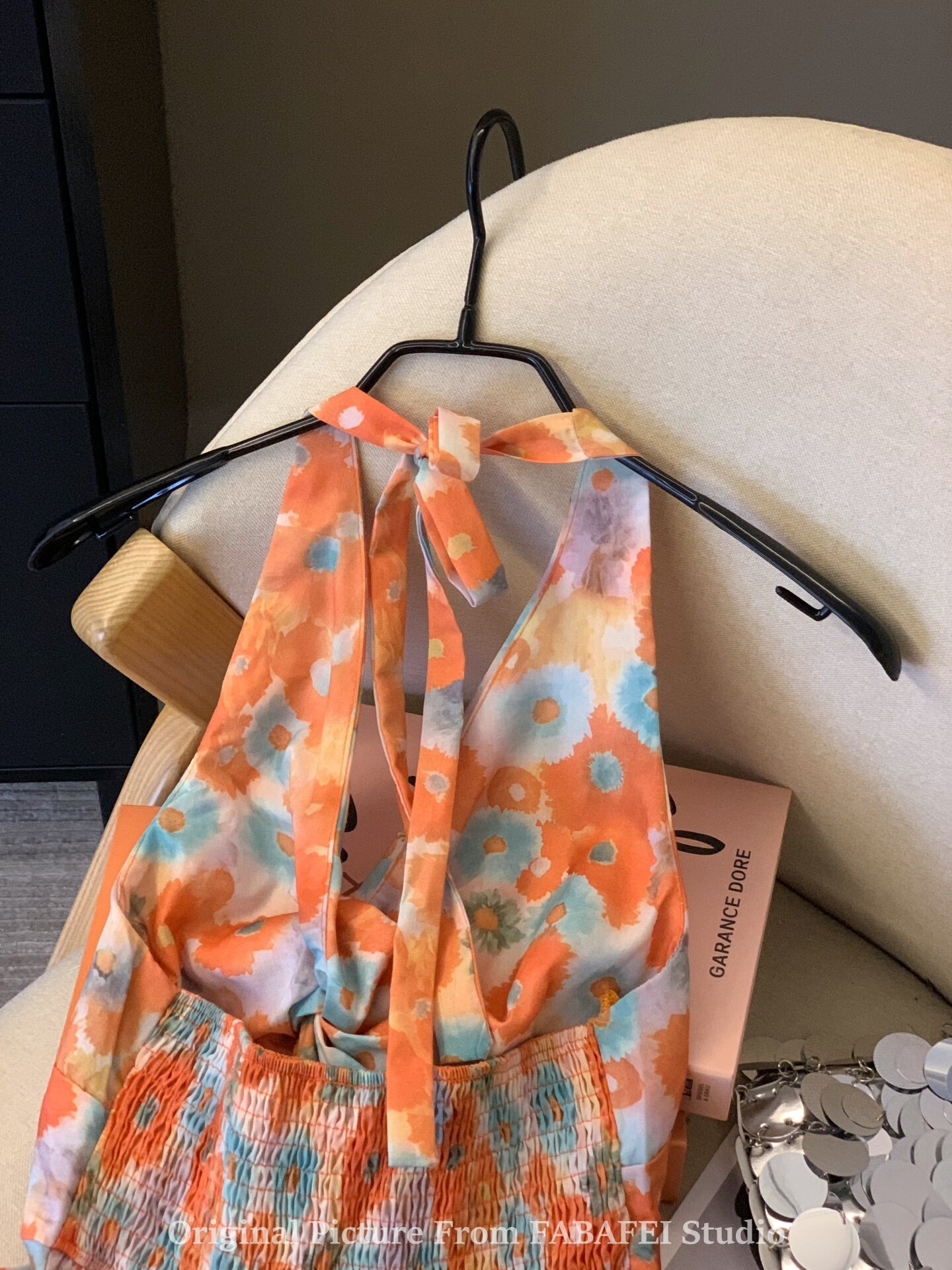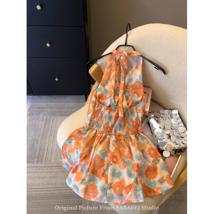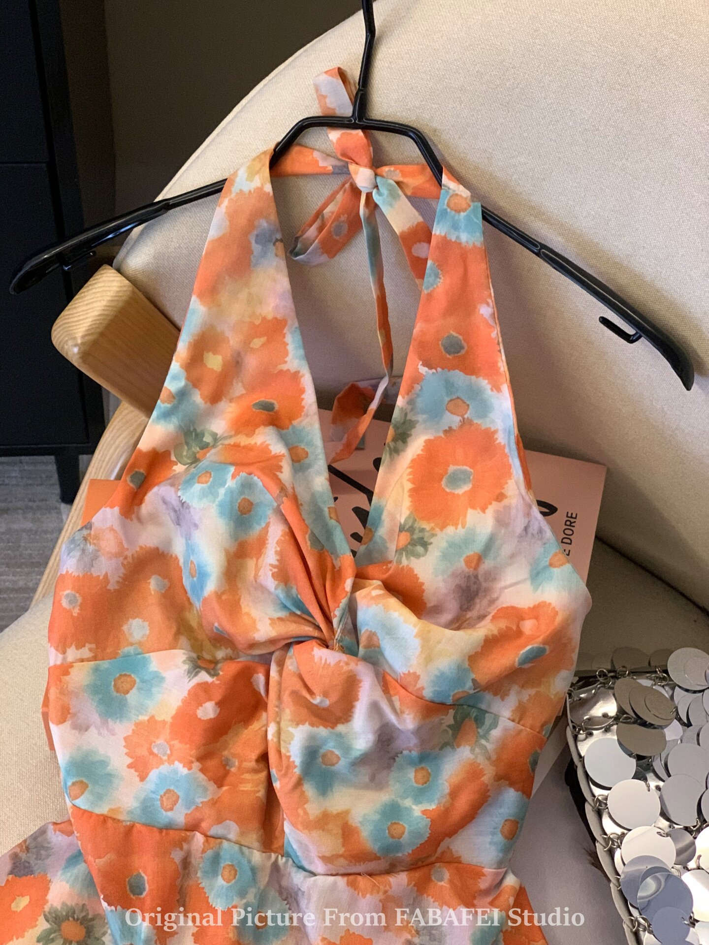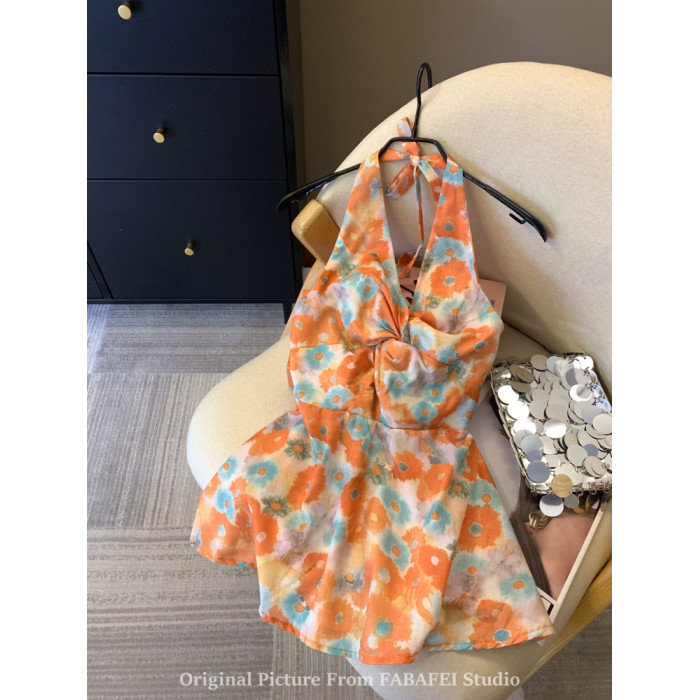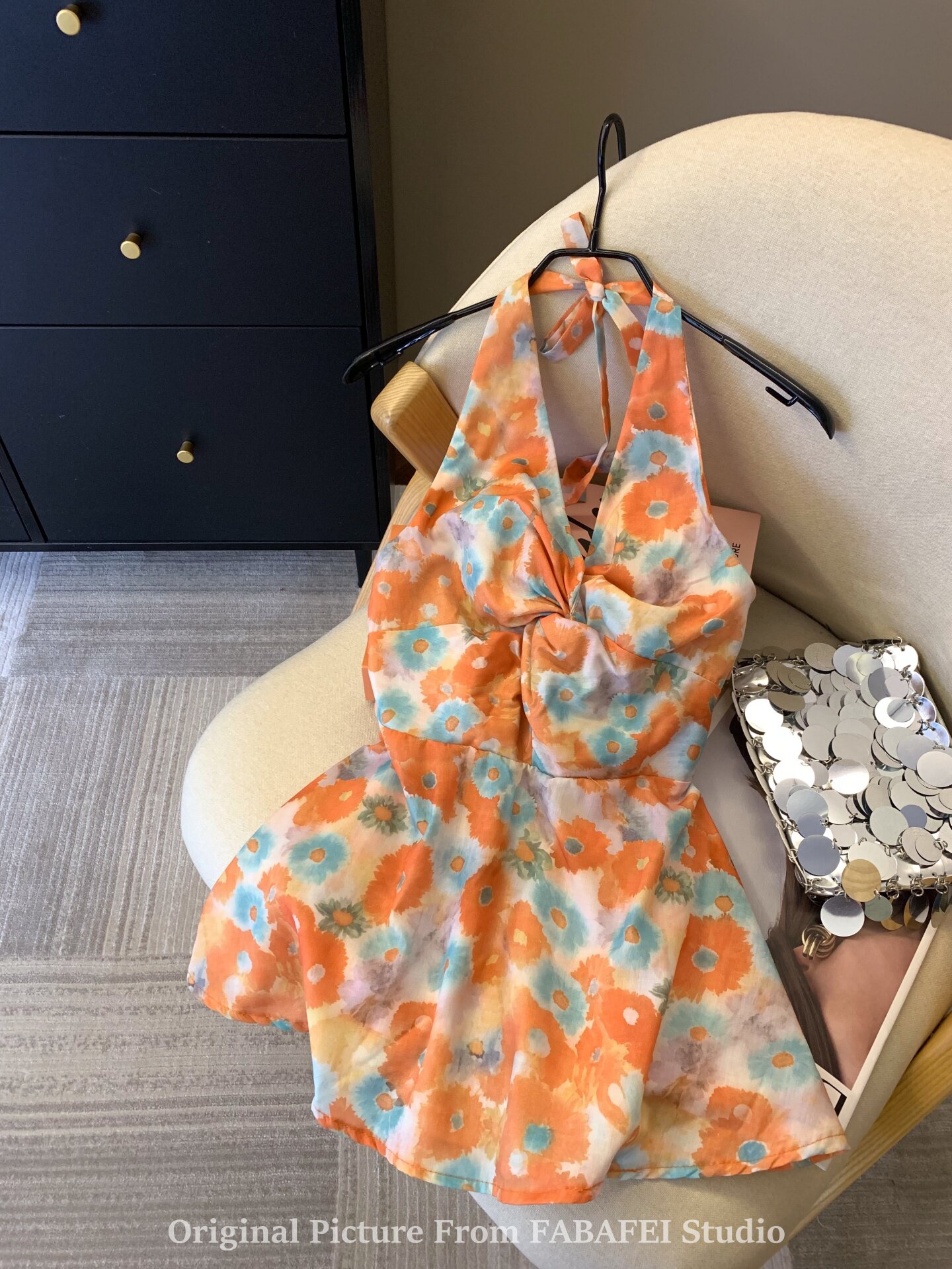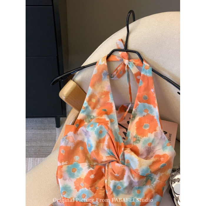 專櫃撤廻剪標音樂節多巴胺碎花背心襯衫女夏季設計感扭結掛脖上衣