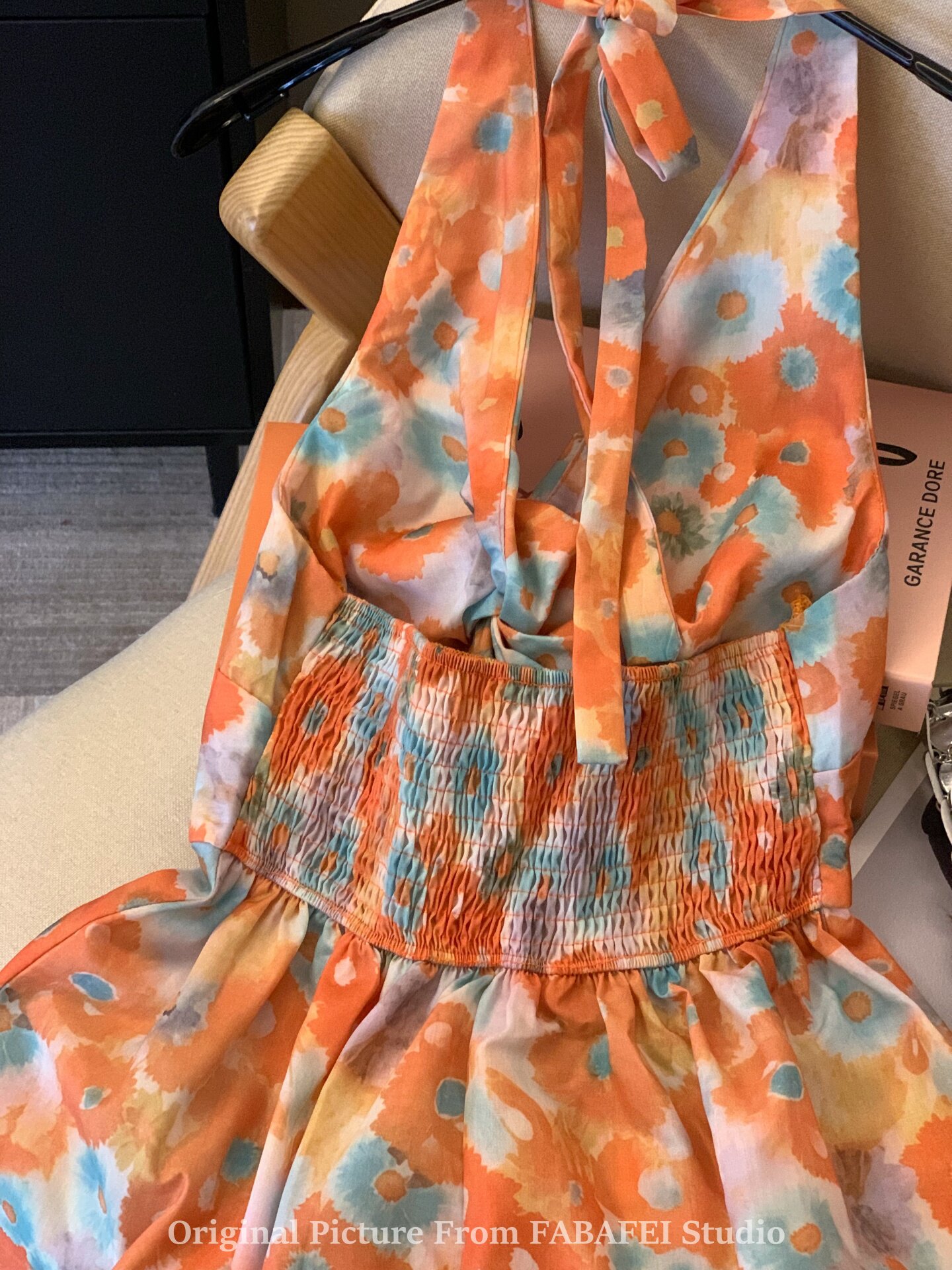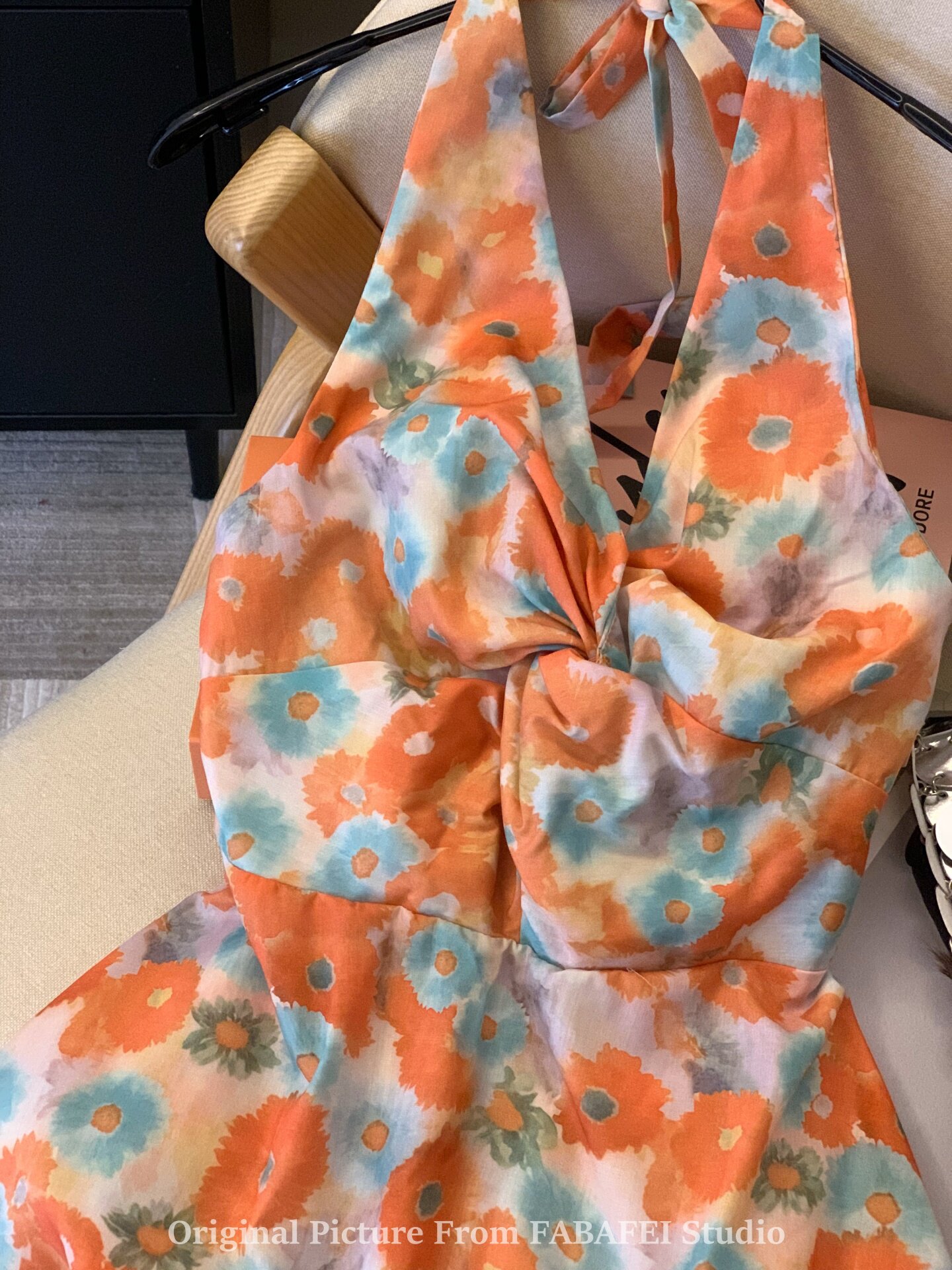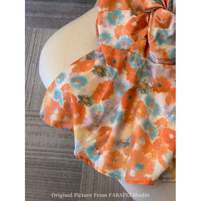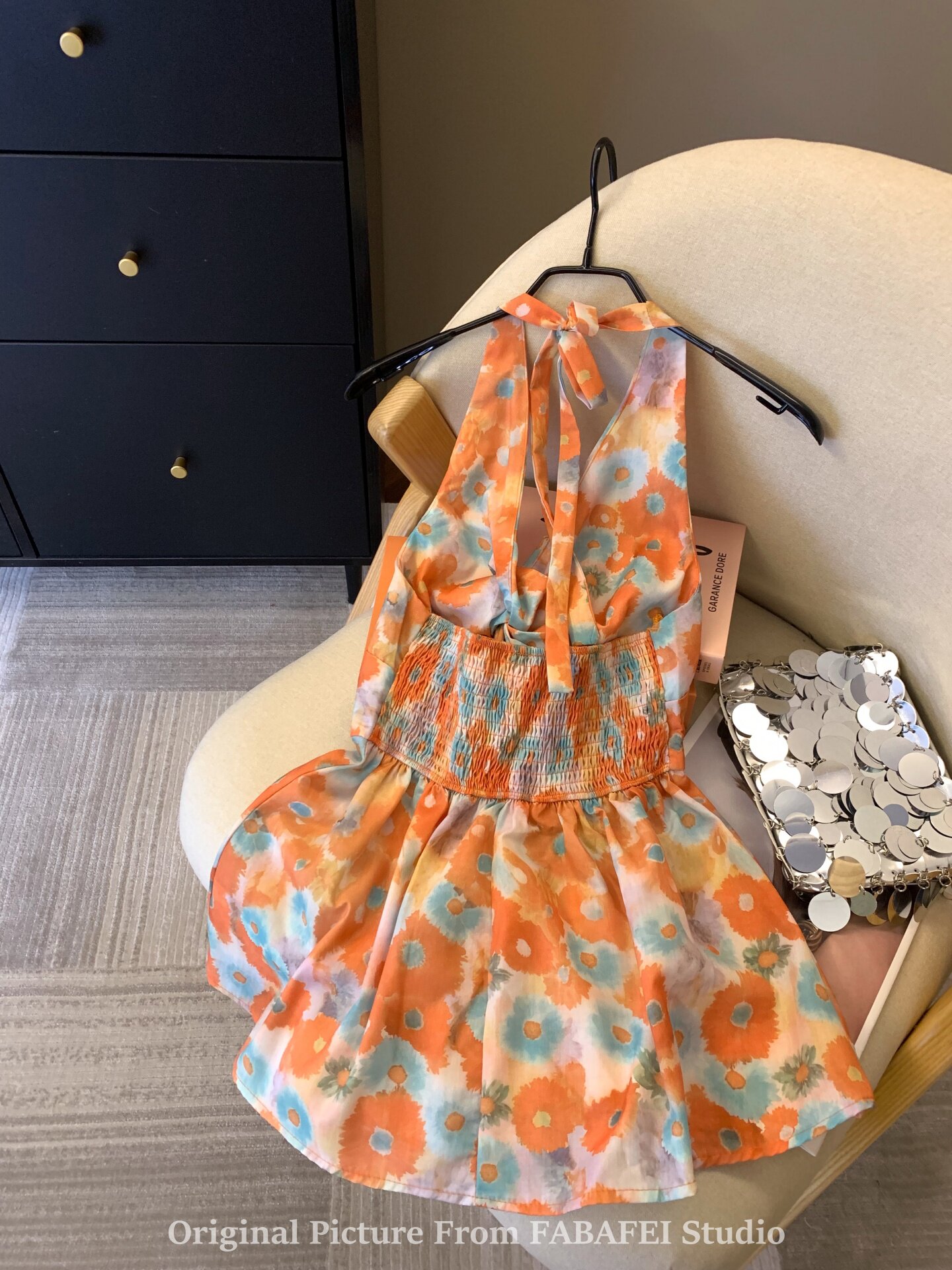 專櫃撤廻剪標音樂節多巴胺碎花背心襯衫女夏季設計感扭結掛脖上衣