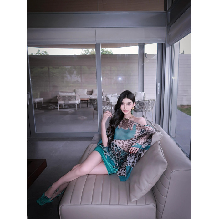 OUTFlT 歐美辣妹風性感豹紋斜肩襯衫喇叭袖罩衫上衣2025新款