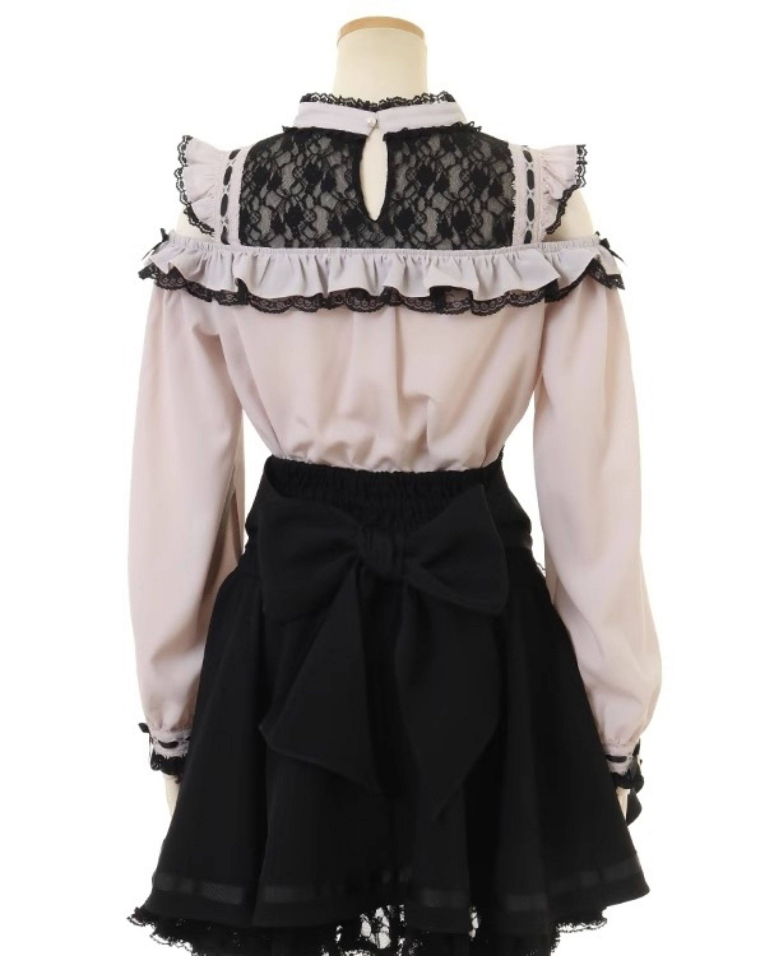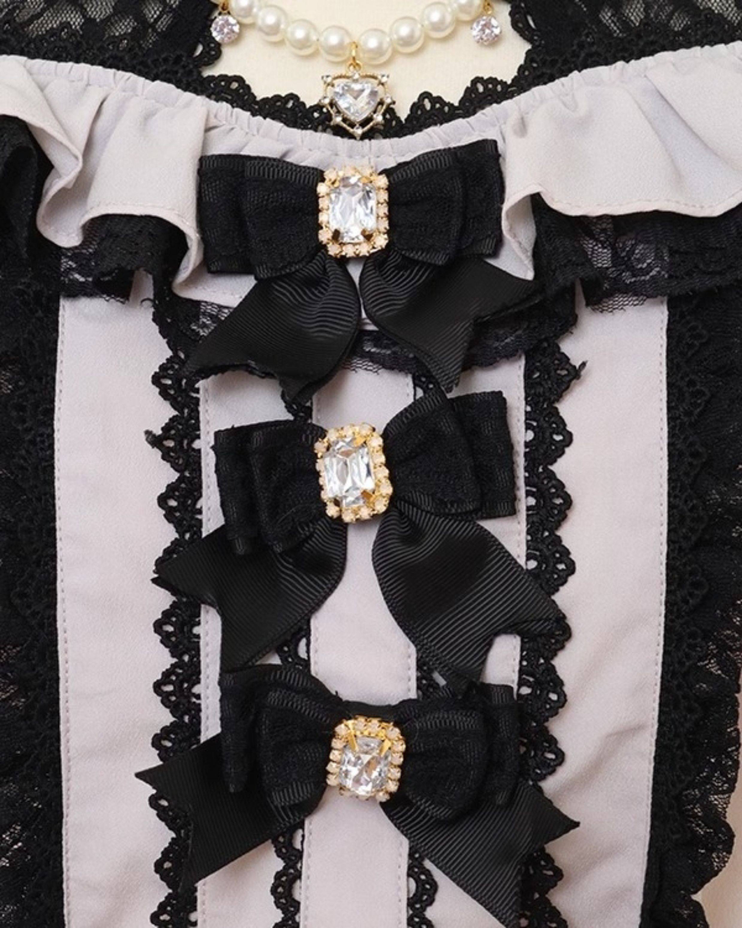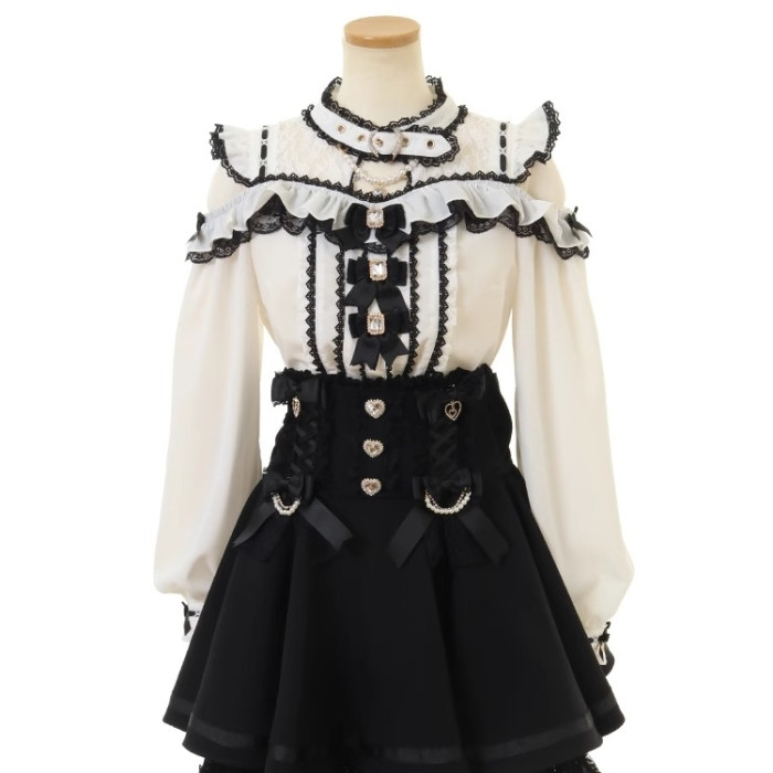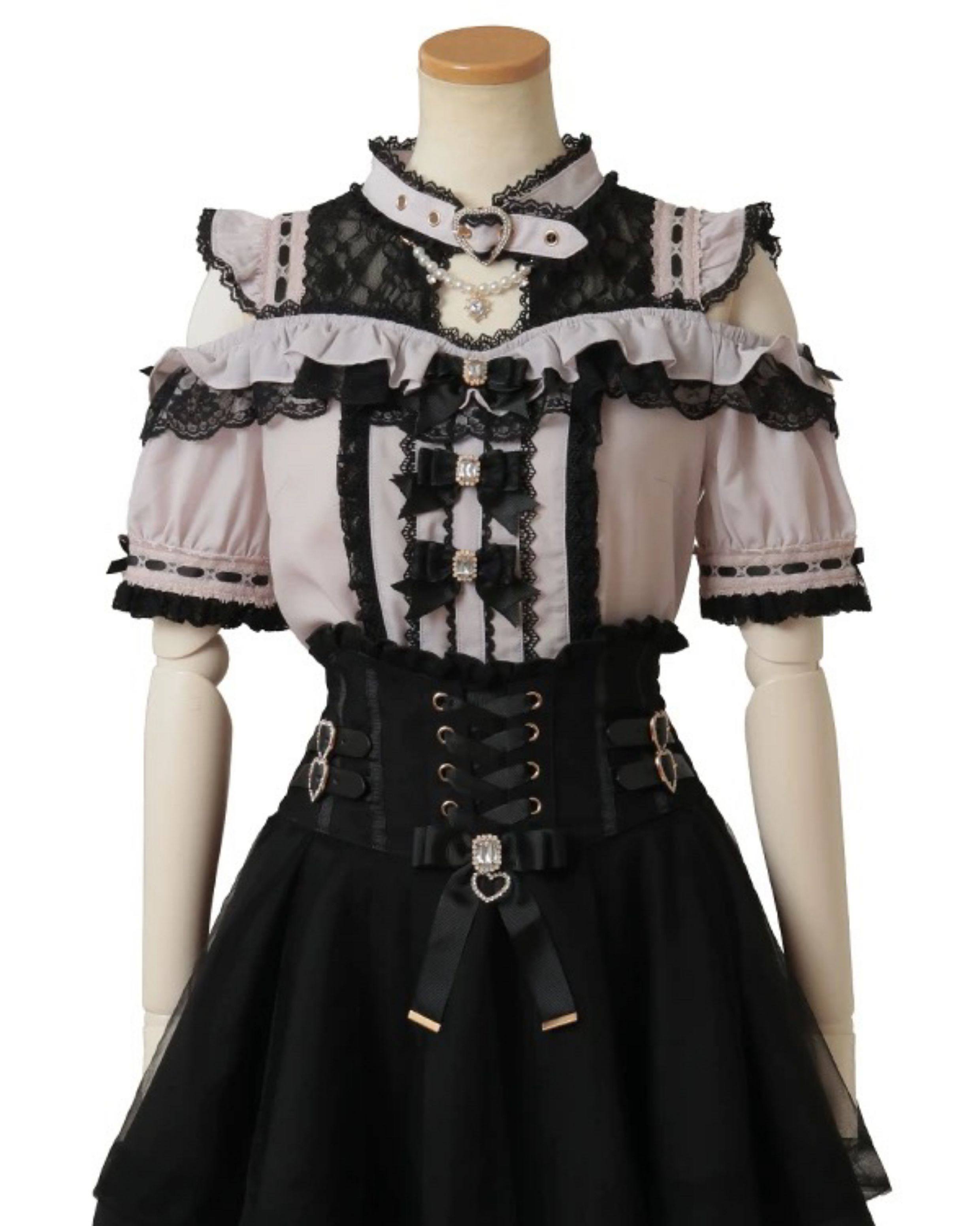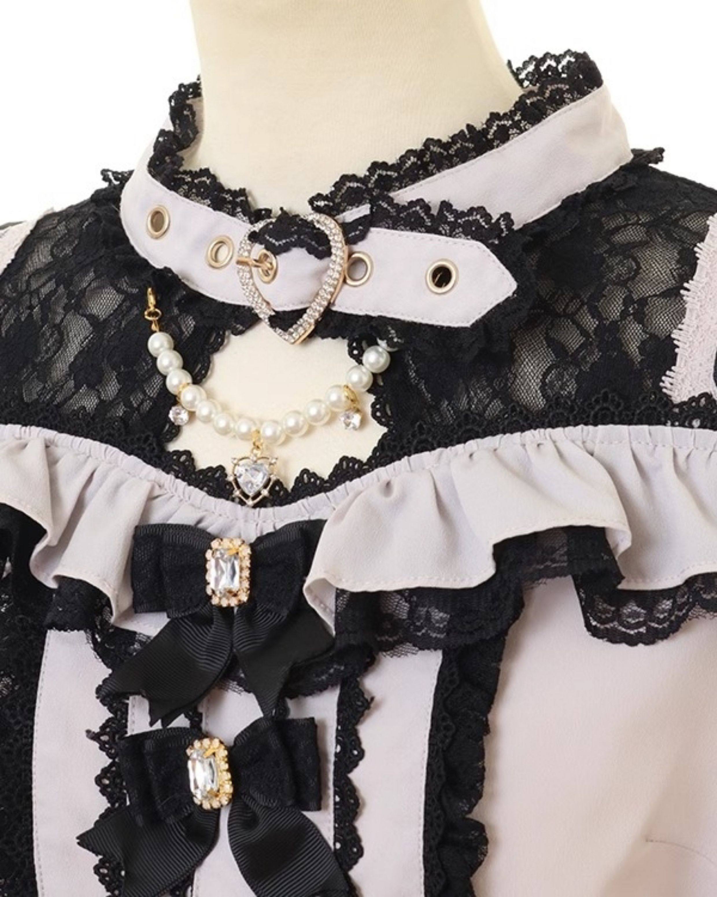 日系量産型顯高顯瘦顯白項圈領露肩蕾絲甜美蝴蝶結重工學院風襯衫