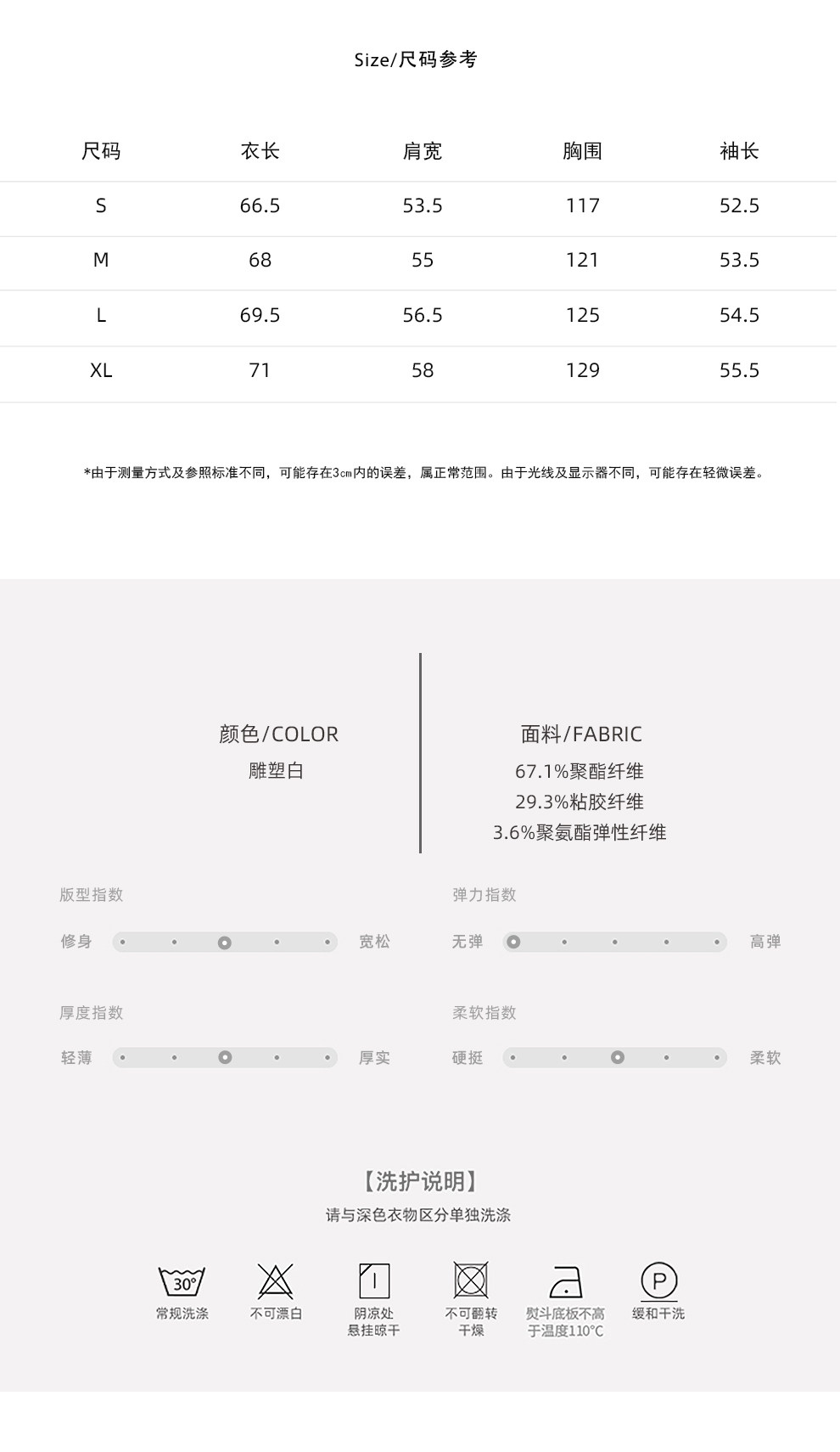| 材質成分 | 聚酯纖維67.1% 粘膠纖維(粘纖)29.3% 聚氨酯彈性纖維(氨綸)3.6% |