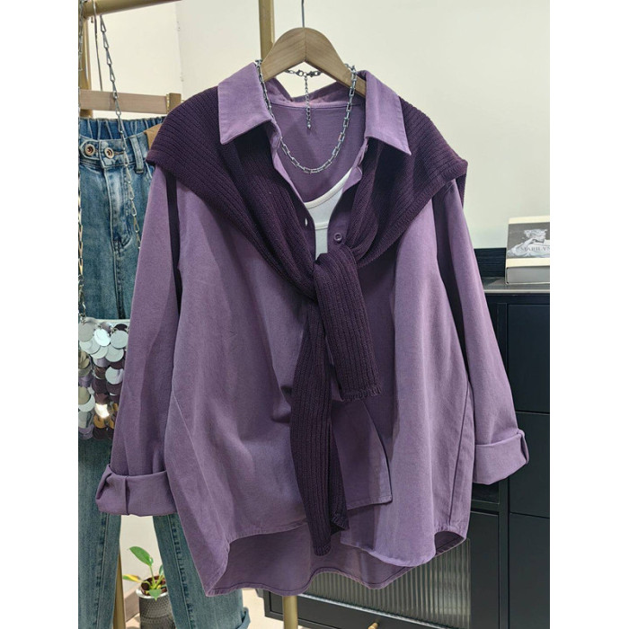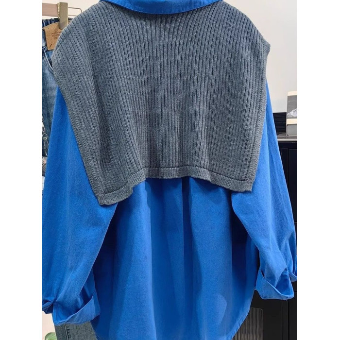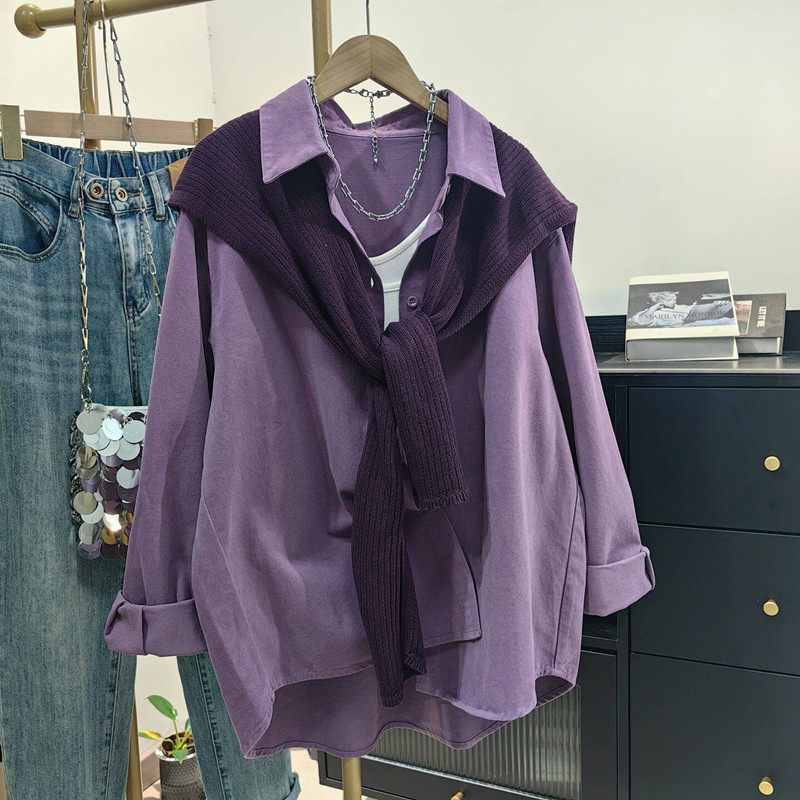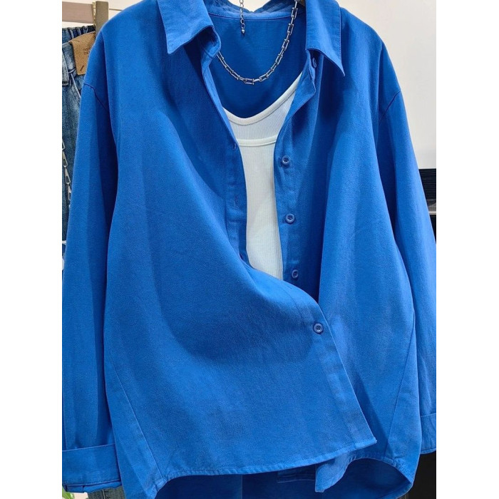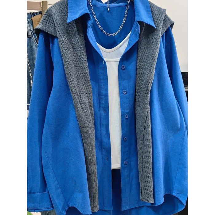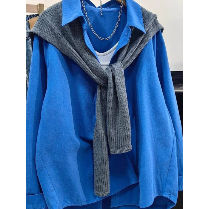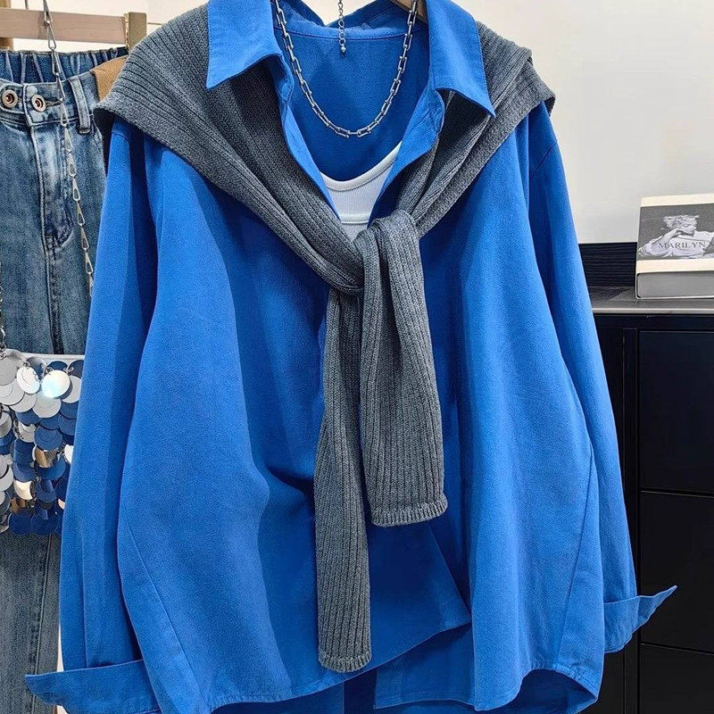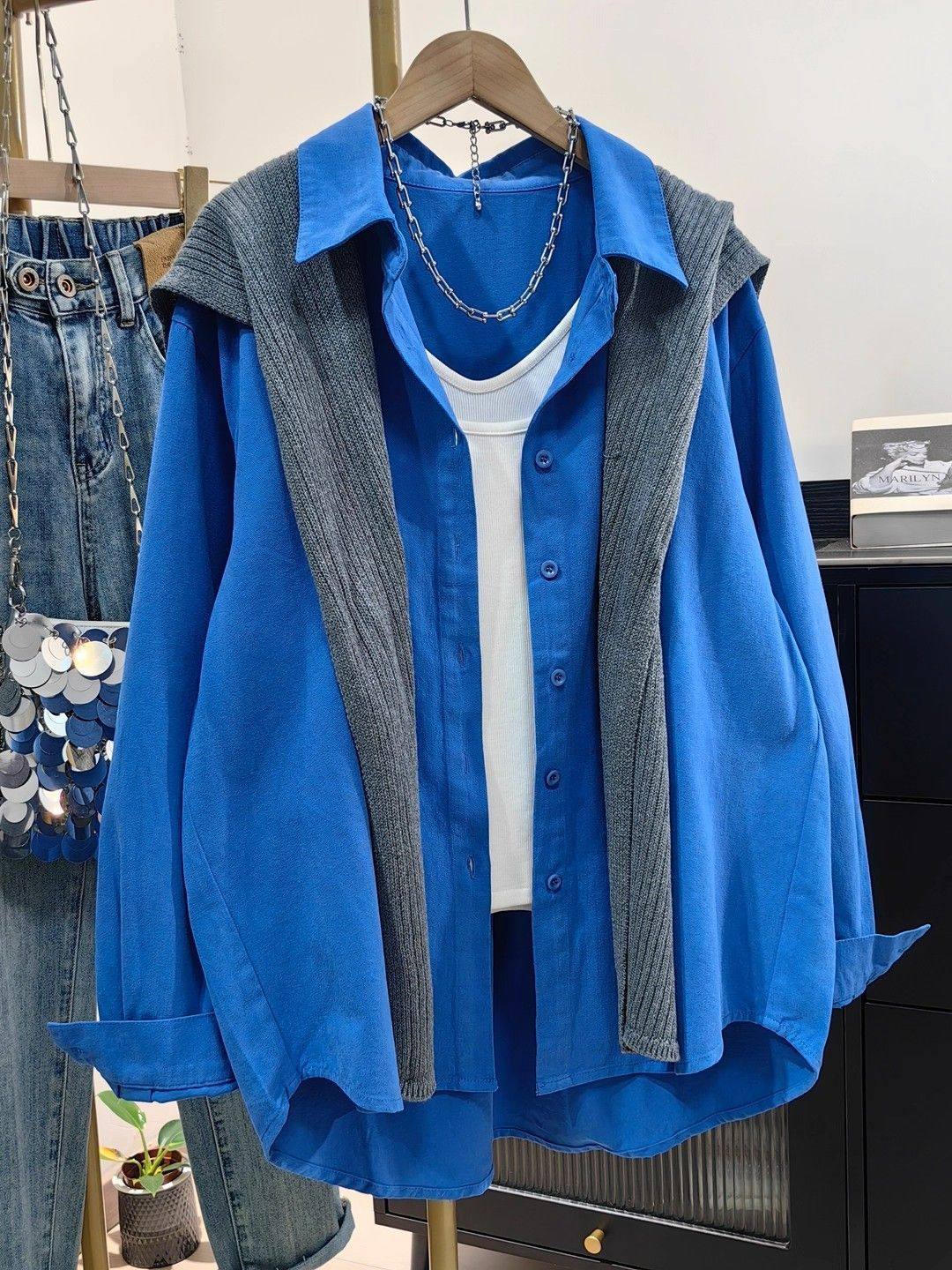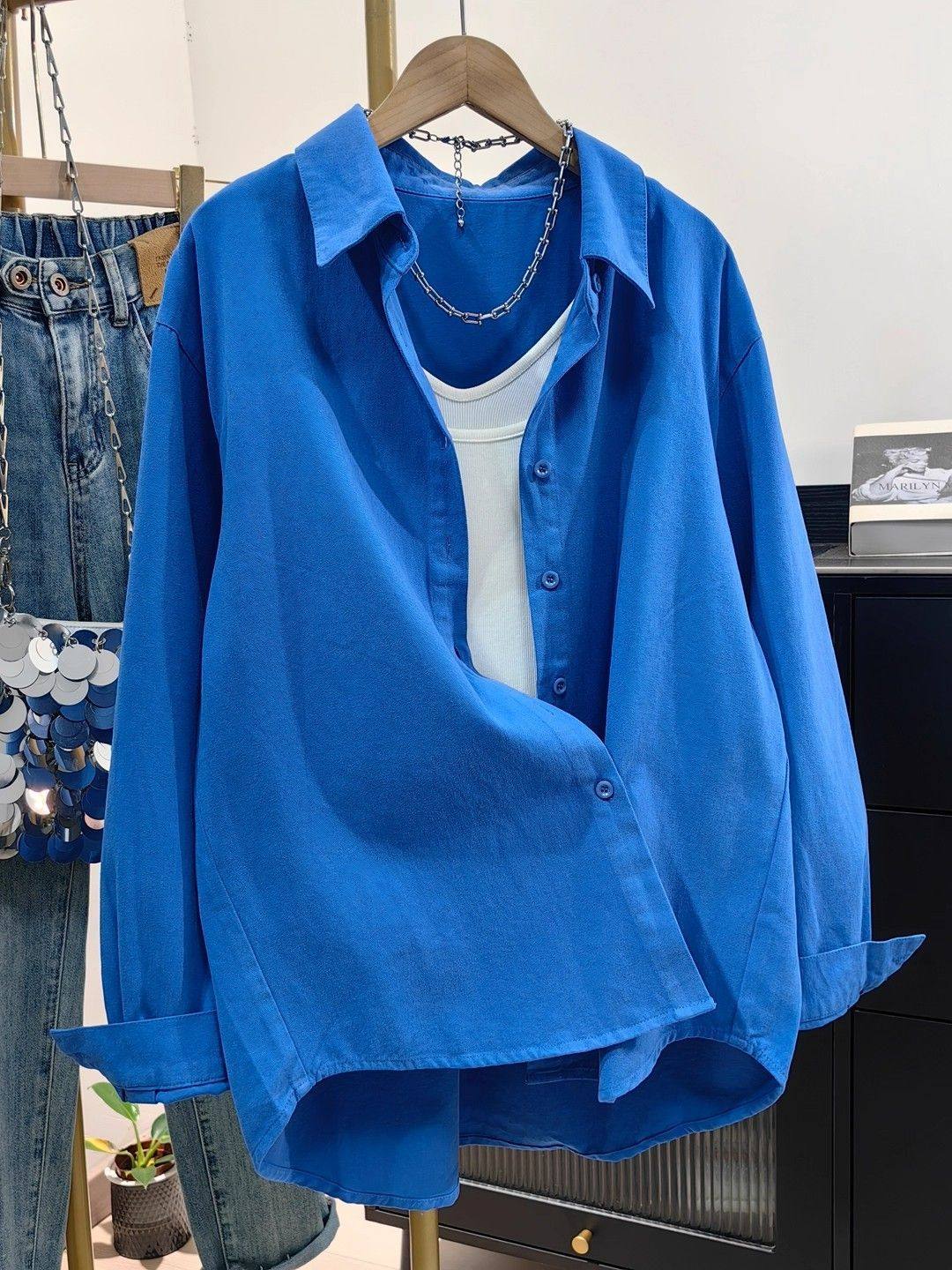 高級感輕奢減齡洋氣100%純棉藍色襯衫內搭曡穿上衣長袖襯衣薄外套