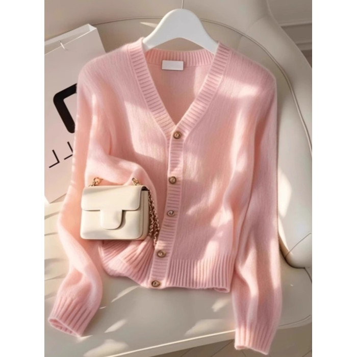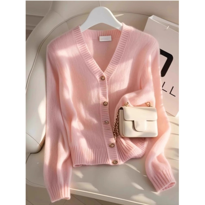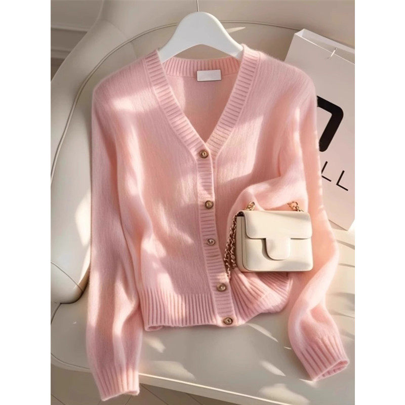 杭州四季青女裝廣州十三行粉色V領針織開衫秋冬季超好看毛衣外套