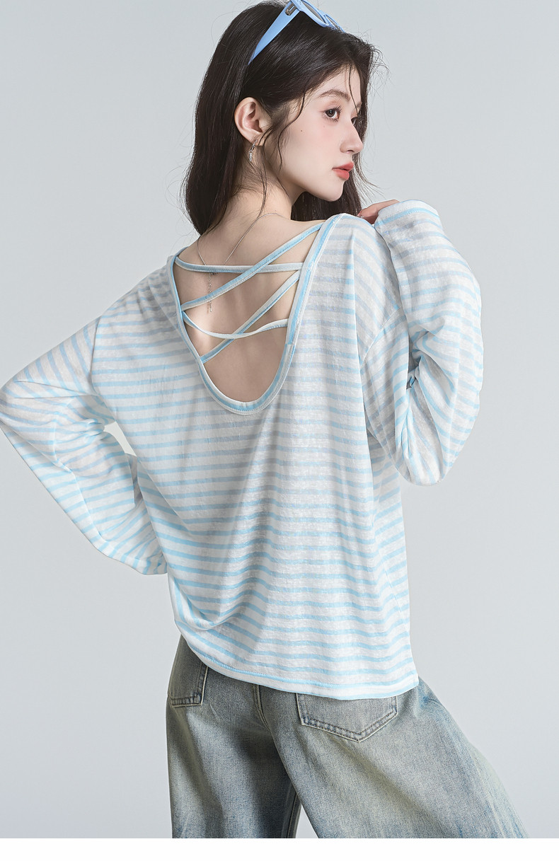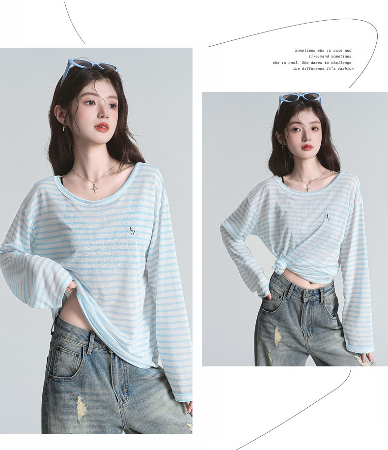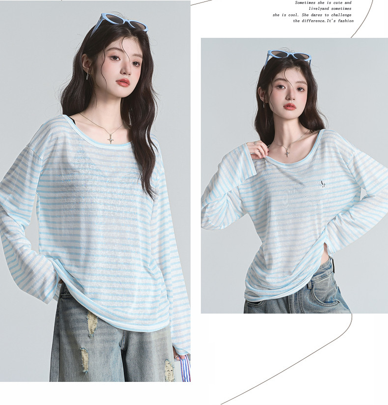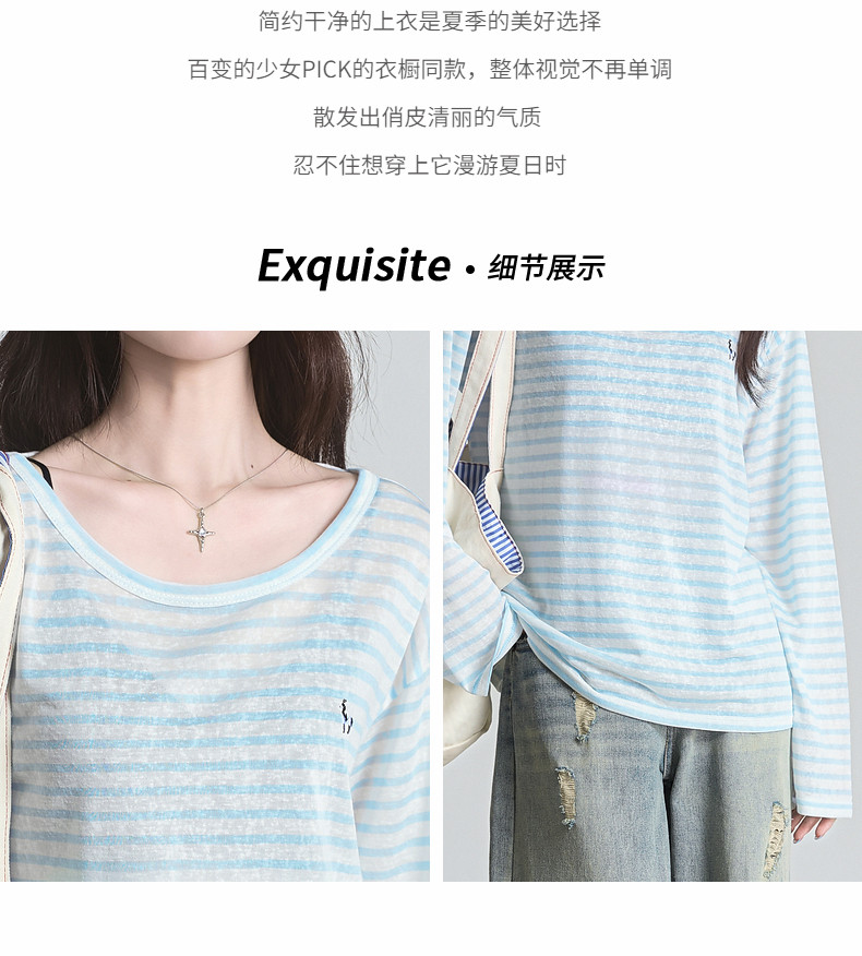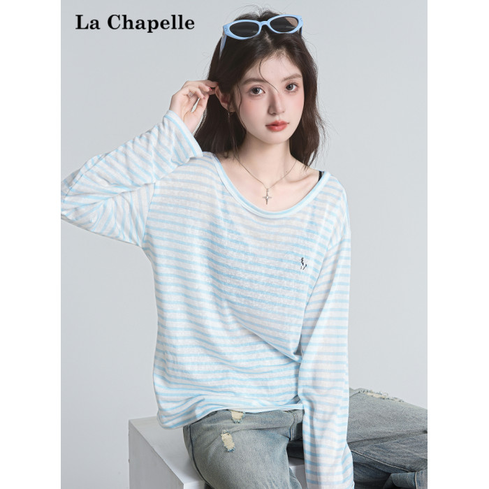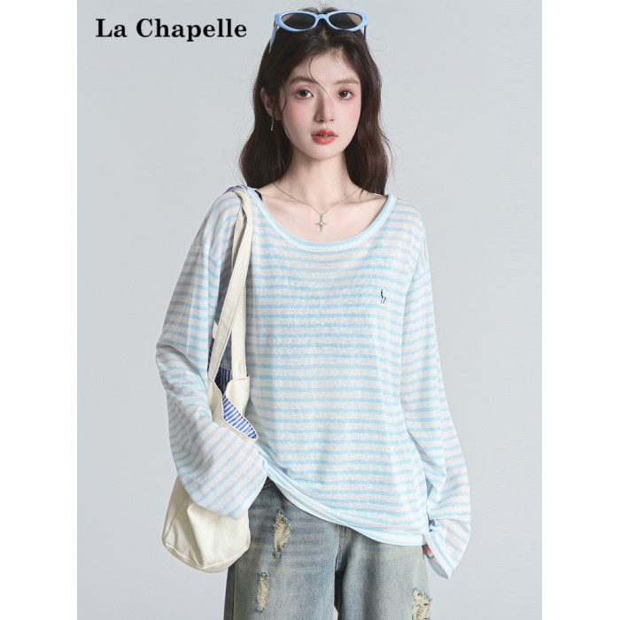 拉夏貝爾藍色條紋防曬罩衫t恤女夏季韓系慵懶長袖巨好看早秋上衣
