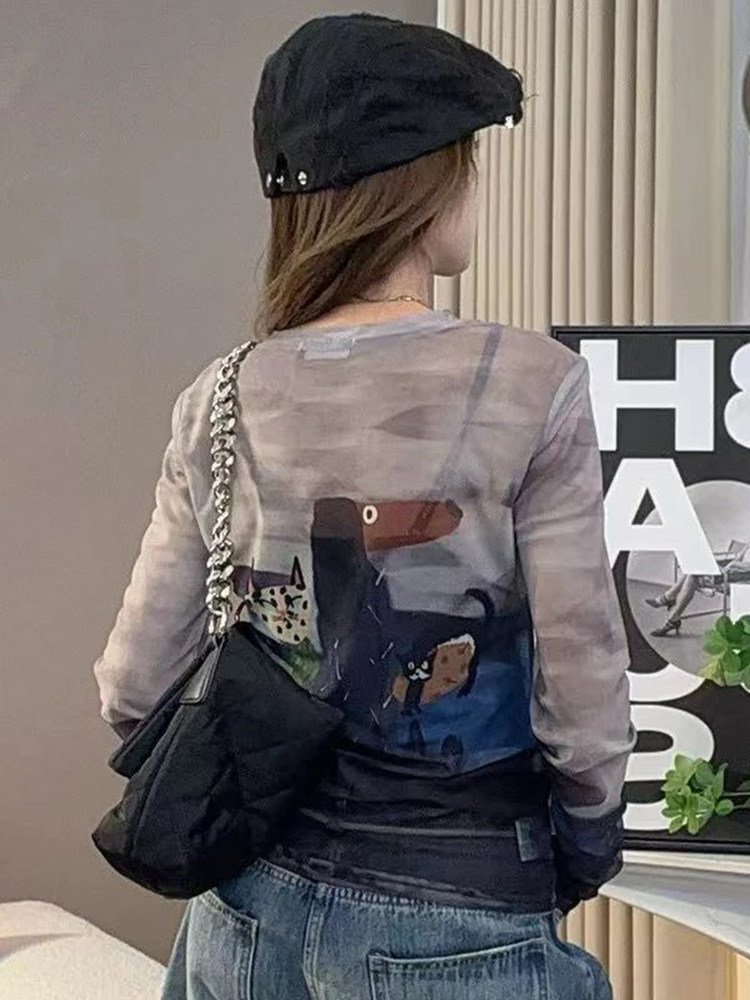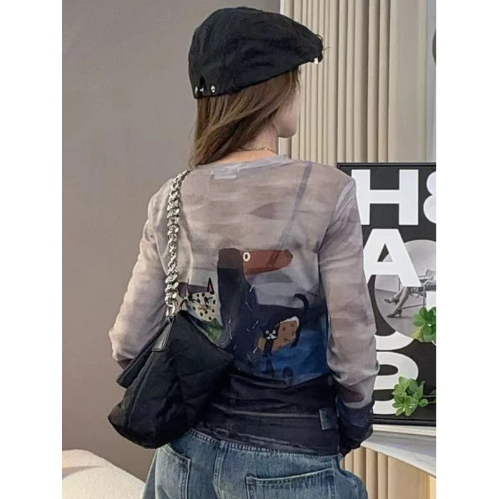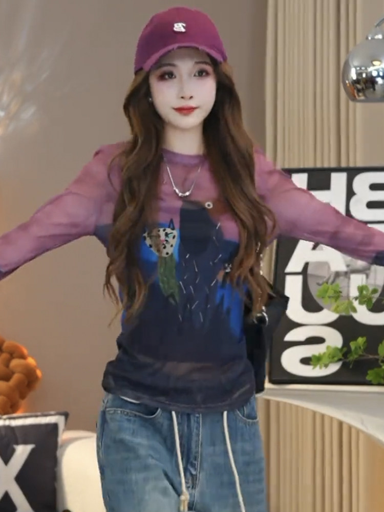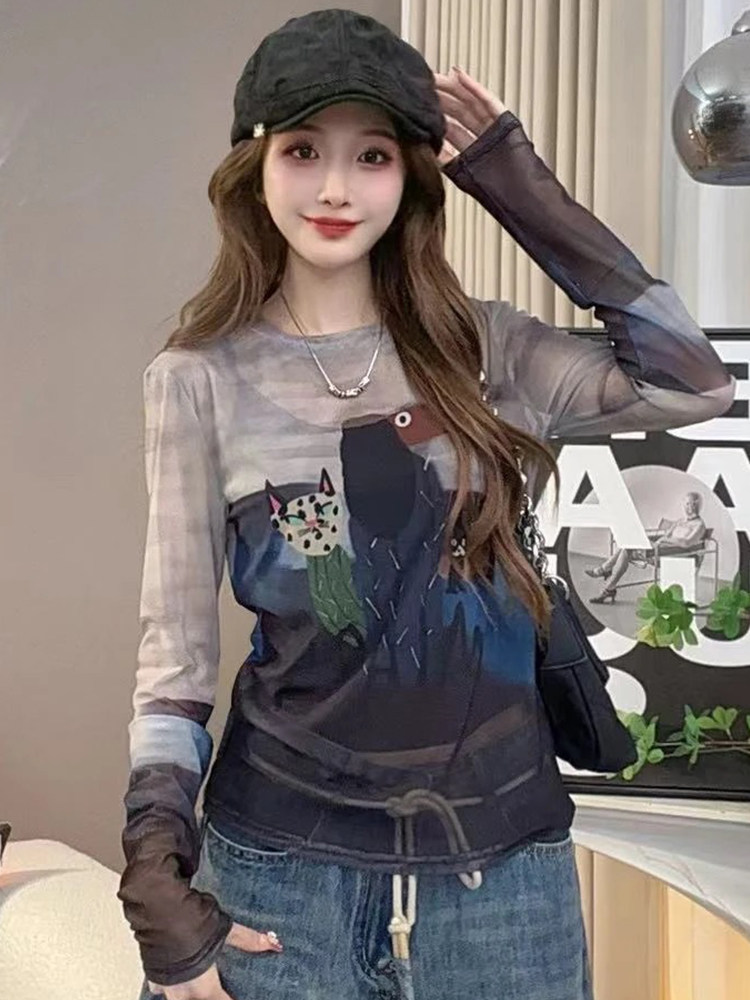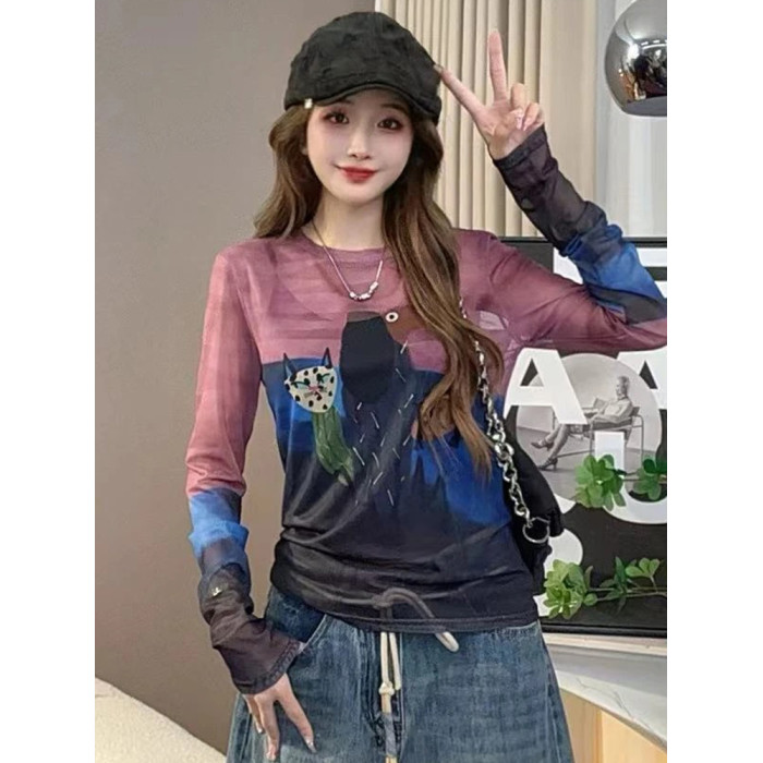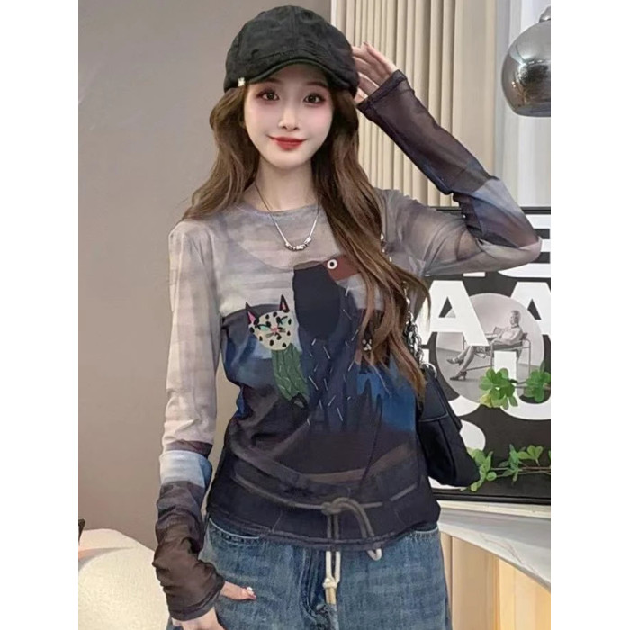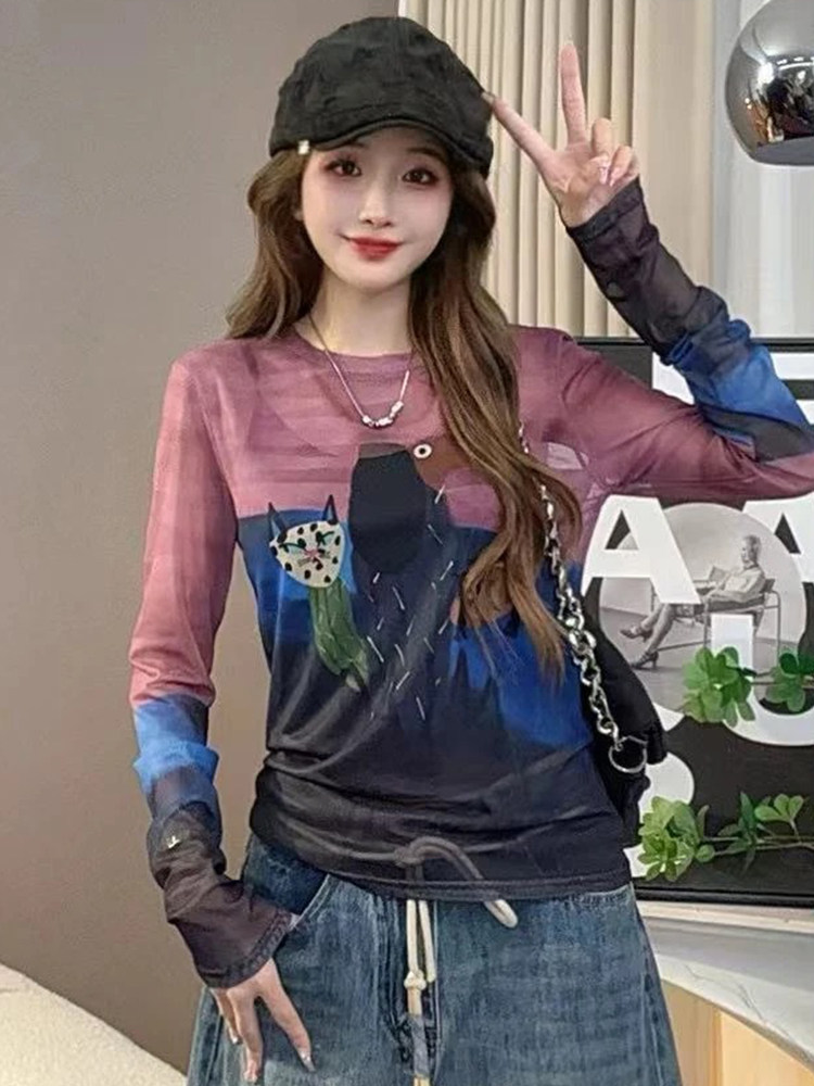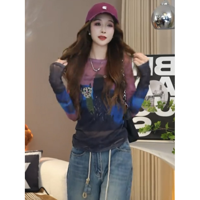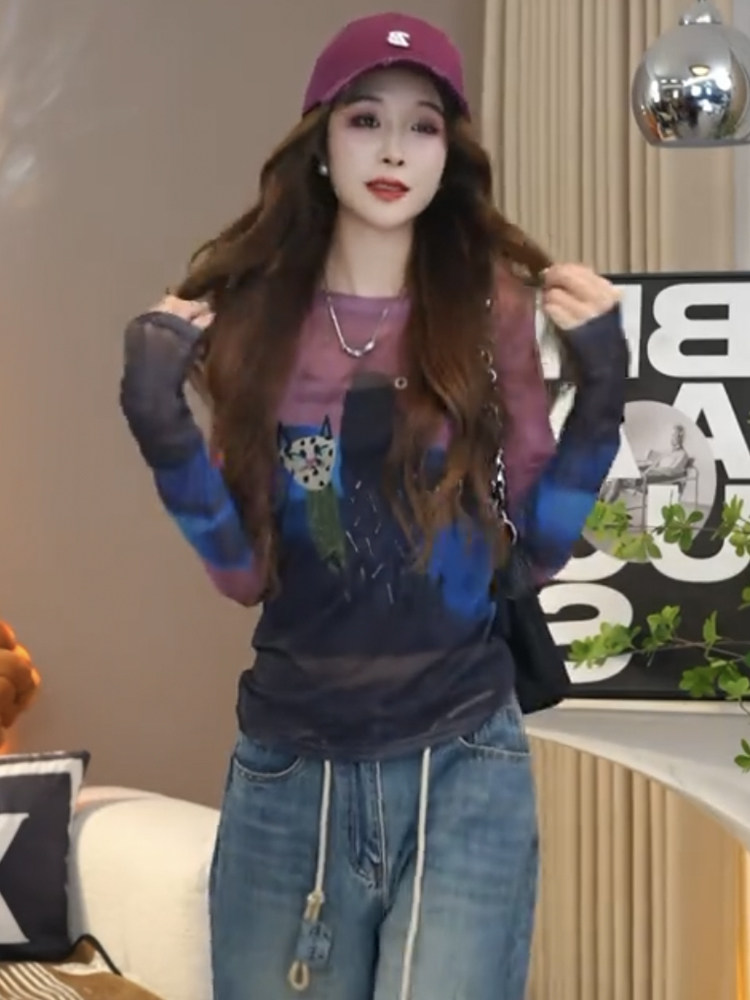 歐貨圓領紥染卡通印花長袖T恤女2025夏季新款修身顯瘦打底衫上衣