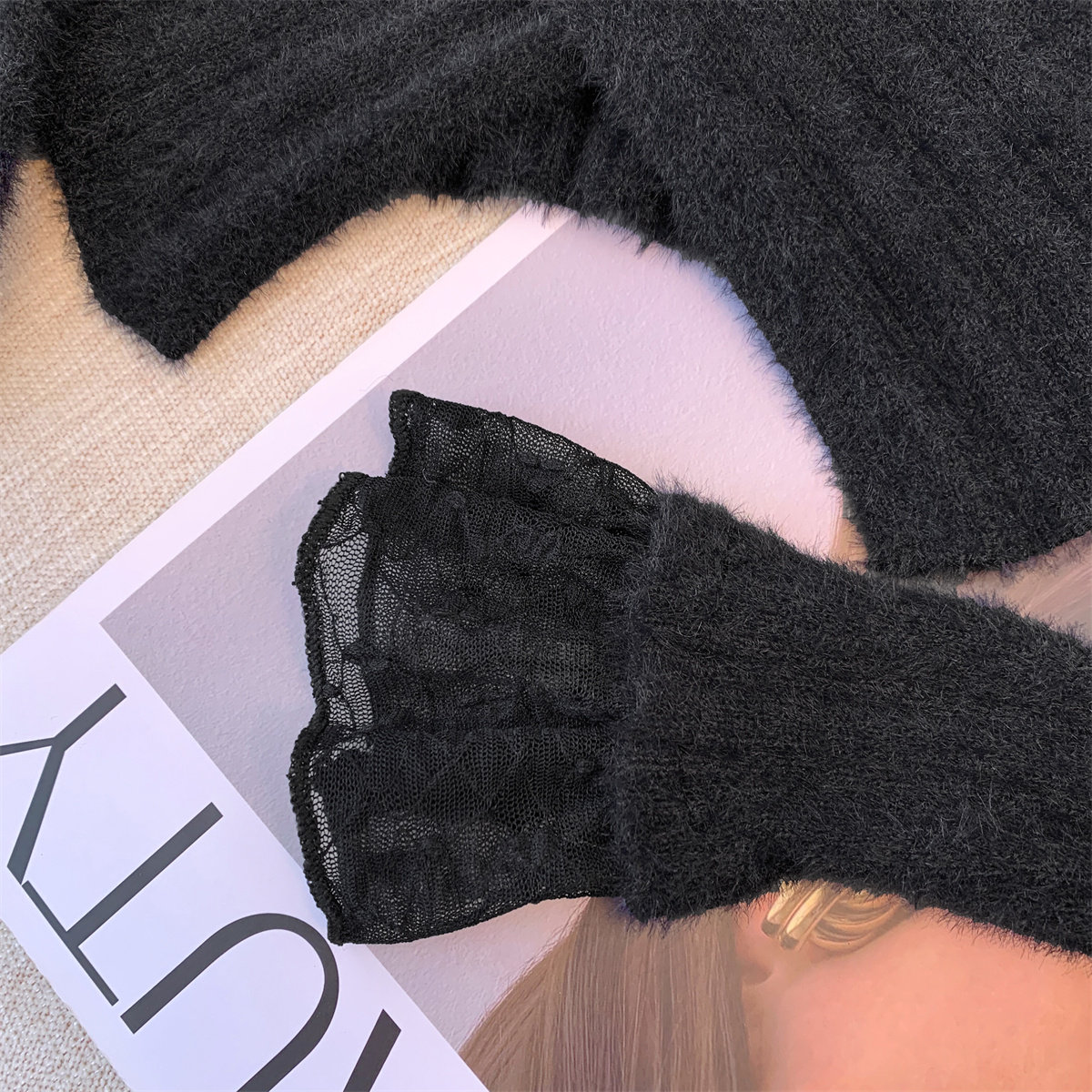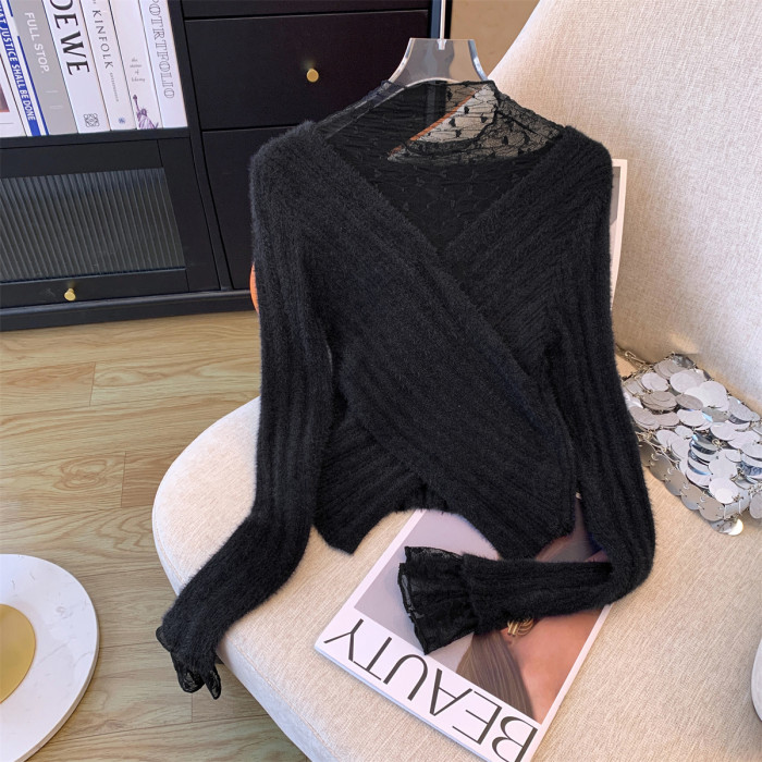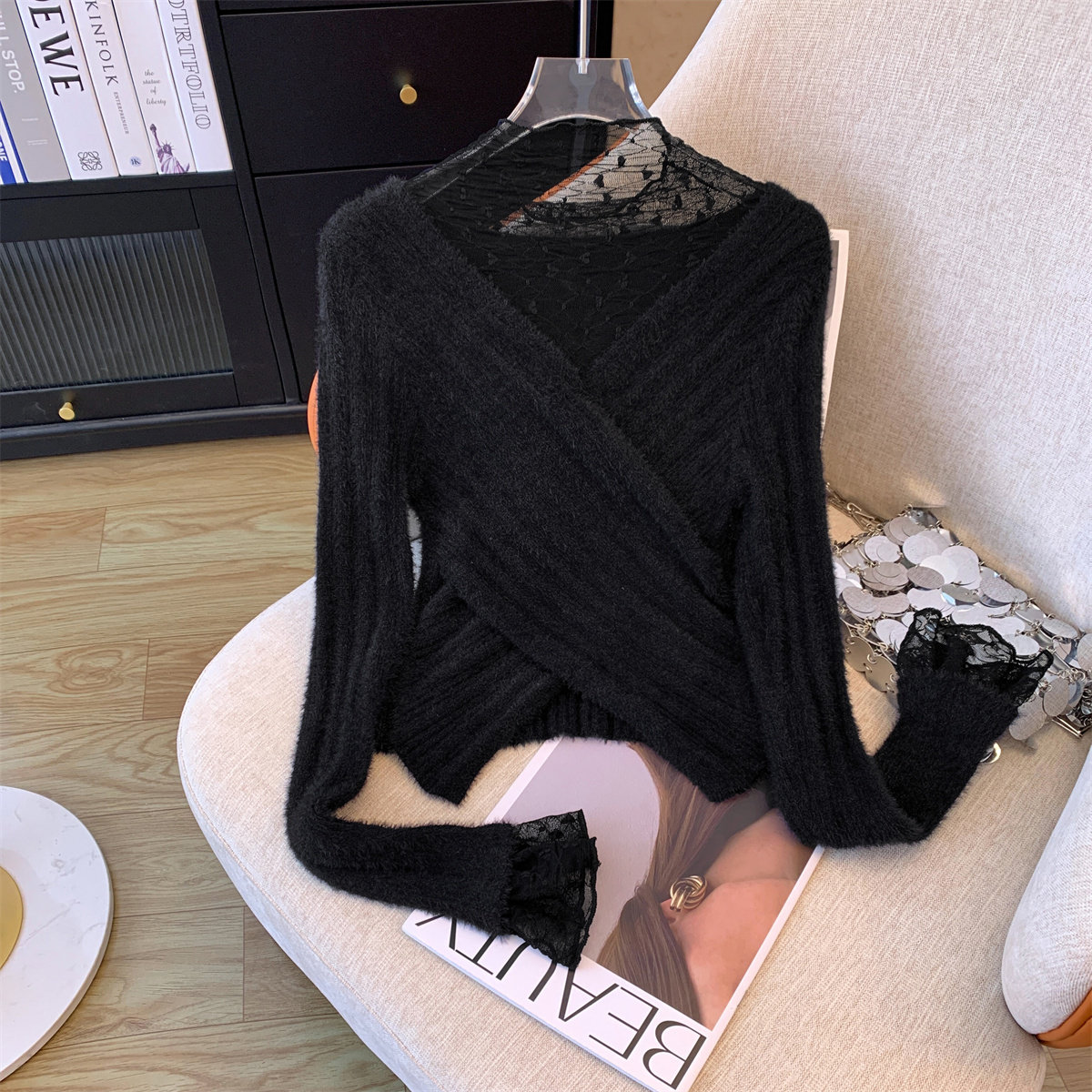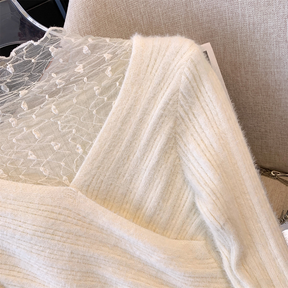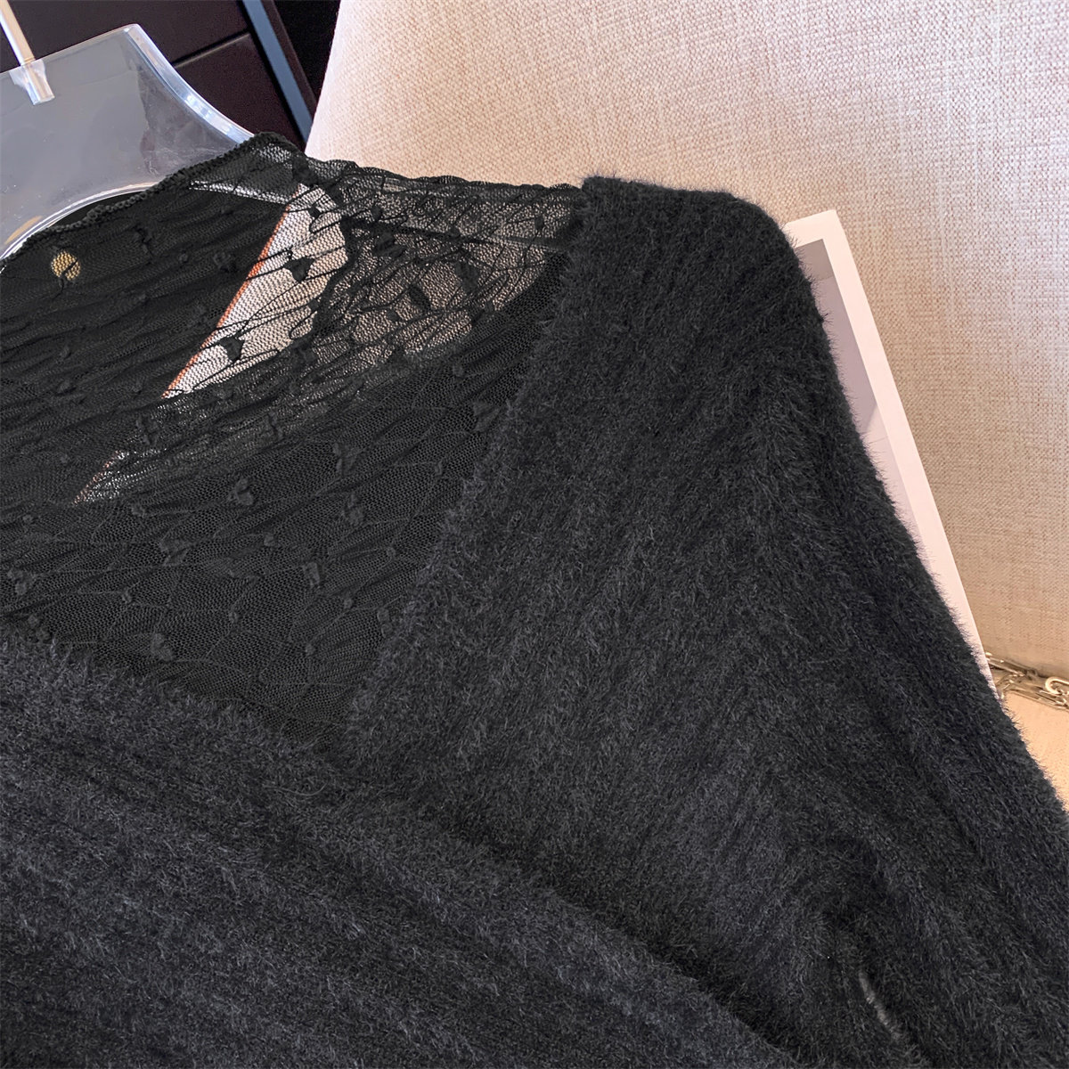 專櫃撤廻剪標假兩件長袖拼接蕾絲針織衫女秋冬別致喇叭袖短款上衣