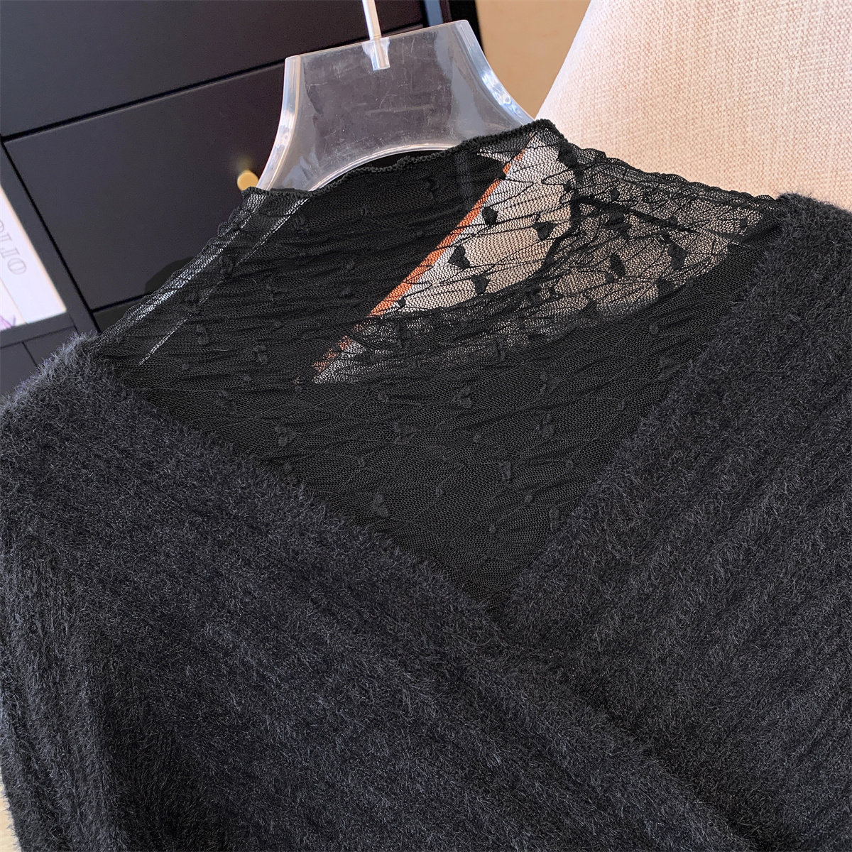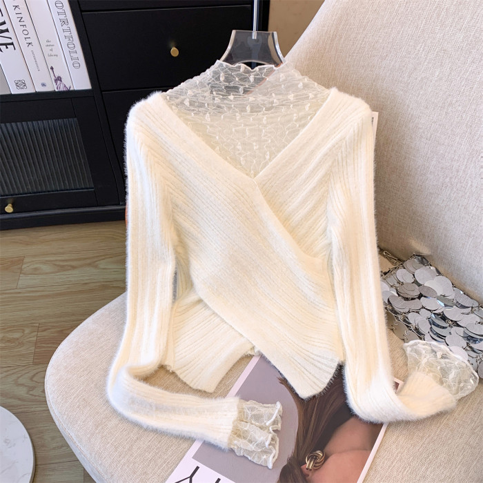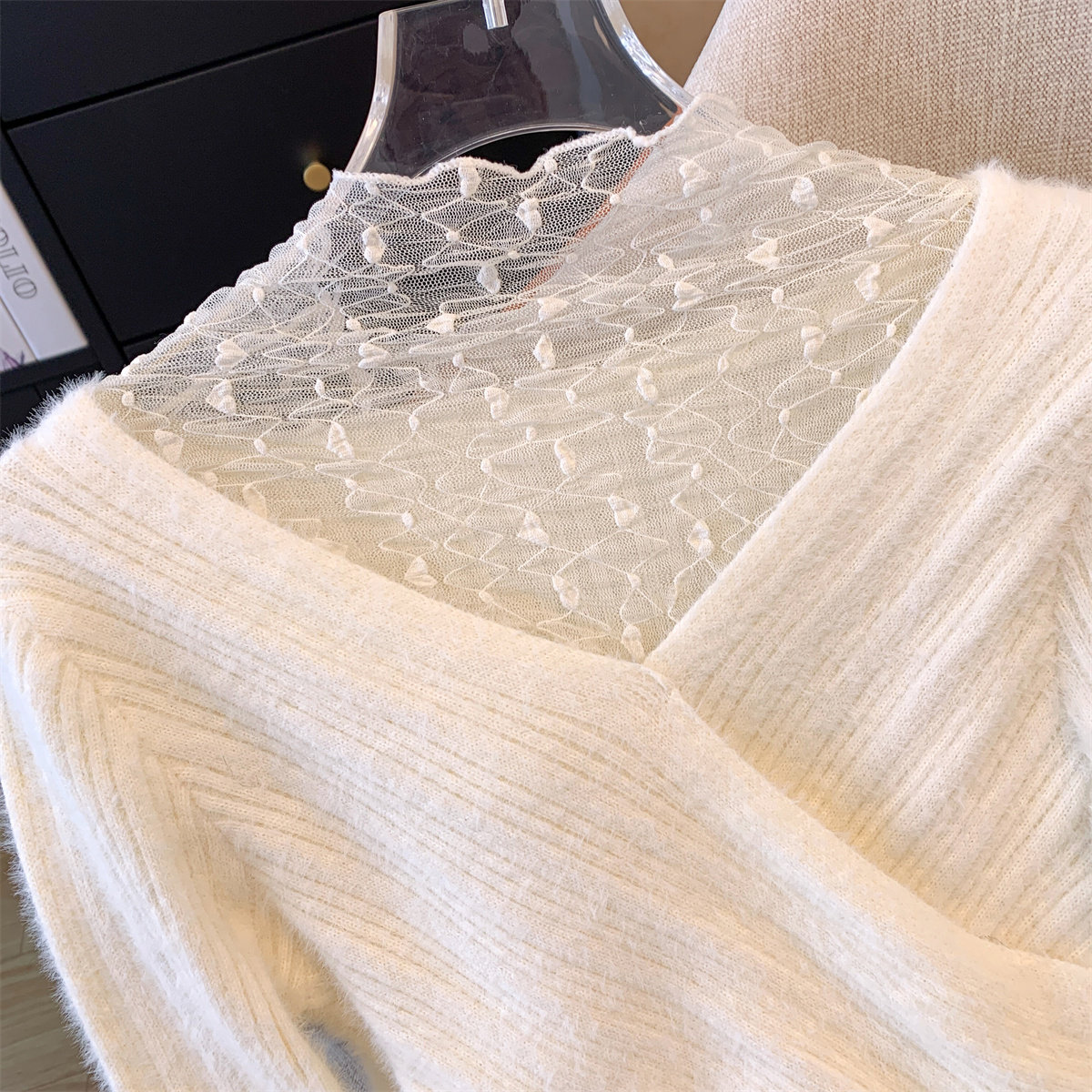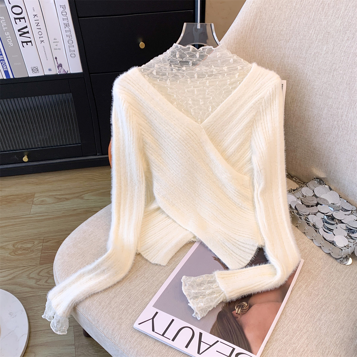 專櫃撤廻剪標假兩件長袖拼接蕾絲針織衫女秋冬別致喇叭袖短款上衣
