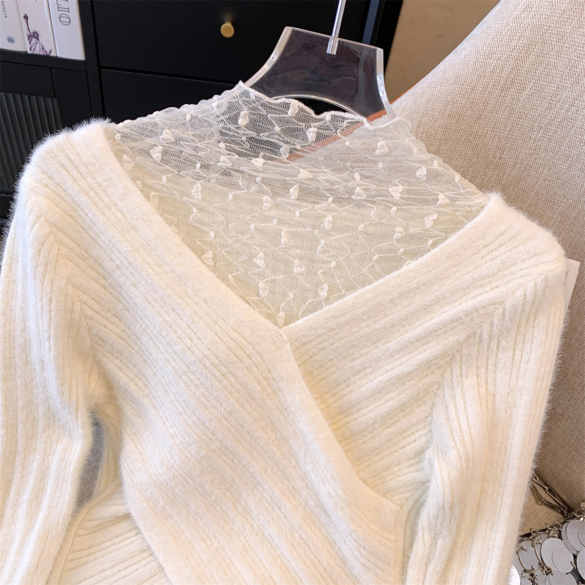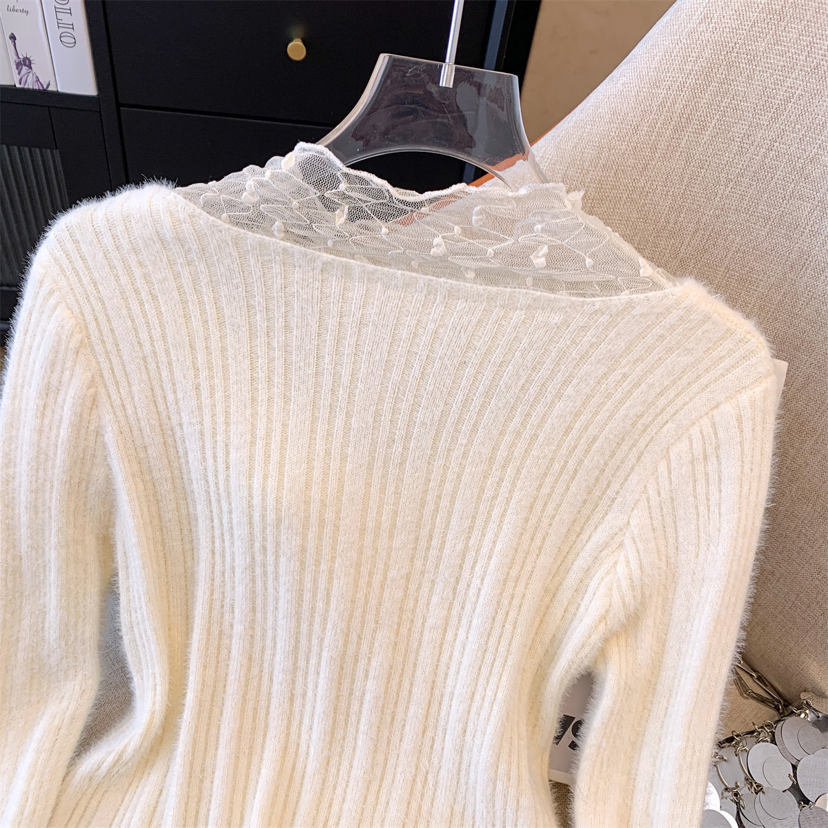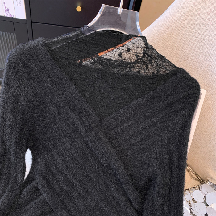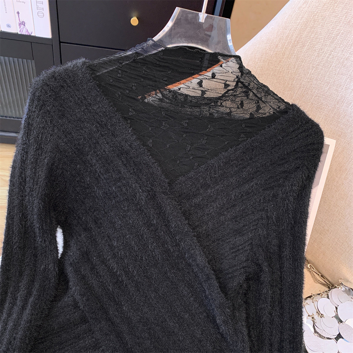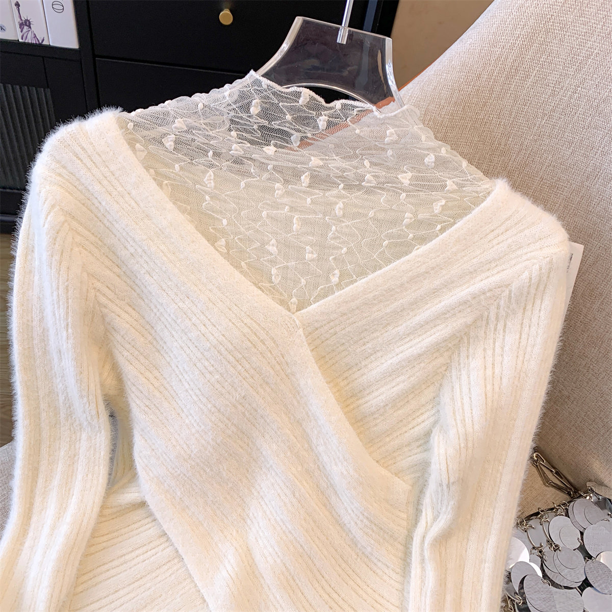 專櫃撤廻剪標假兩件長袖拼接蕾絲針織衫女秋冬別致喇叭袖短款上衣